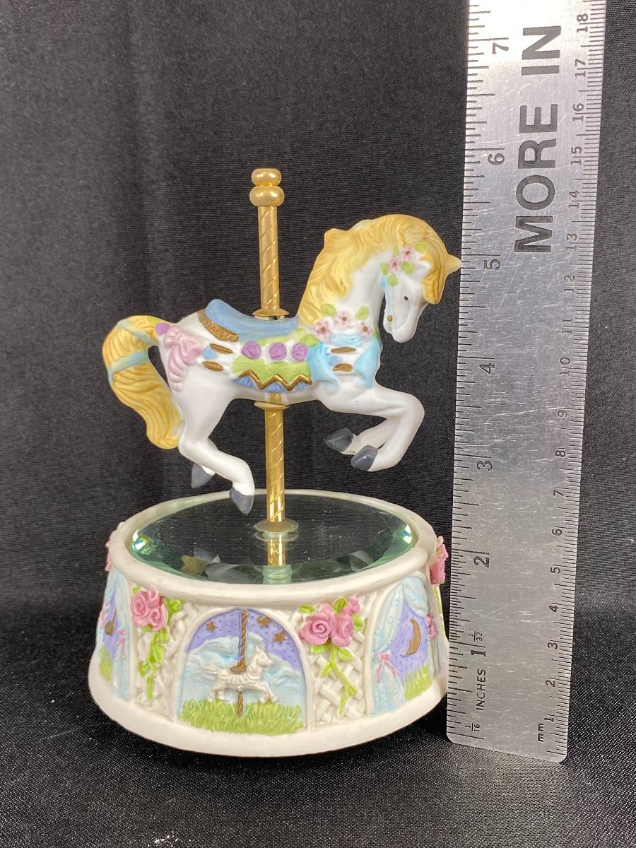 Small carousel horse music box. Works. Music box turns, horse does not move up and down. About 6" size. Good condition.