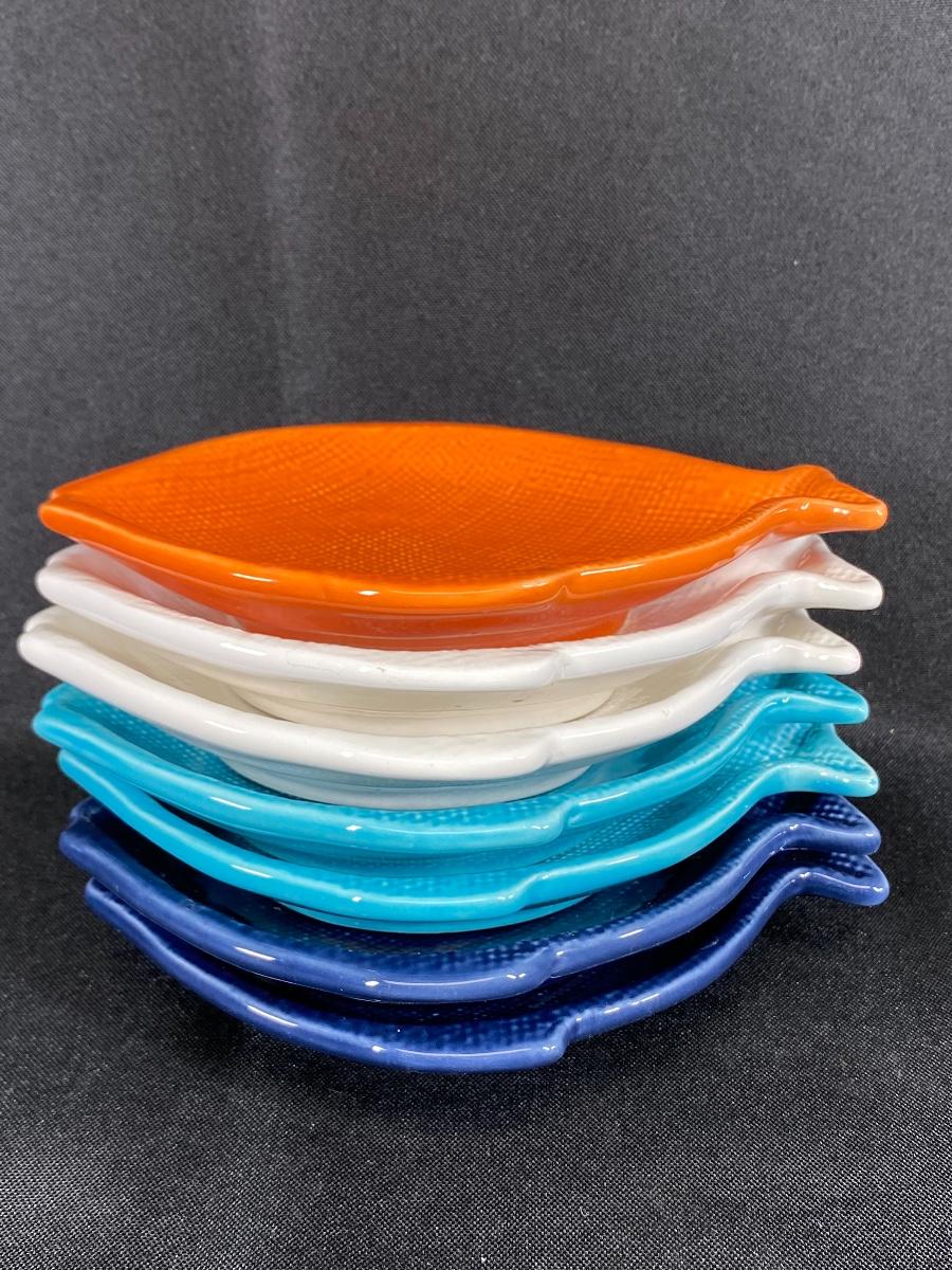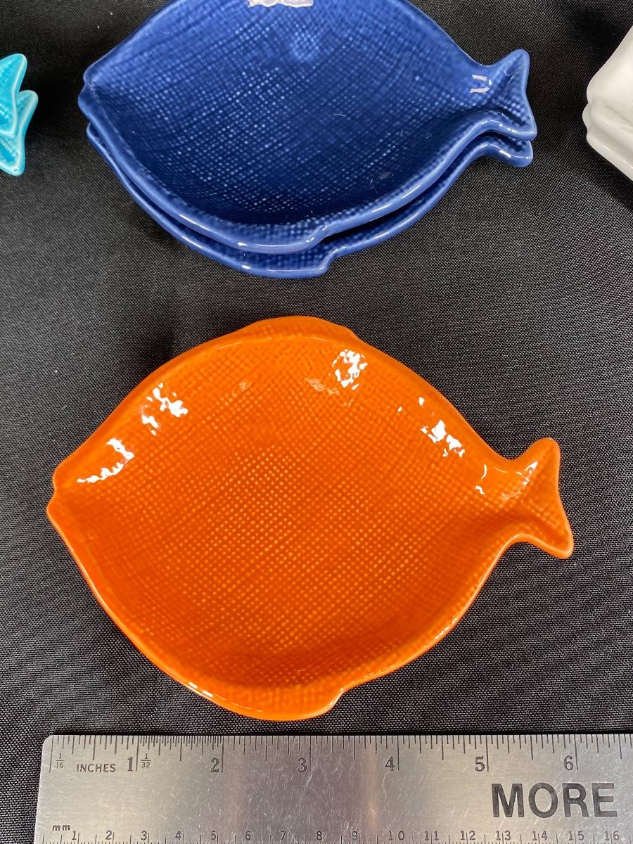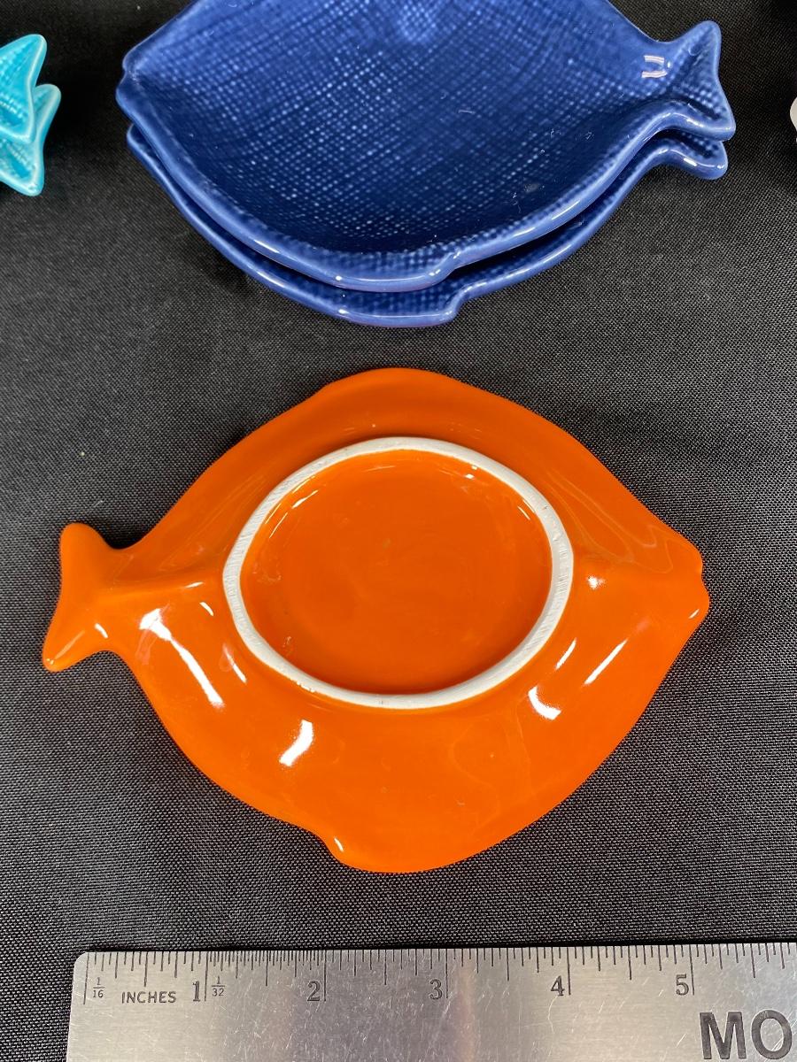 Colorful set of 7 fish shaped dishes. Shallow plates, great for condiments, niuts, relish, or as trinket dishes. All sorts of possibilities. Good condition. About 6" length.