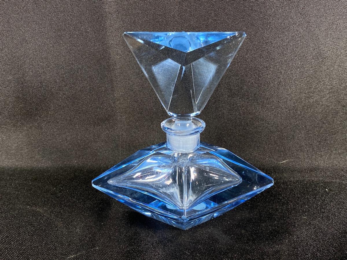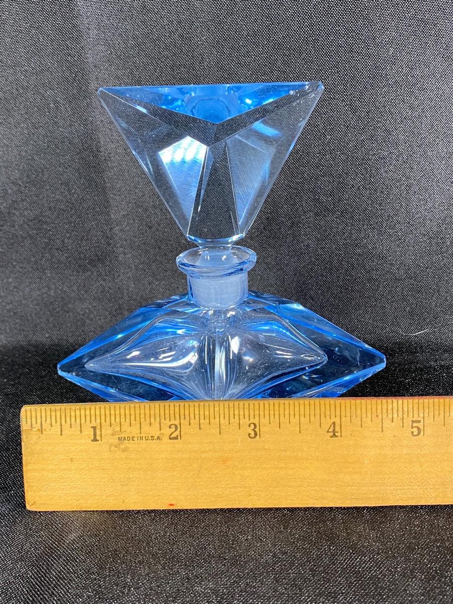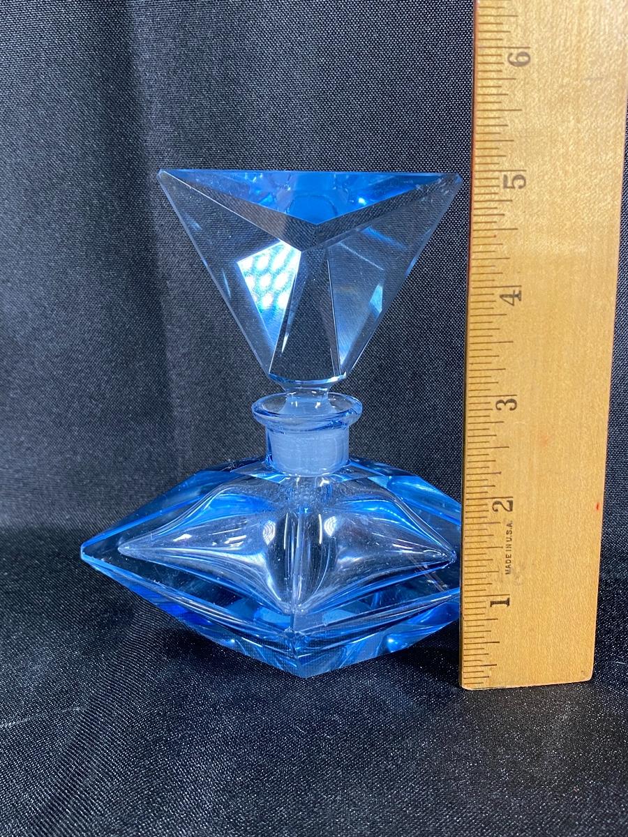 Beautiful bright blue glass perfume bottle. Prism cut. 5" tall. There is a chip in the edge of bottle opening, but not really noticeable when stopper is in. Original sticker on the bottom, but can not read it.