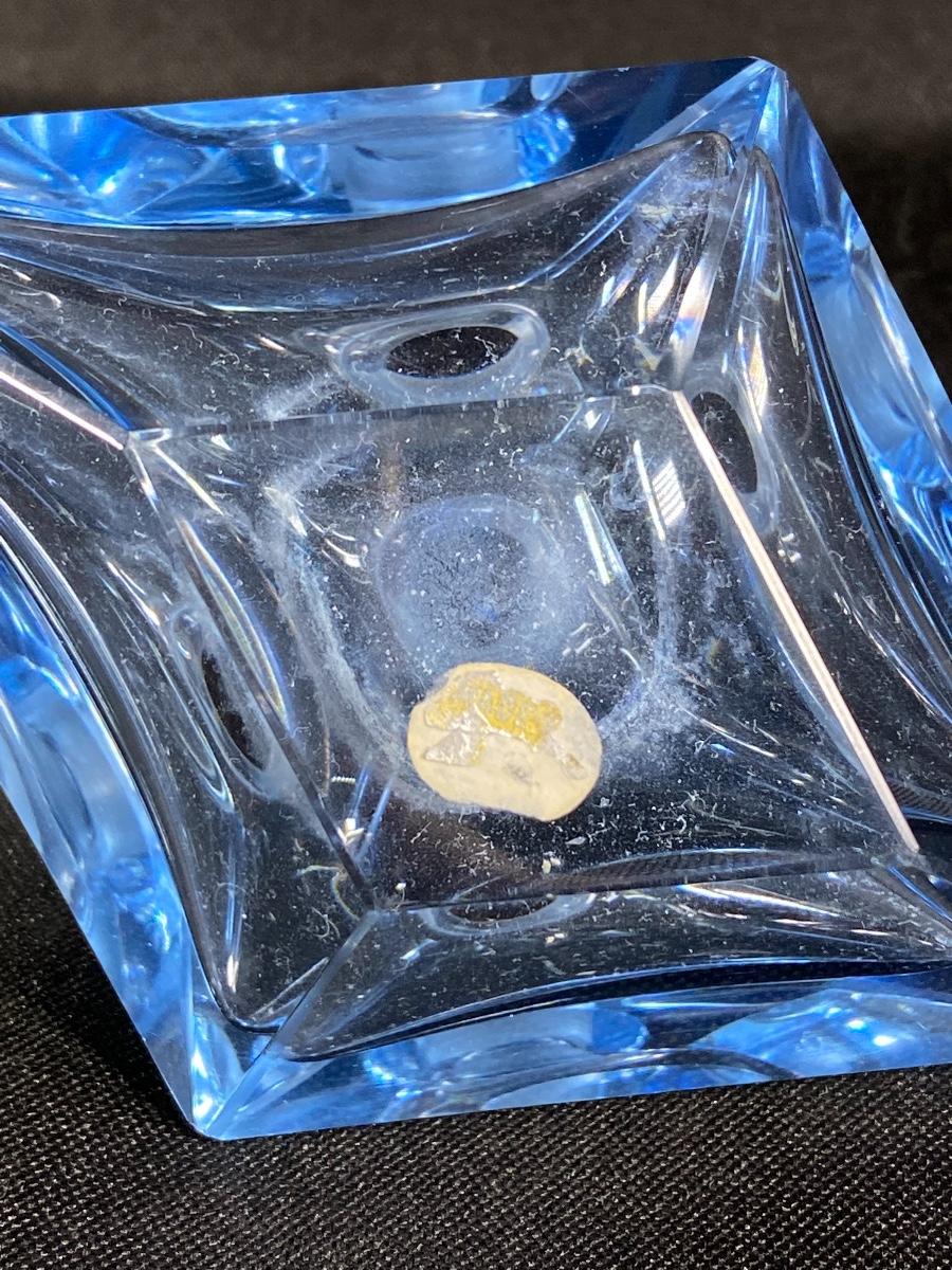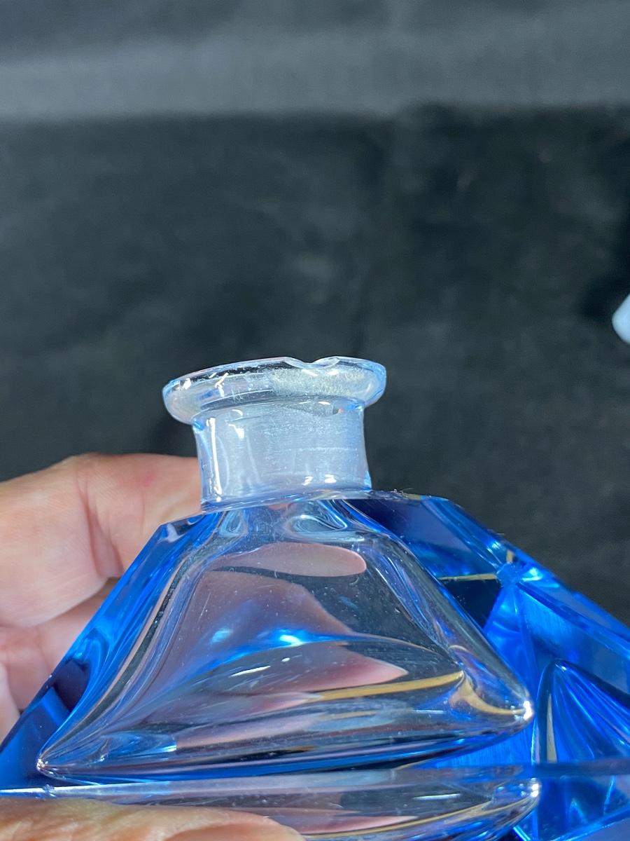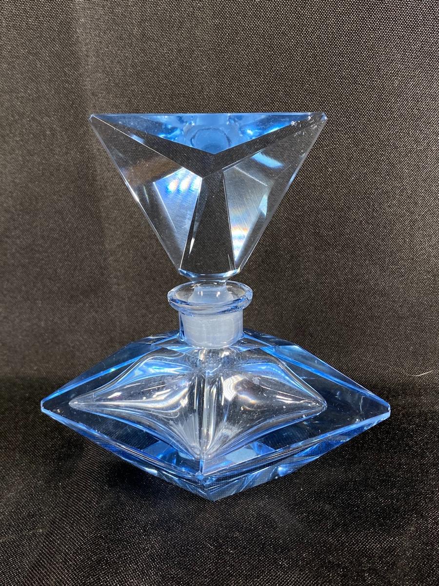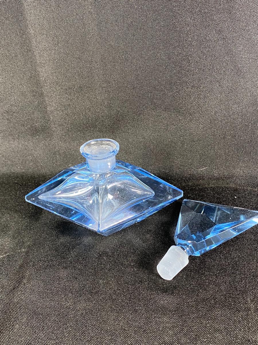 Beautiful bright blue glass perfume bottle. Prism cut. 5" tall. There is a chip in the edge of bottle opening, but not really noticeable when stopper is in. Original sticker on the bottom, but can not read it.