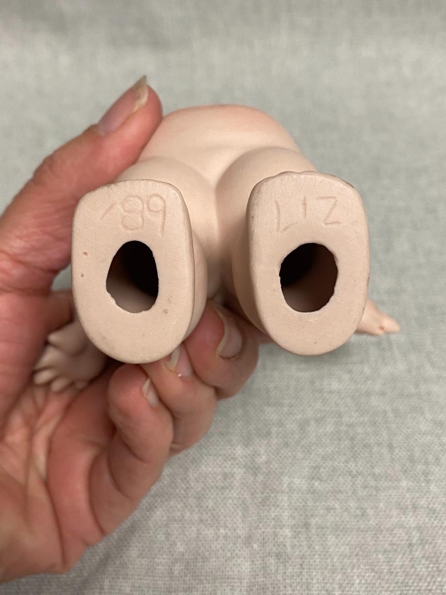 Adorable Kewpie style bisque doll. Jointed at the shoulders. Blue side eyes, tiny wings on back. Artist signed on bottom of feet. About 6.5" tall, has a plastic stand to help it stand.