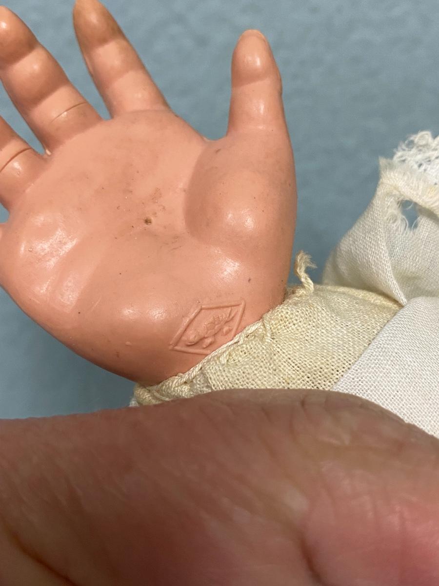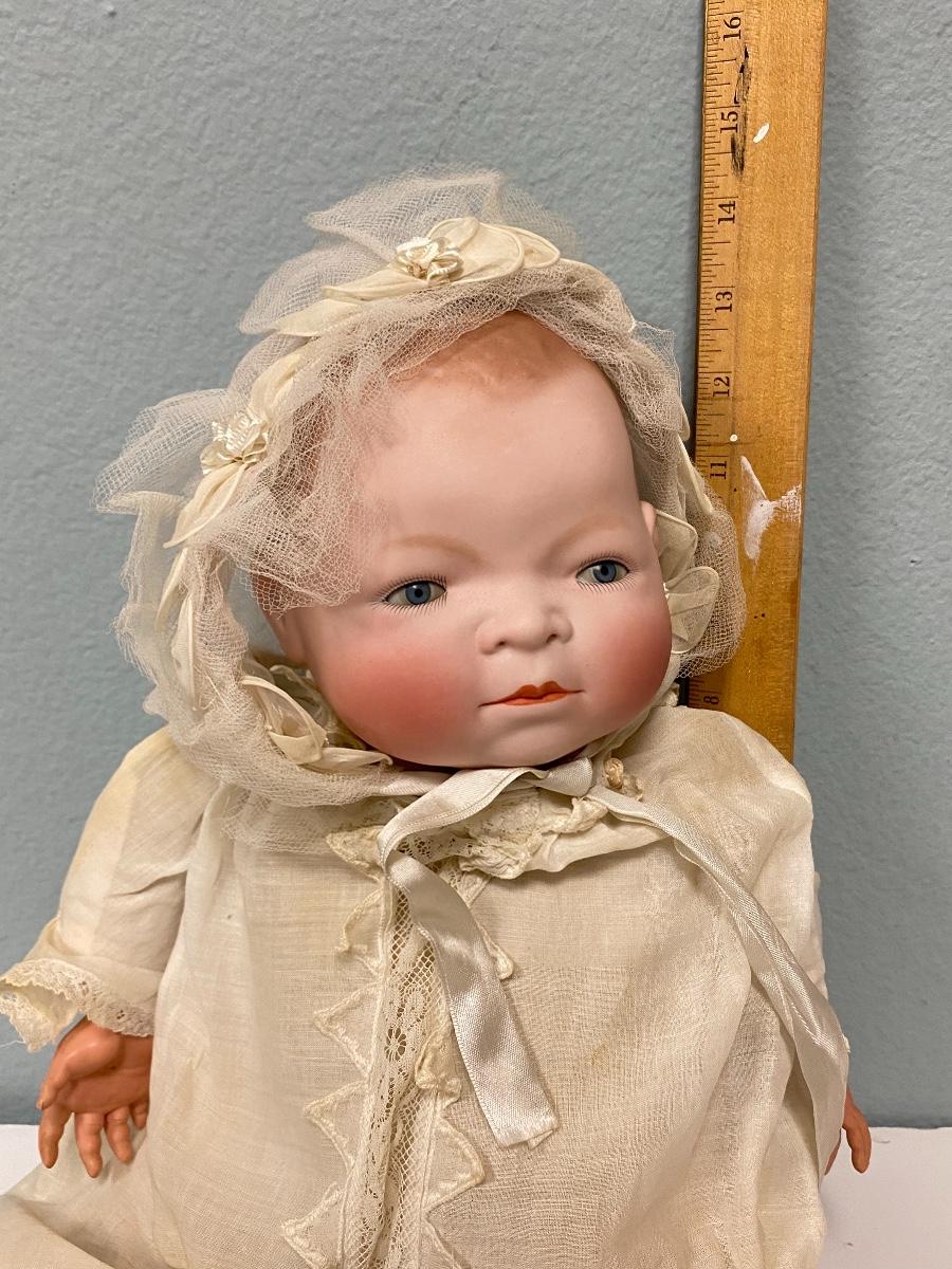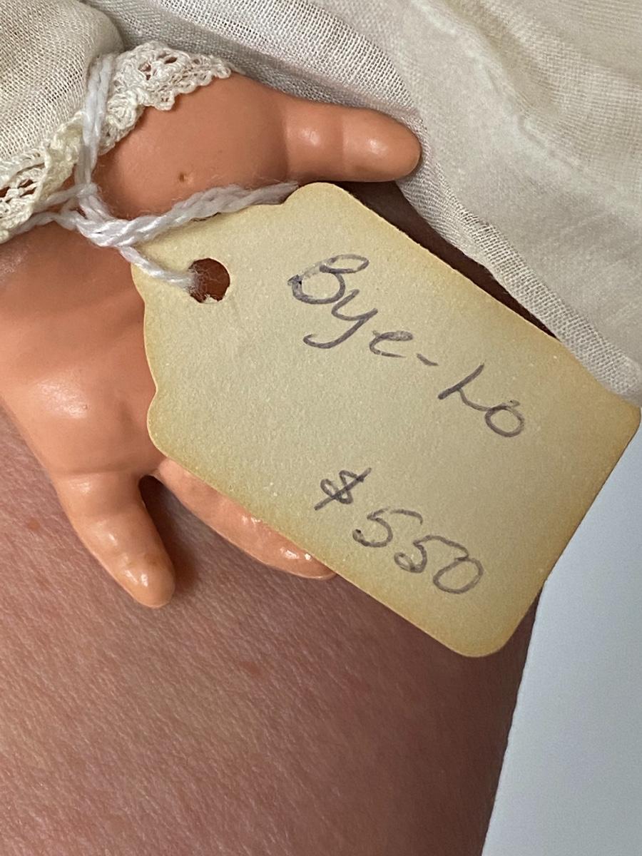 Vintage Grace Putnam Bye-Lo Baby. Bisque head with sleep eyes, painted features. Head is marked on the back. Cloth body with composite hands, arms seem small for body. There is a cryer box in the back but does not work any longer. About 18" size.
