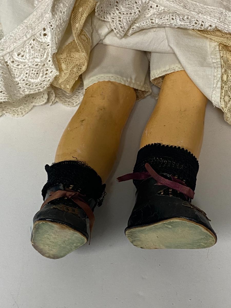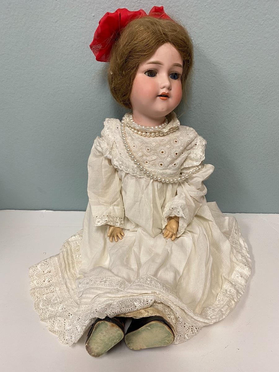 Antique Armand Marseille bisque and composite doll. About 25" size. Wig is glued in place. Head is stamped. Composite in fair condition, does have scraps and a few cracks.