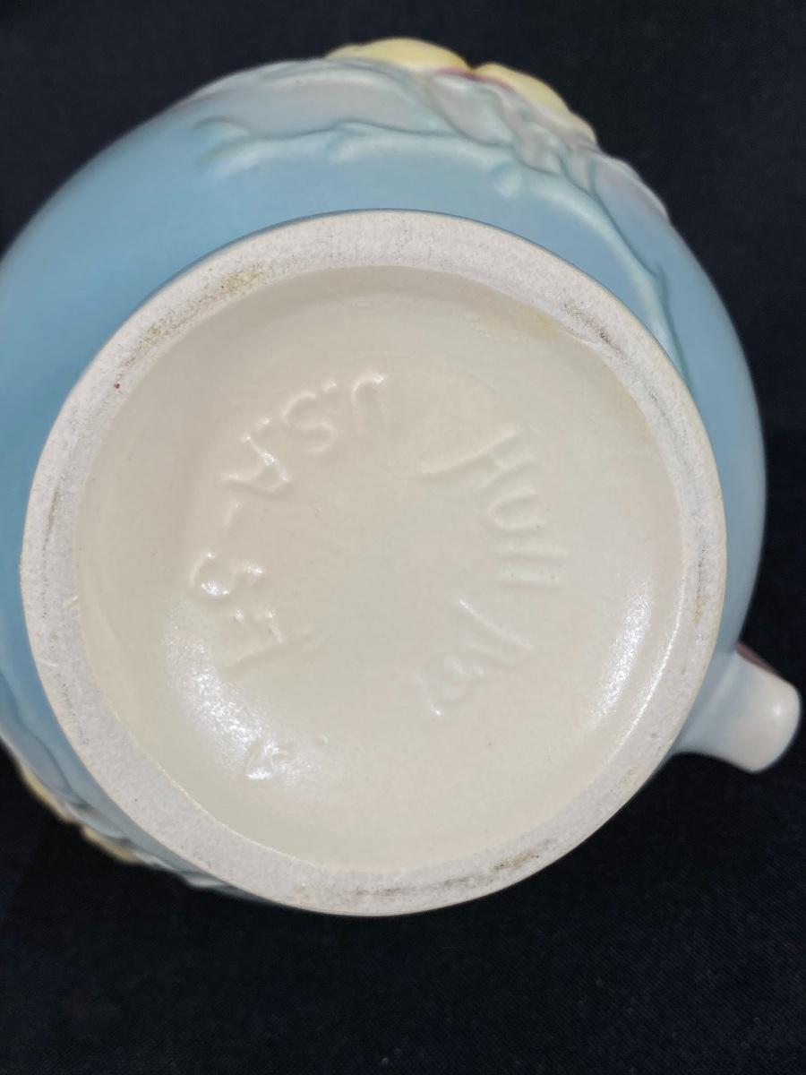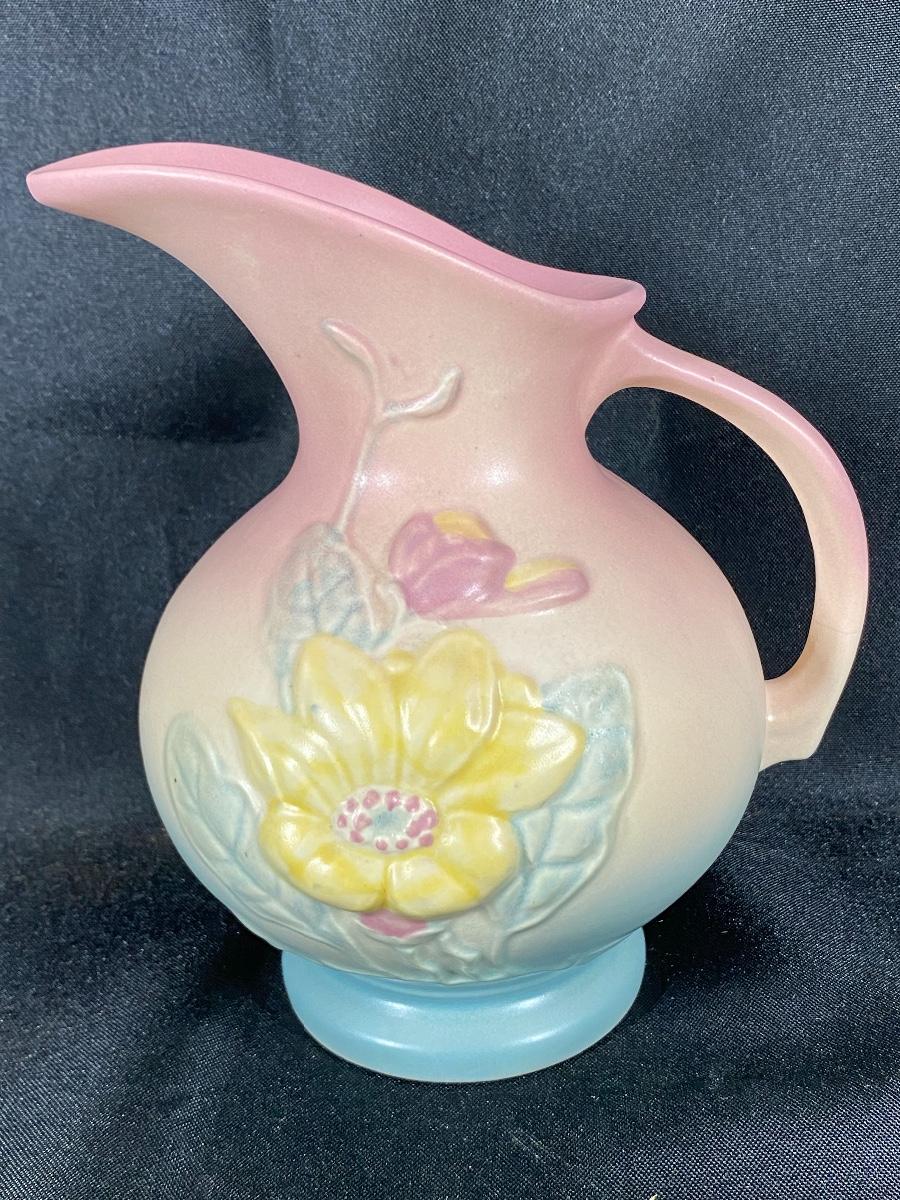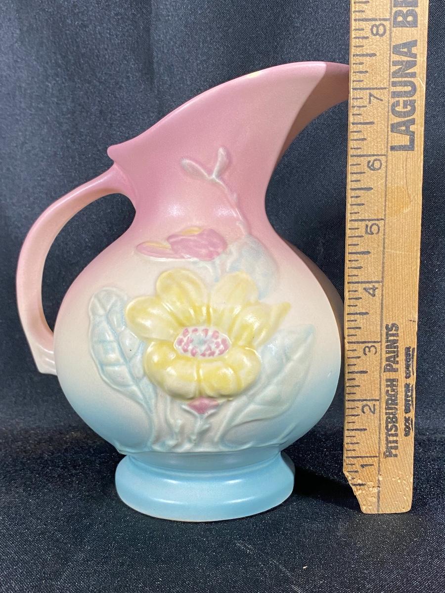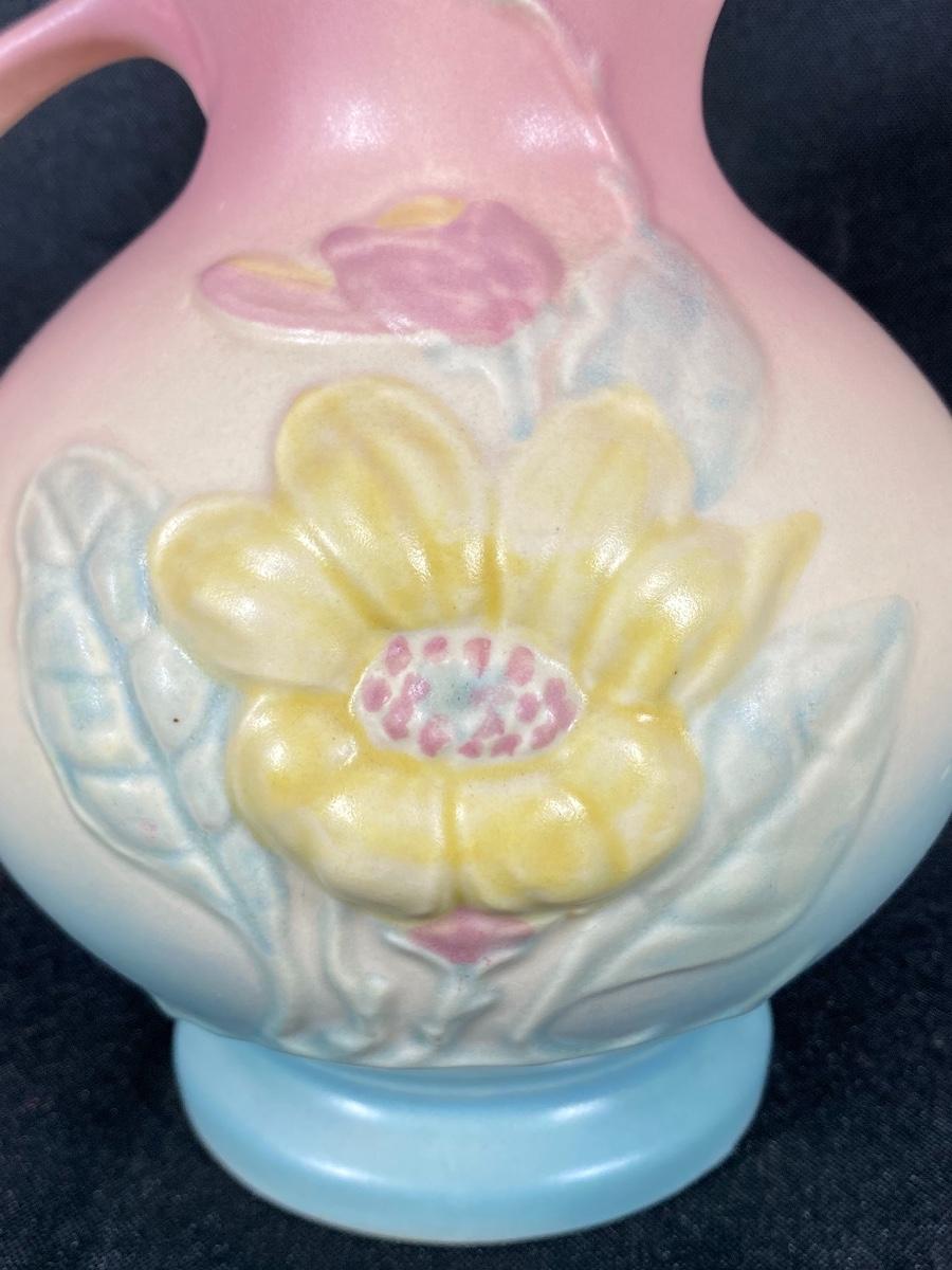 Vintage 8" Hull Pottery water pitcher. Pink to blue with yellow flower embossed on both sides. In good condition. Great as a vase.
