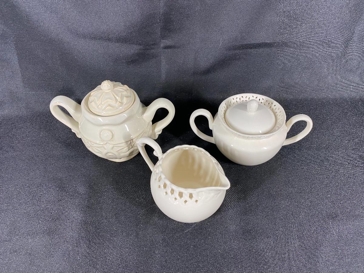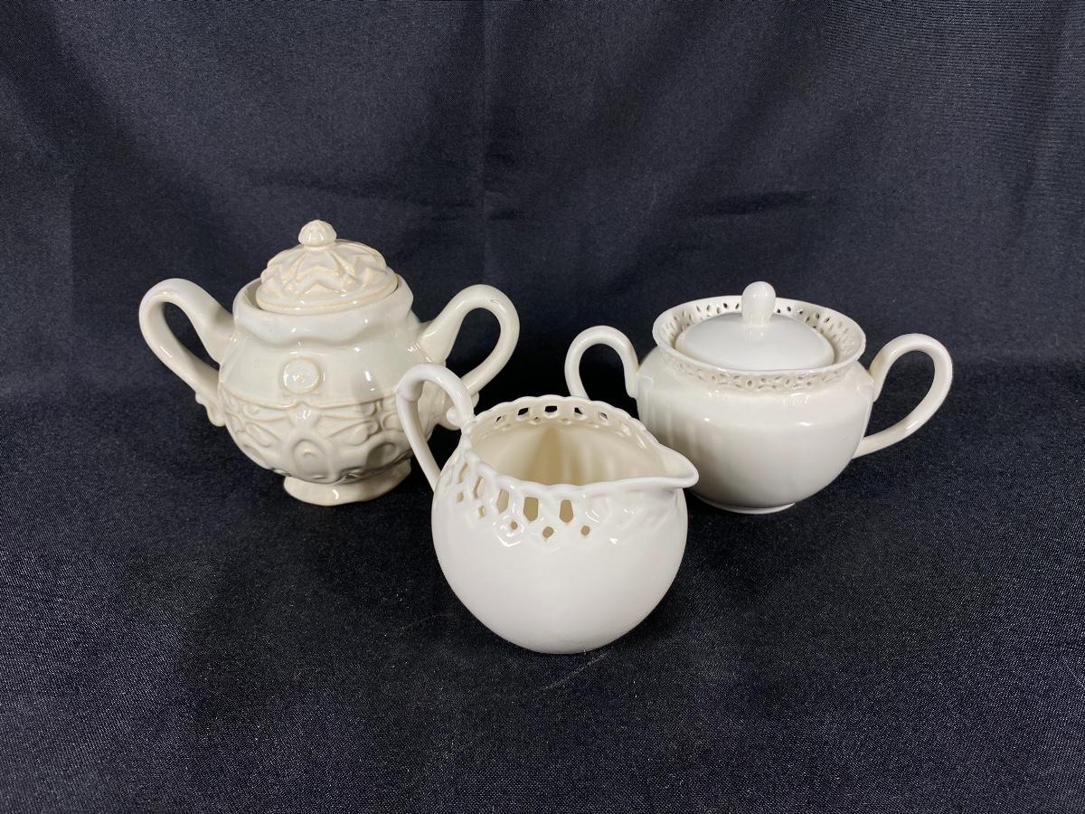 Set of 3 off white sugar bowls and creamer pitcher. All different from the other. Good condition.