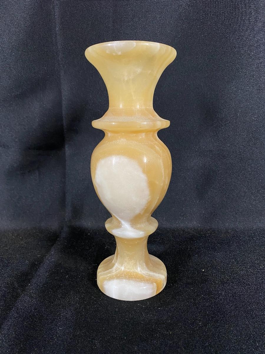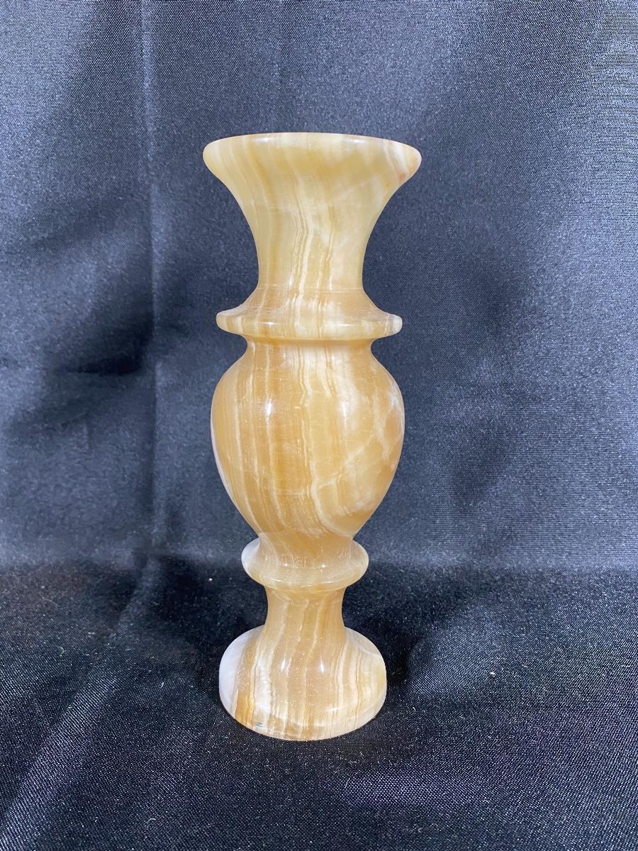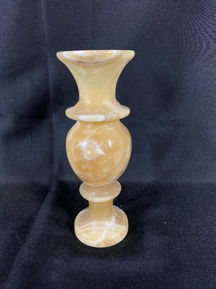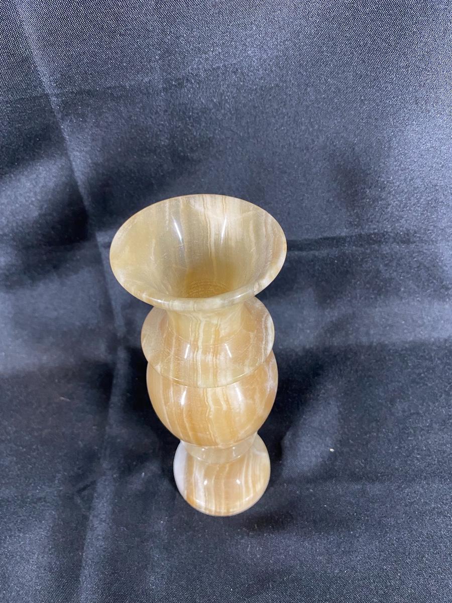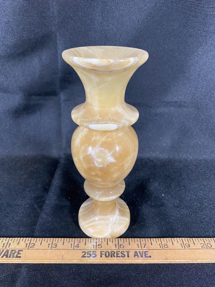 Amber colored marble vase. Nice swirl in the stone. Heavy. About 8" tall, good condition.