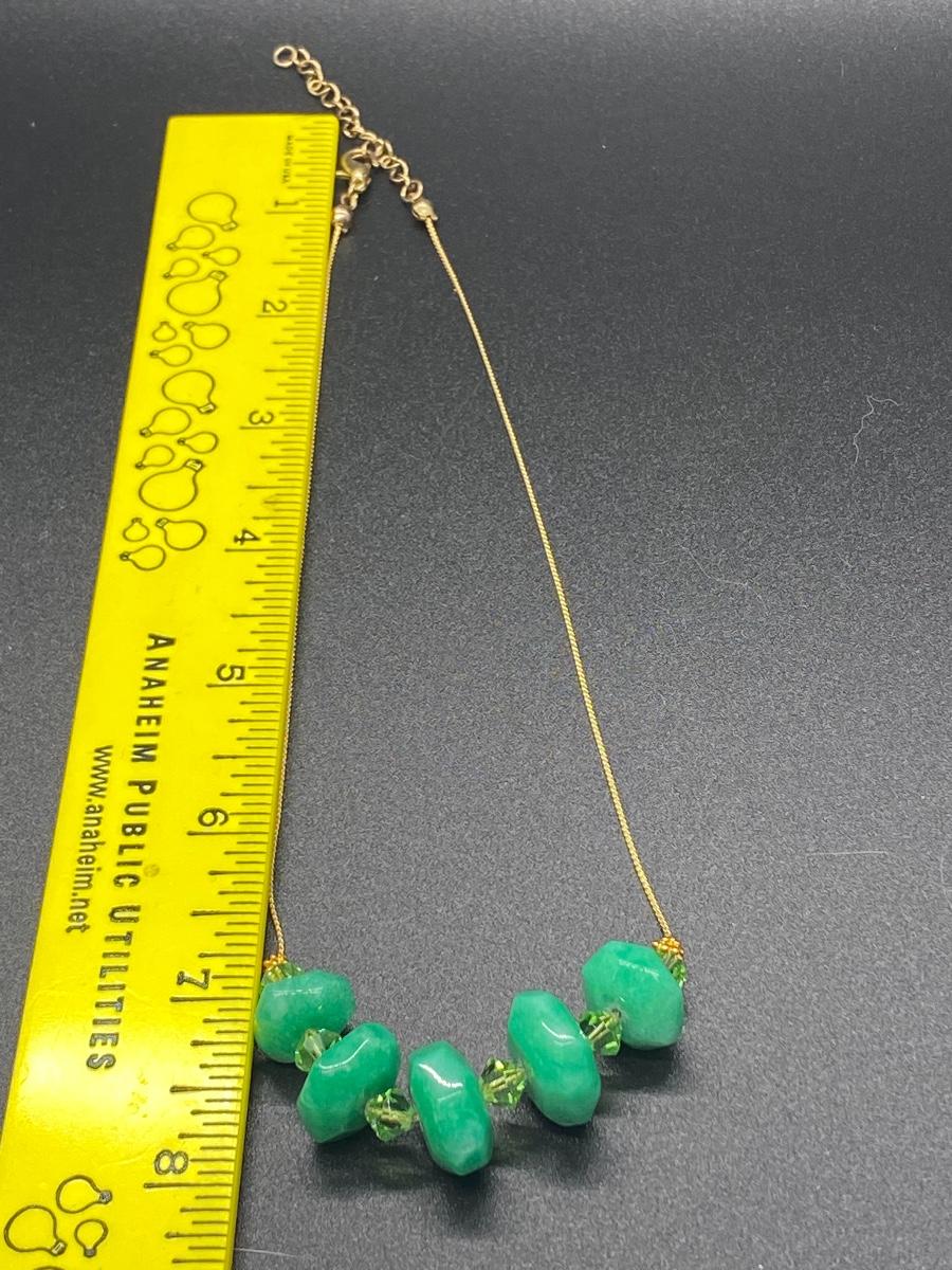 Gold tone chain with cut polish green stone and bead center accent. Stone has a kinda sparkle, like quartz to it . About 8" length, collar bone sitting.