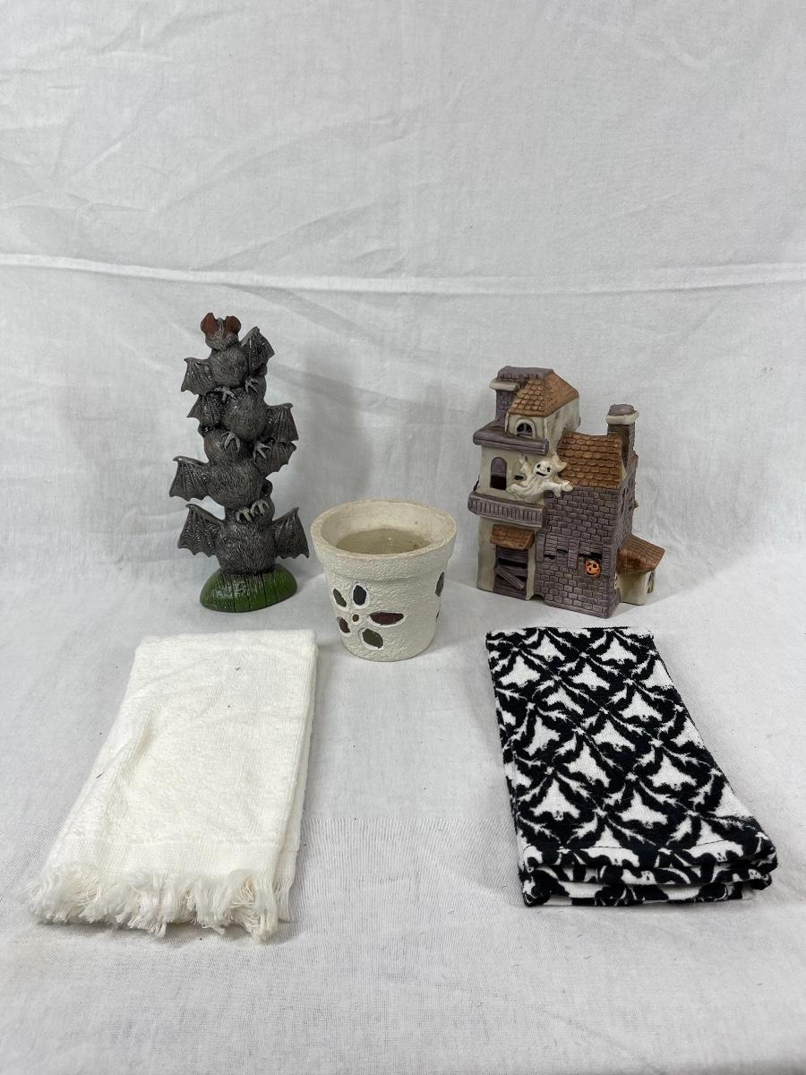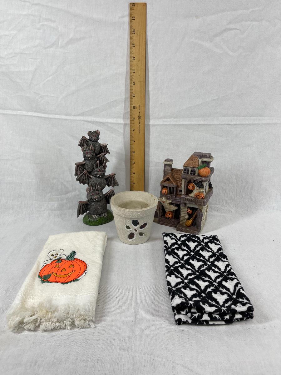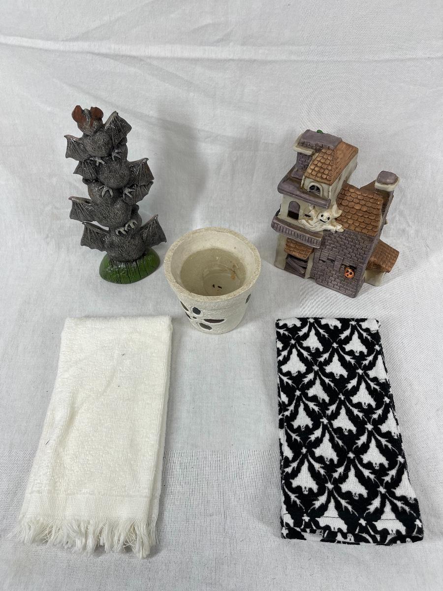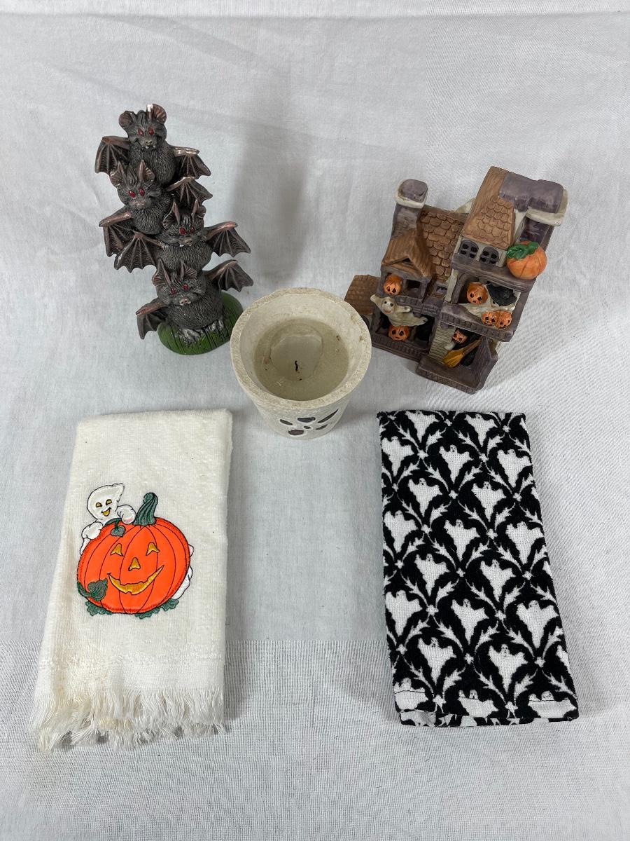 Mixed lot of Halloween theme decor. Decor pieces and hand towels. Good condition, may be dusty or have light discolor from age/use.