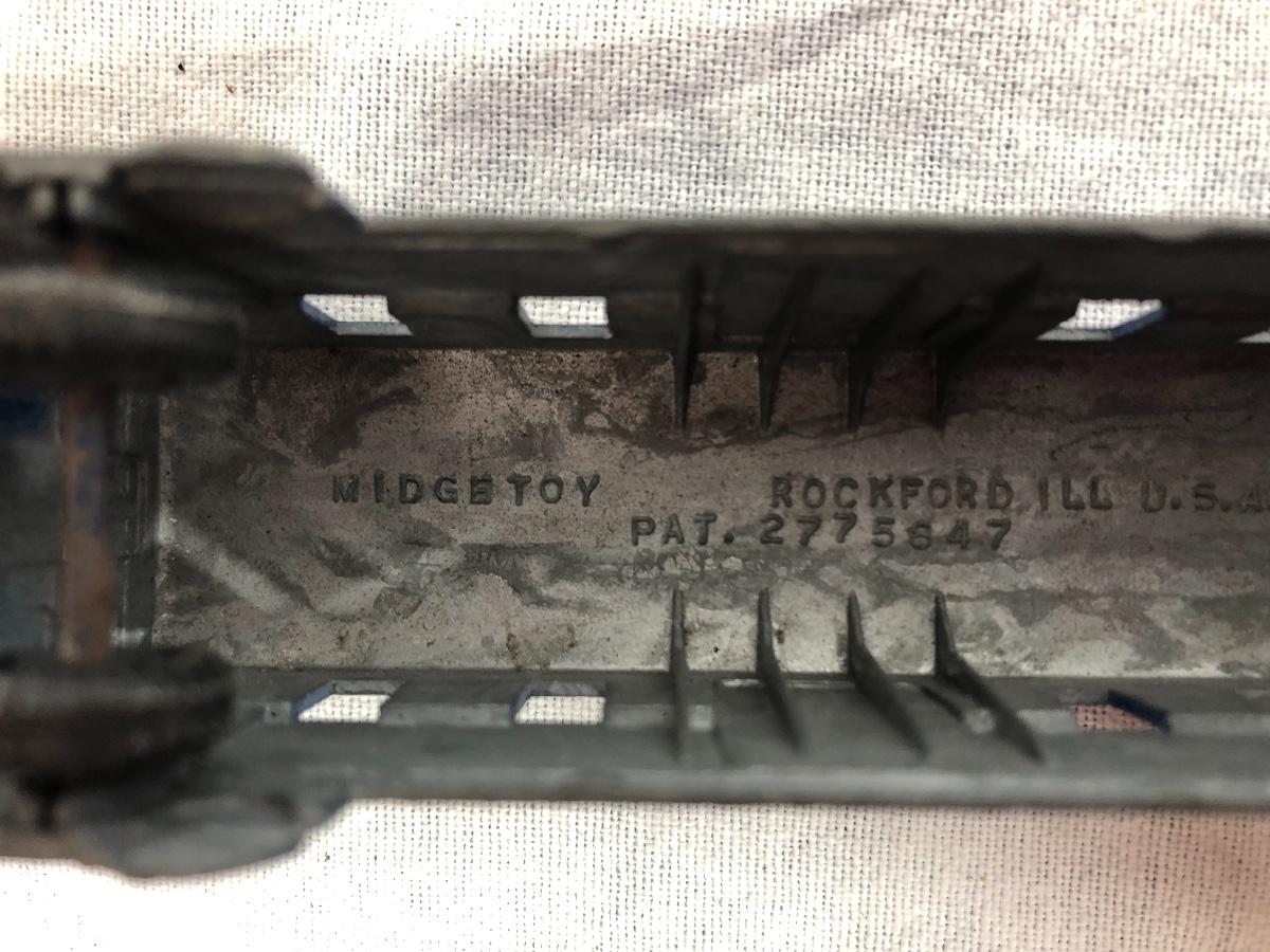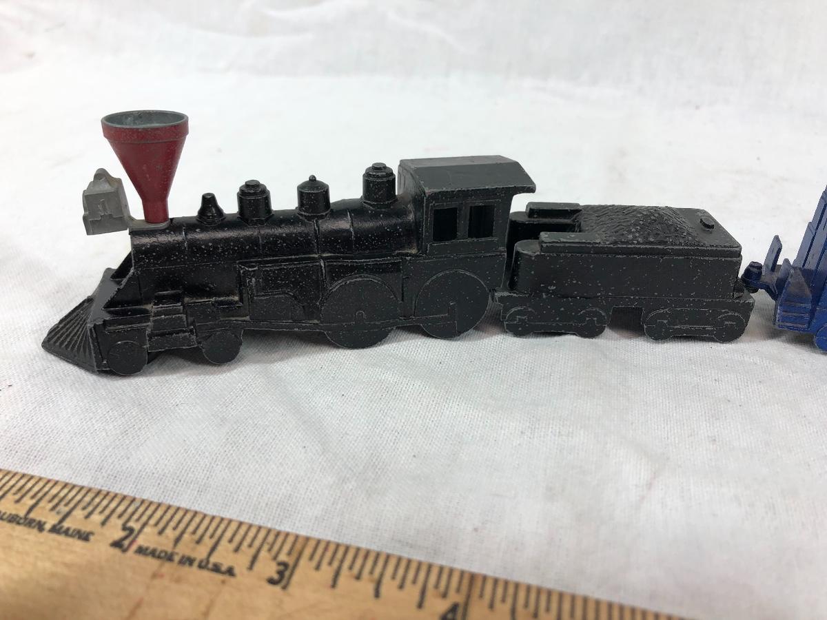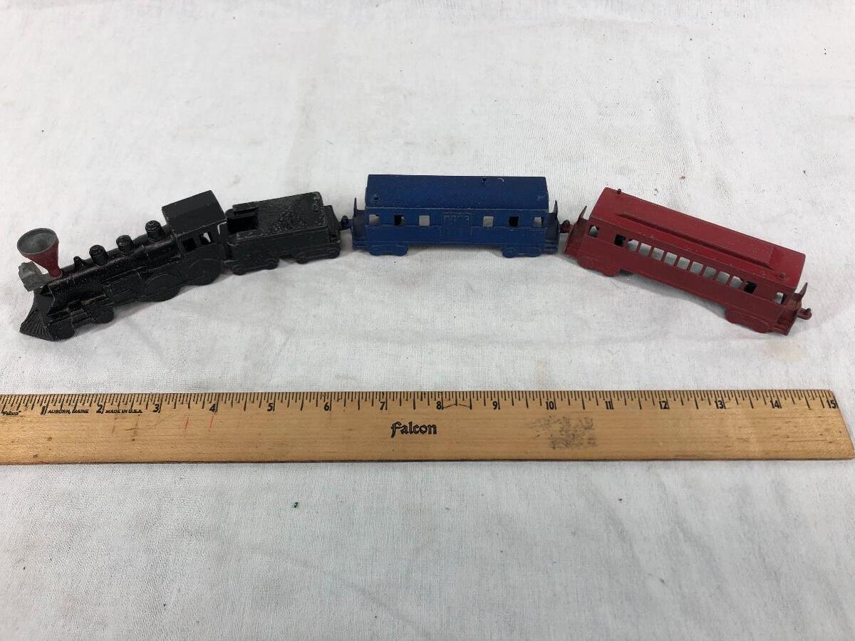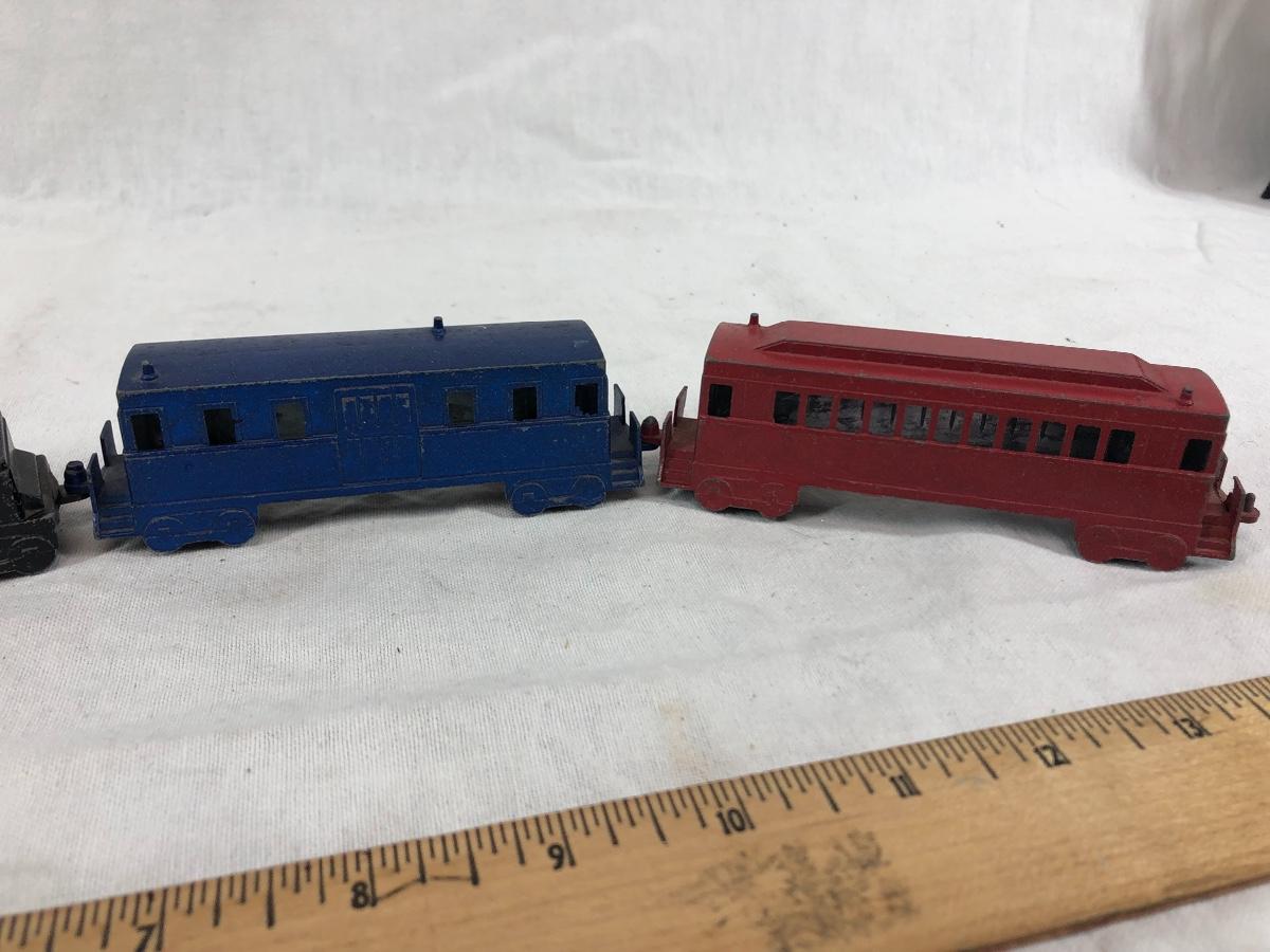 Made by Midgetoy in Rockford, Ill. 4 pieces: engine, tender, and 2 passenger cars. Some wear marks, no visible damage.