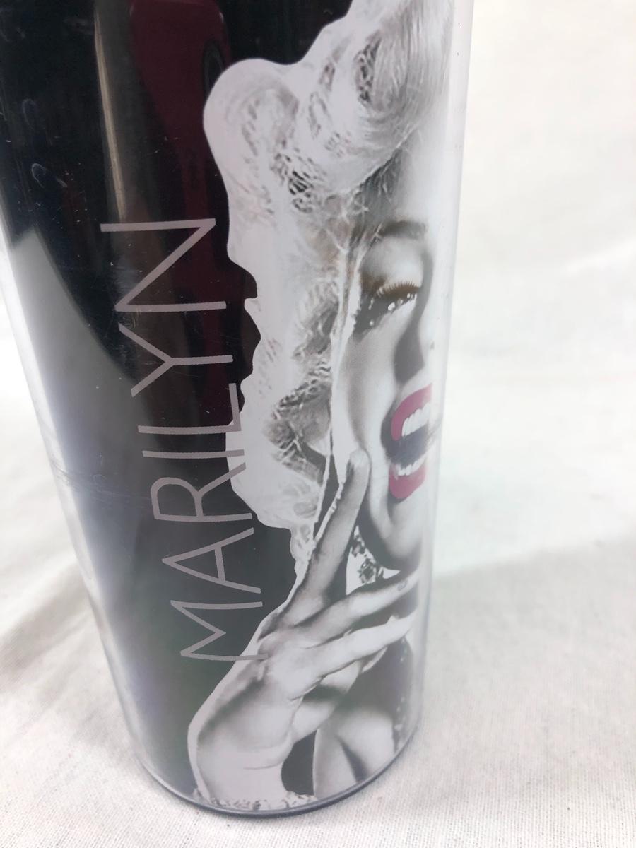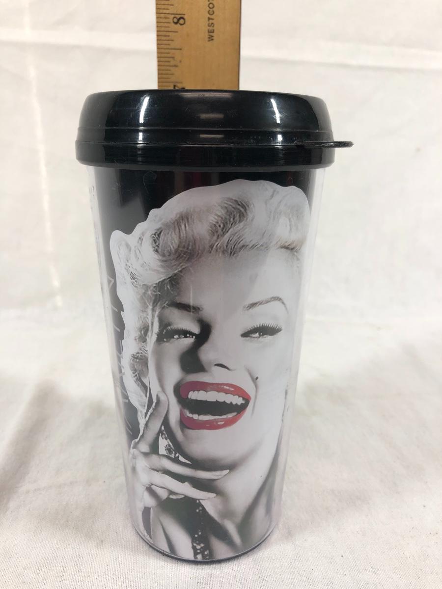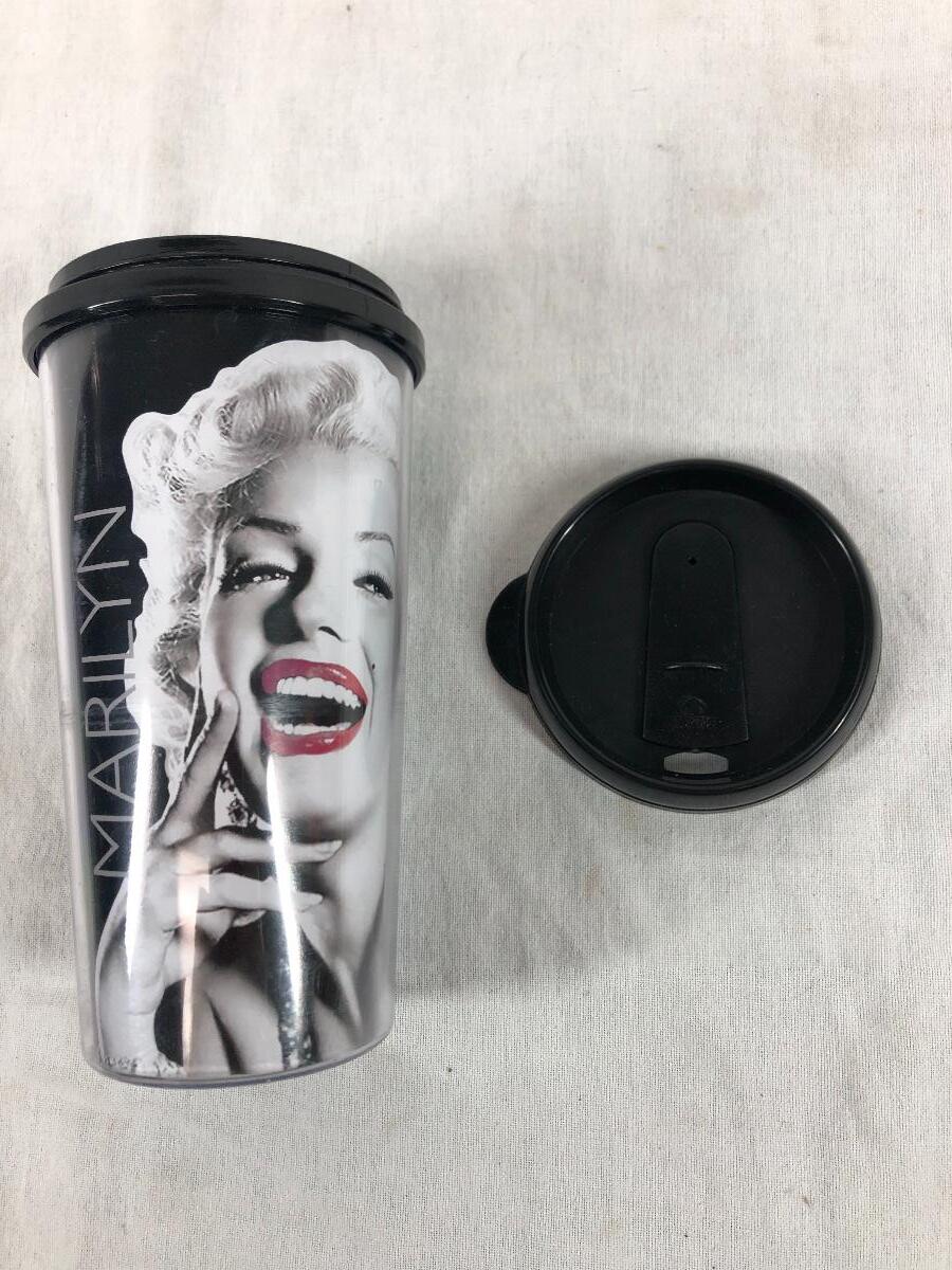 Marilyn Monroe plastic coffee travel mug. In good previously owned condition.