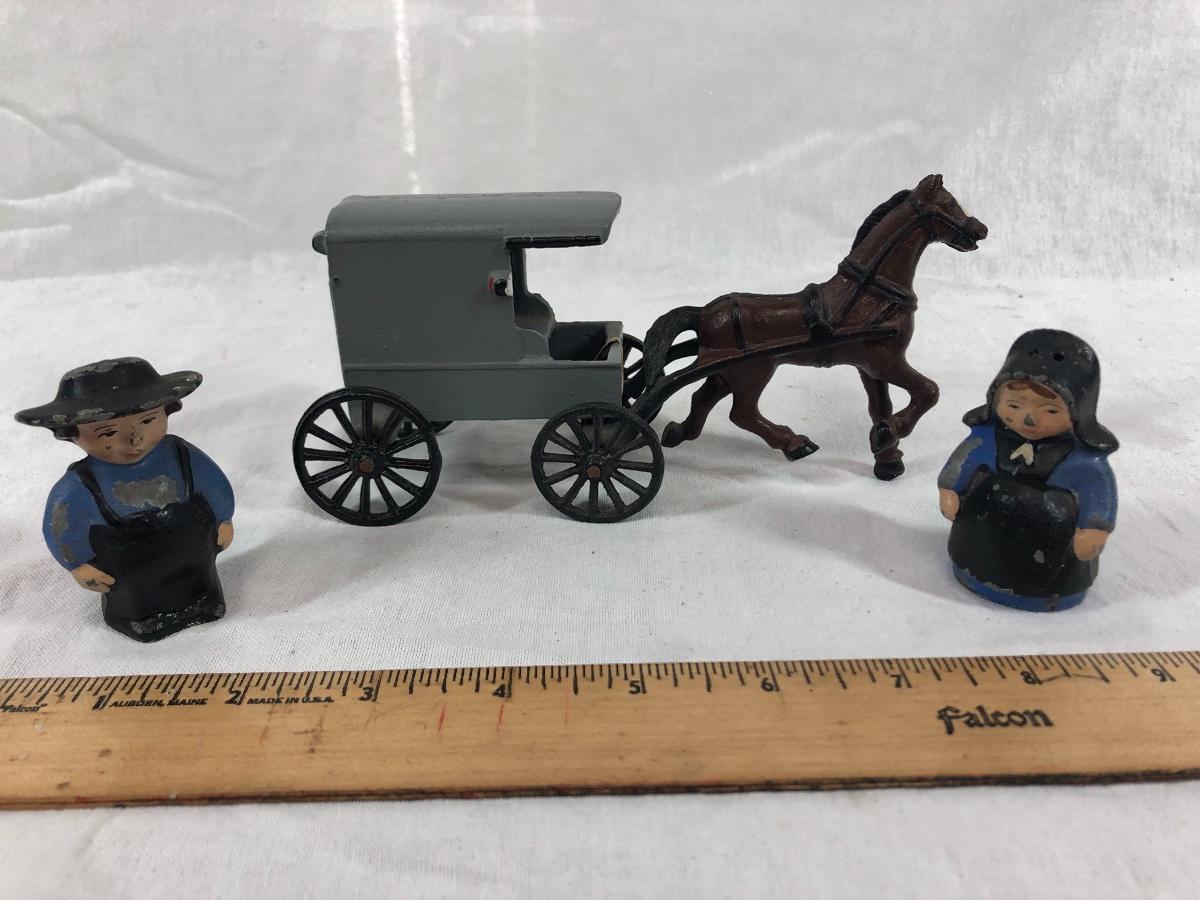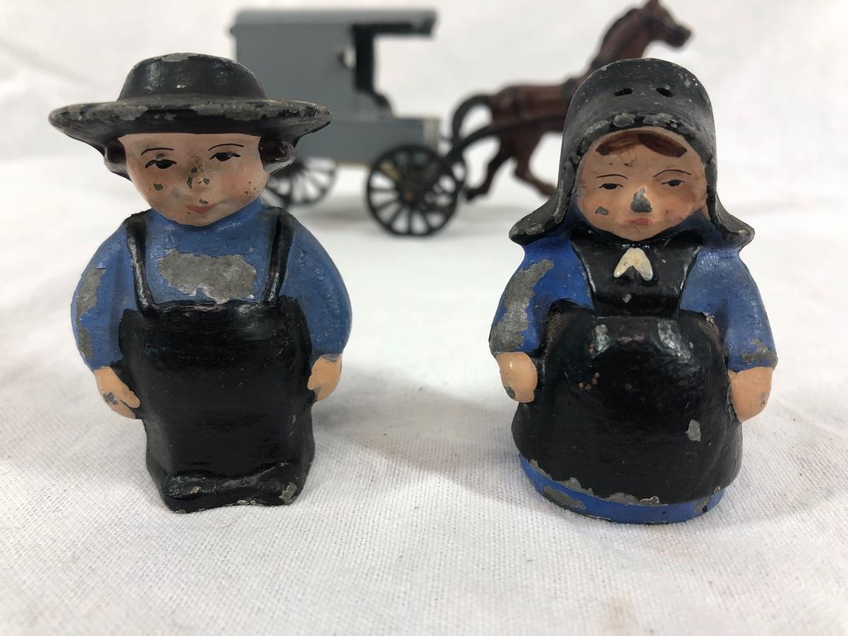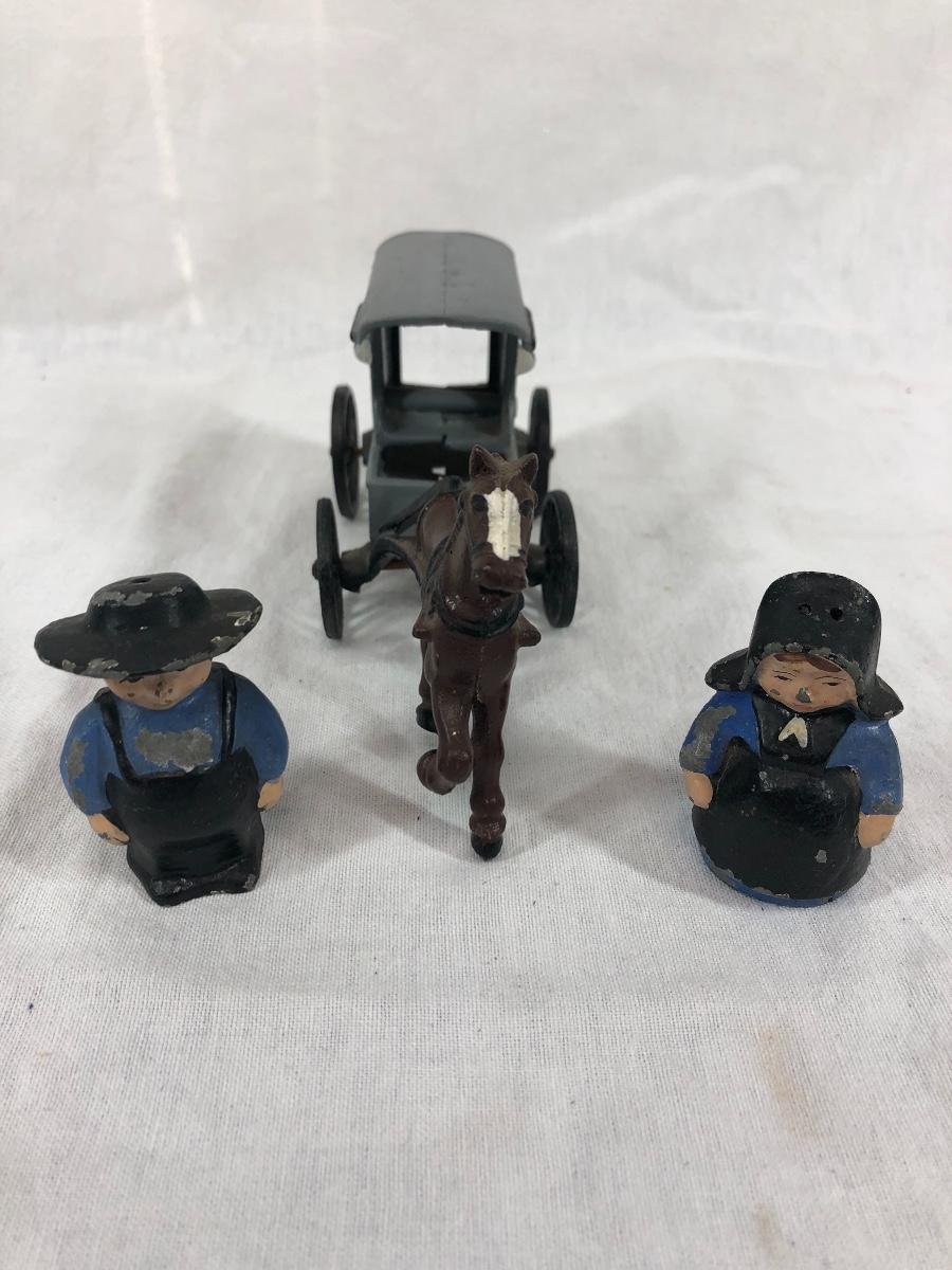 Painted Cast Iron Metal Amish Couple Salt Shakers with Horse Buggy Figurine Miniature