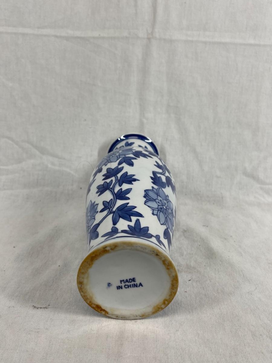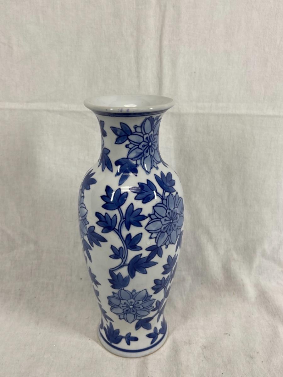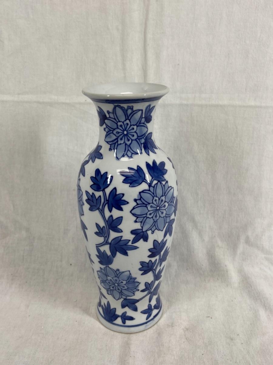 Blue and white floral vase. Asian style design. About 10” tall. Made in China.