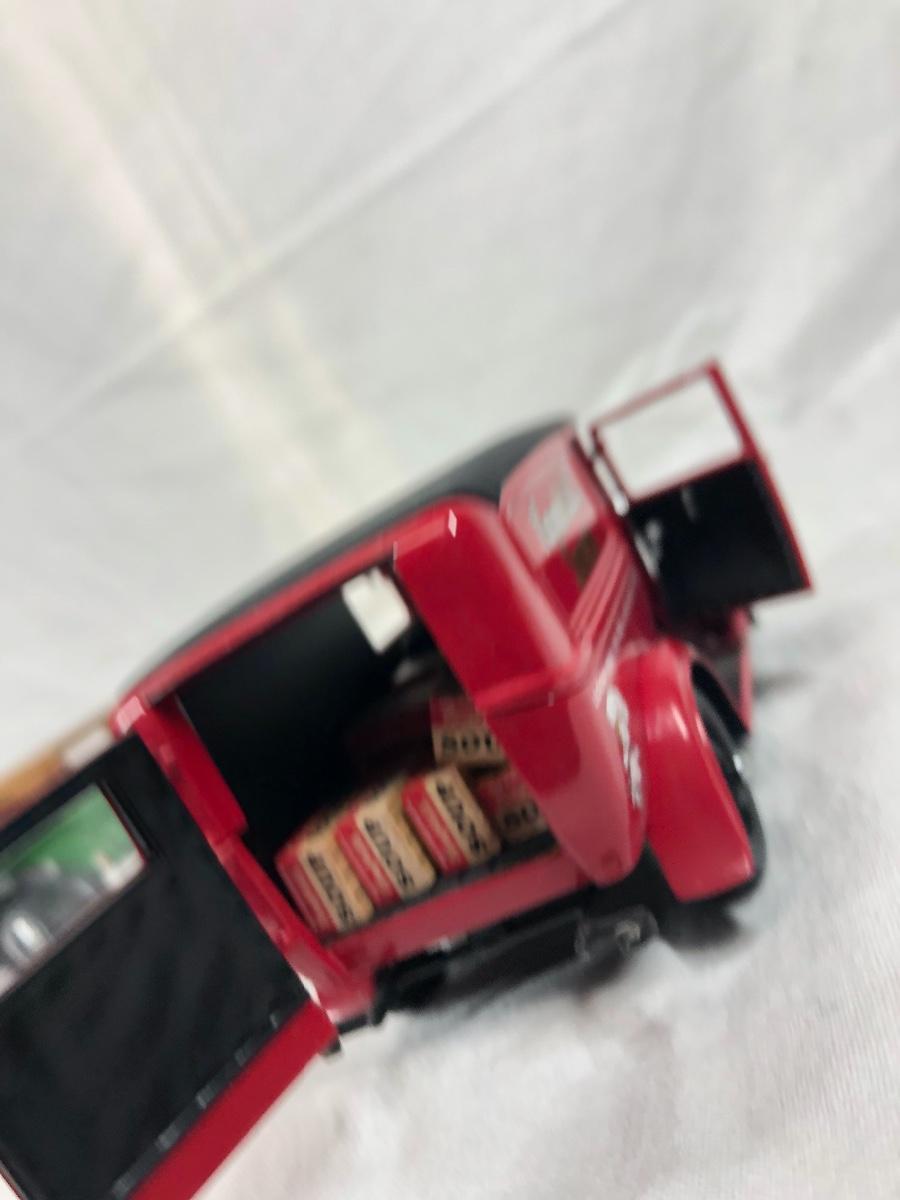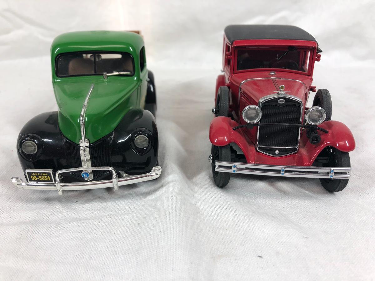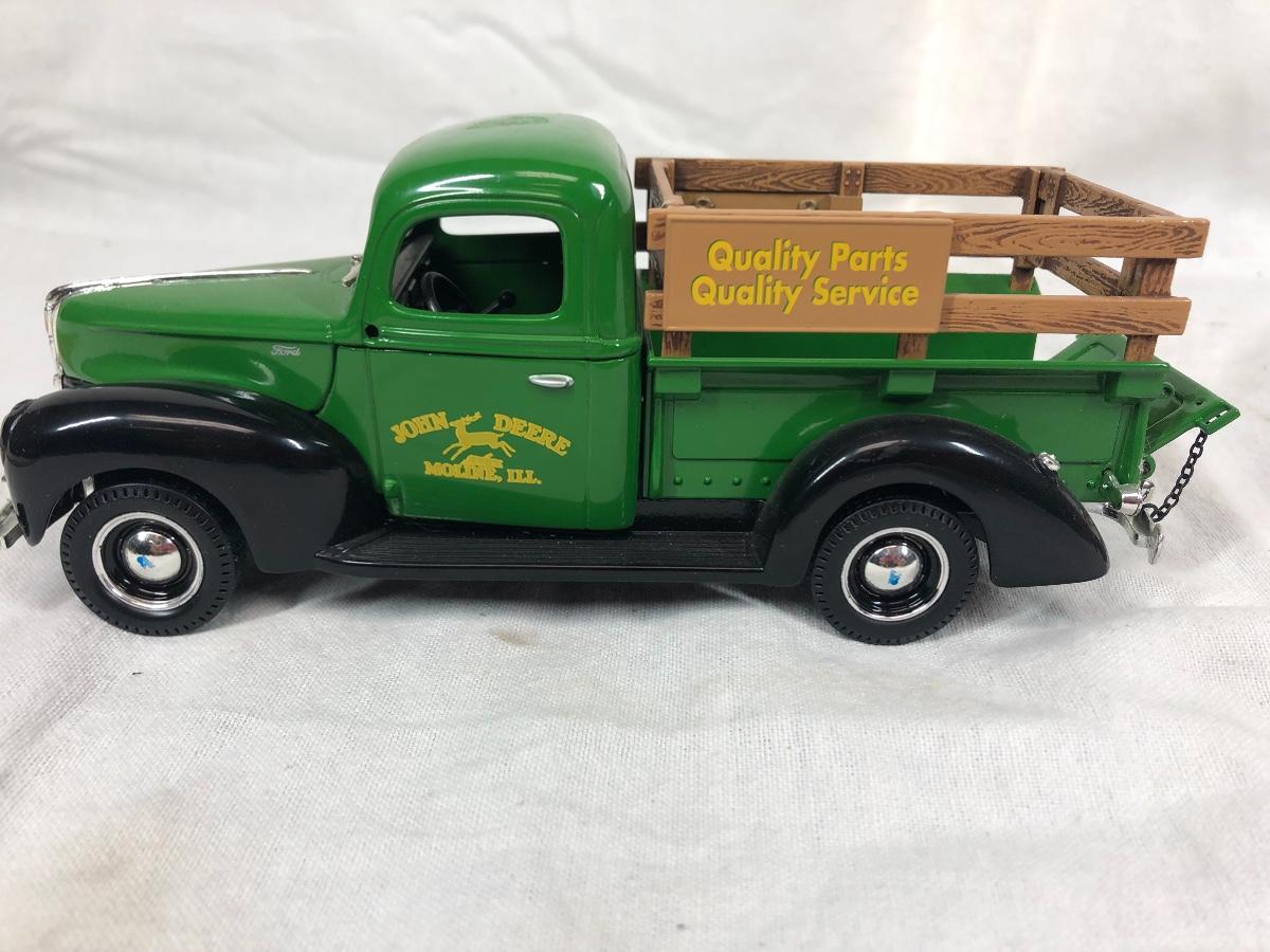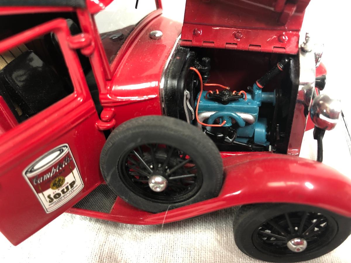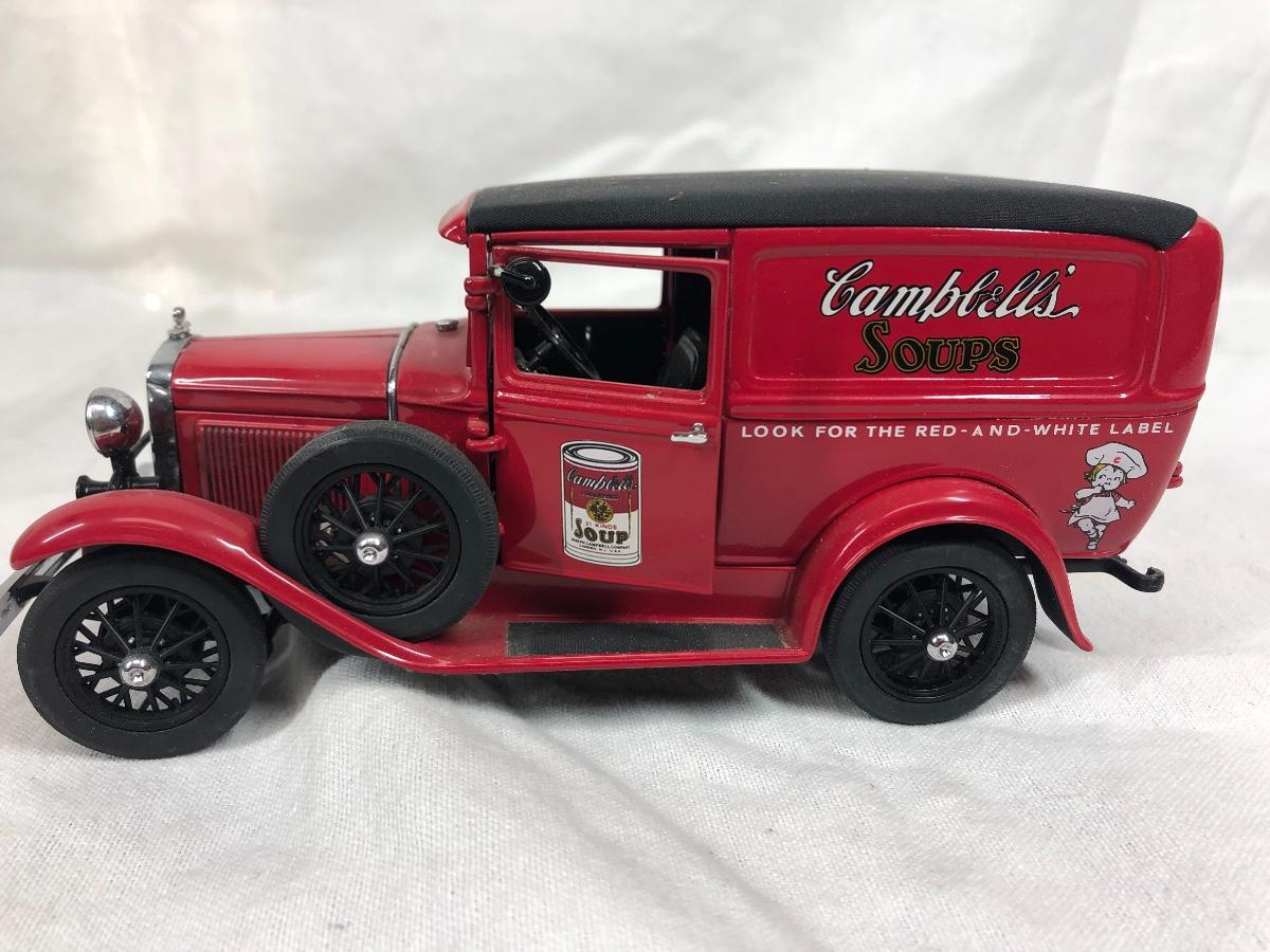 Pair of die cast old time cars. Green John Deere pick up truck and a red Campbell's Soup car. About 7" size. Good for display or play.