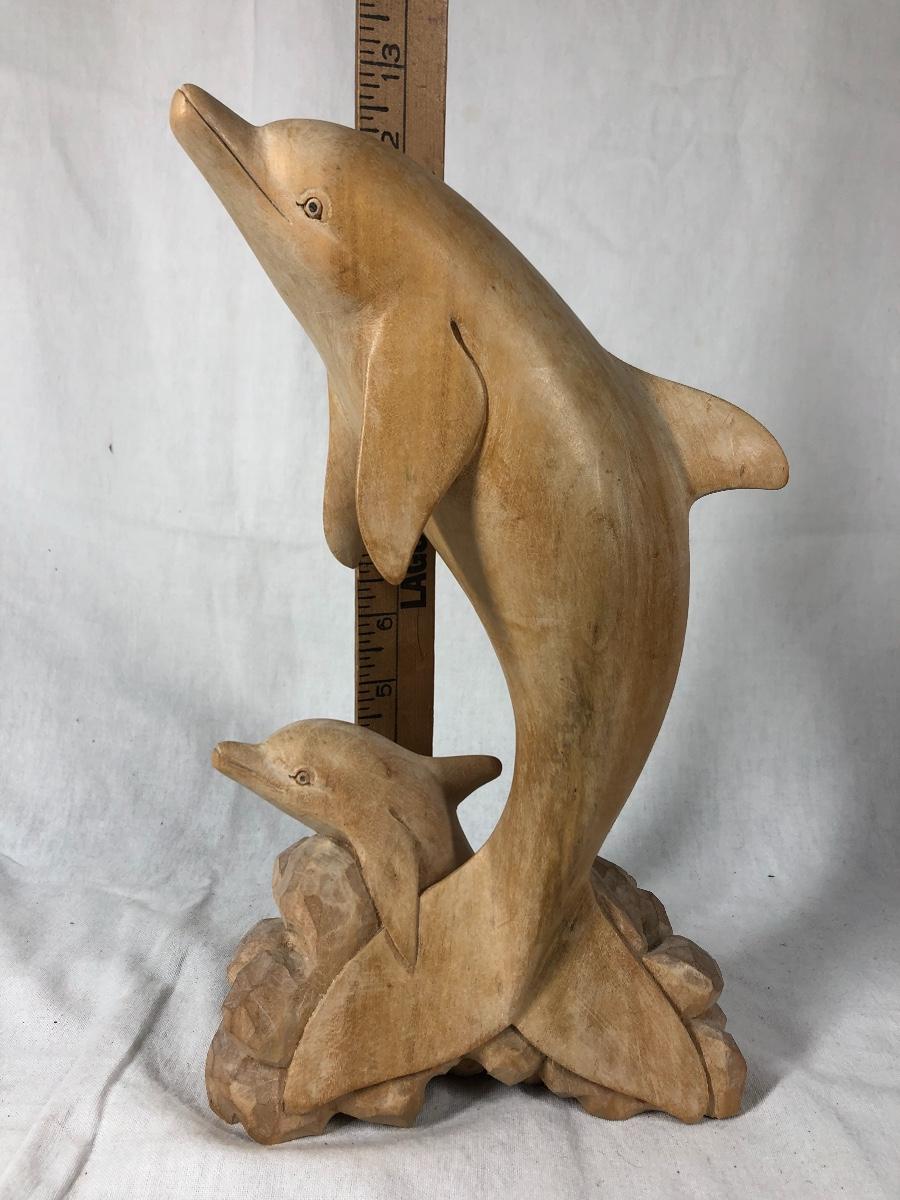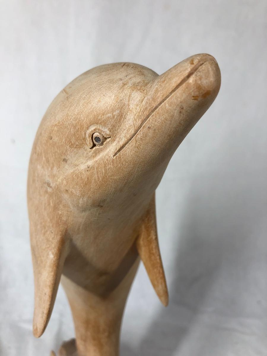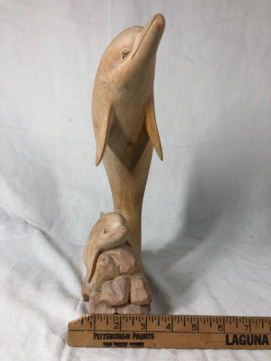 Carved light finish wood dolphin statue. Has light signs of age from display. About 13" tall.
