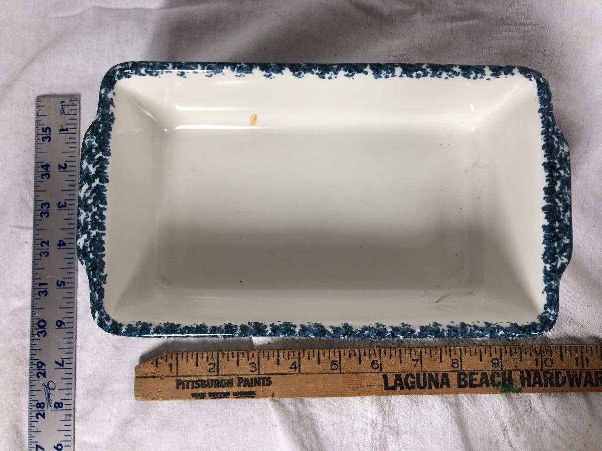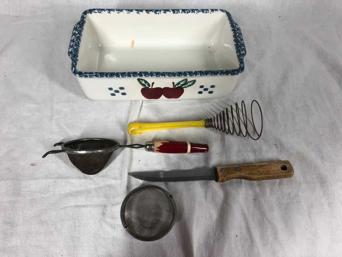 Vintage kitchen lot. Hand tools and a ceramic bread pan.