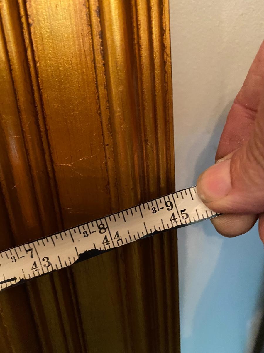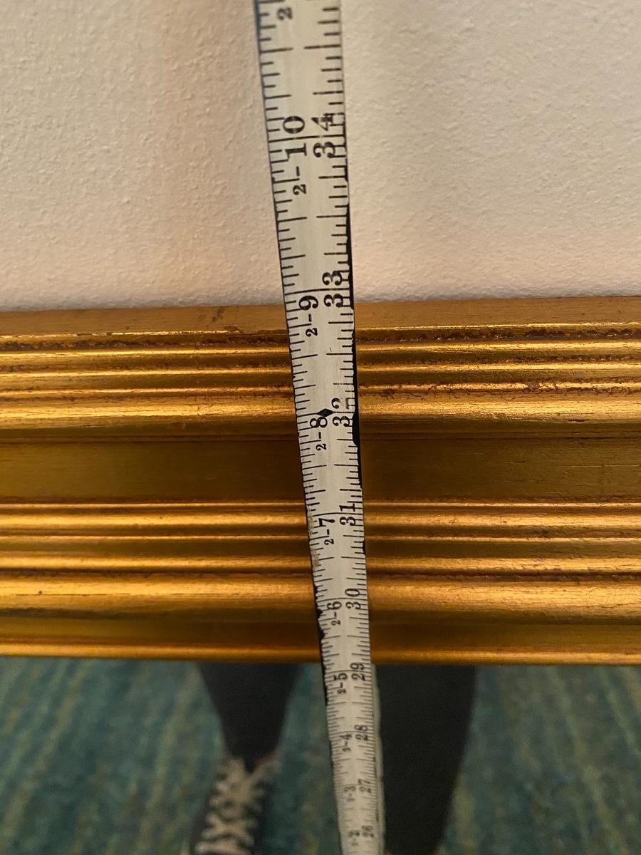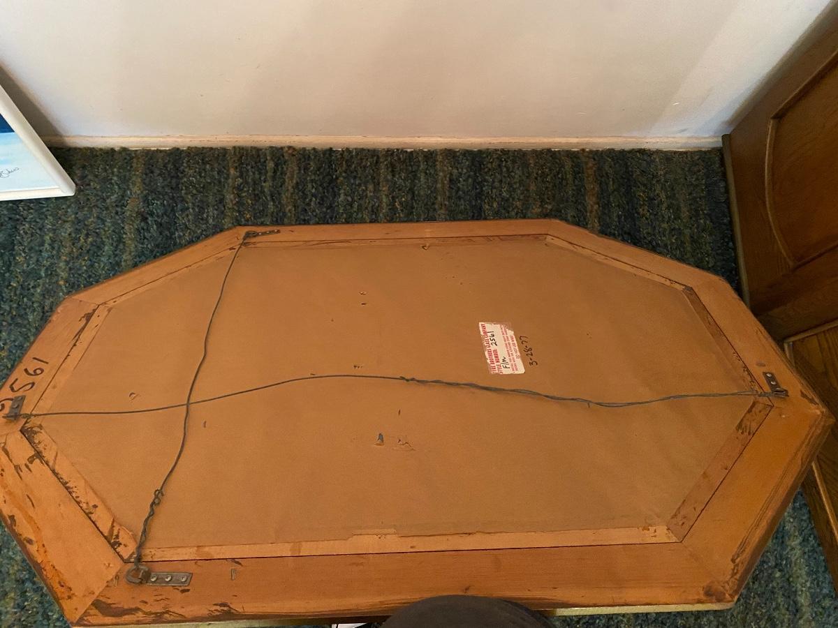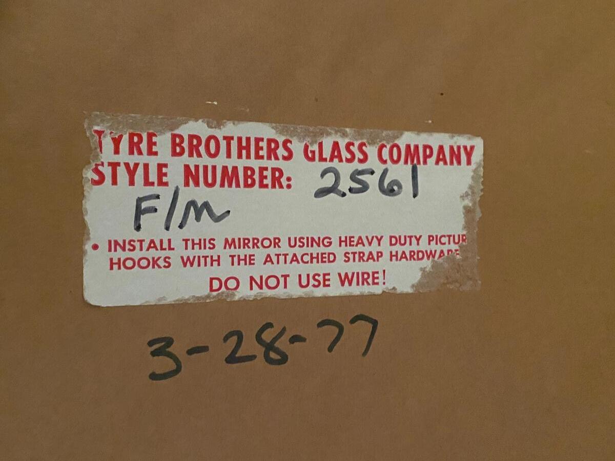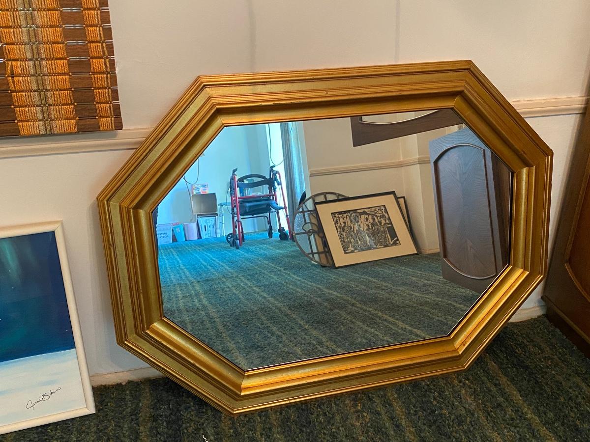 Large vintage wall mirror. Oblong octagon shape. Wide gold frame. Measures about 33"x45". Can be hung horizontal or vertical. Made by Tyre Brothers Glass Company 3/28/77.