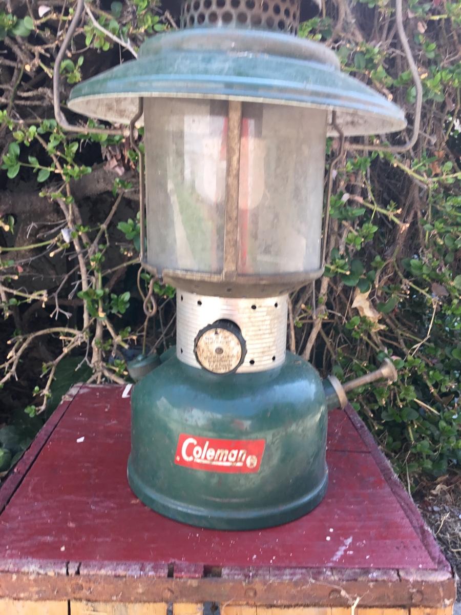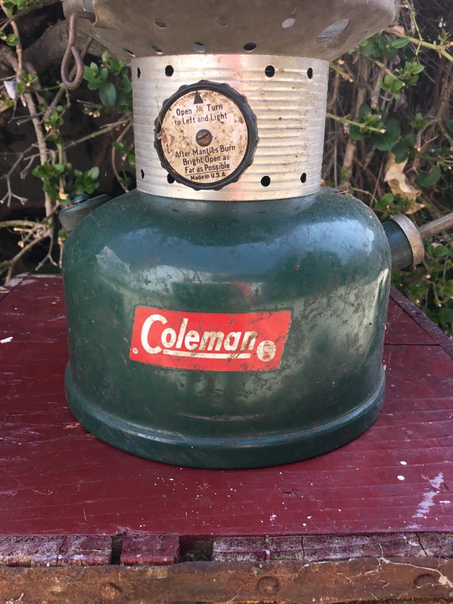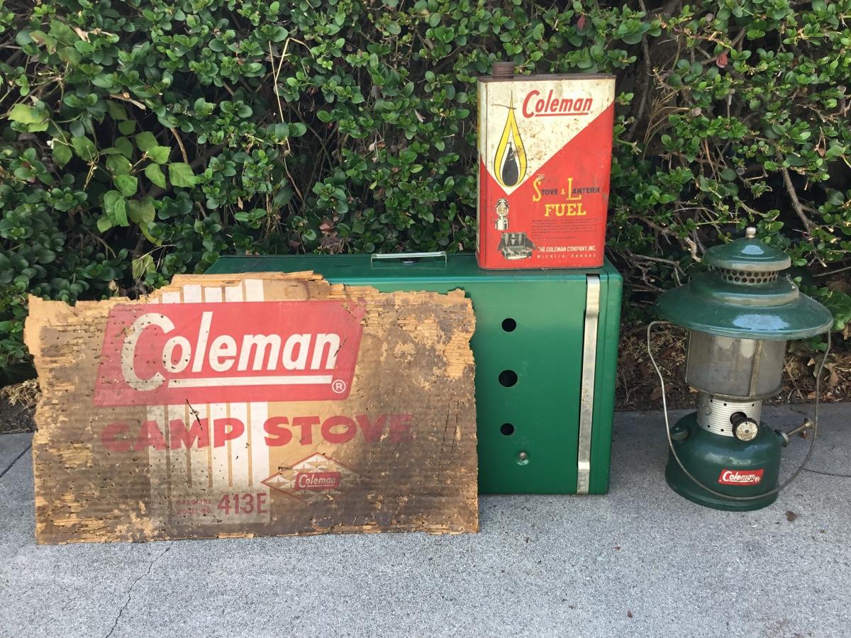 Vintage Coleman camp stove and lantern. In good condition. Untested. Stove is very clean. See photos. Not sure how much fuel was in can if any.