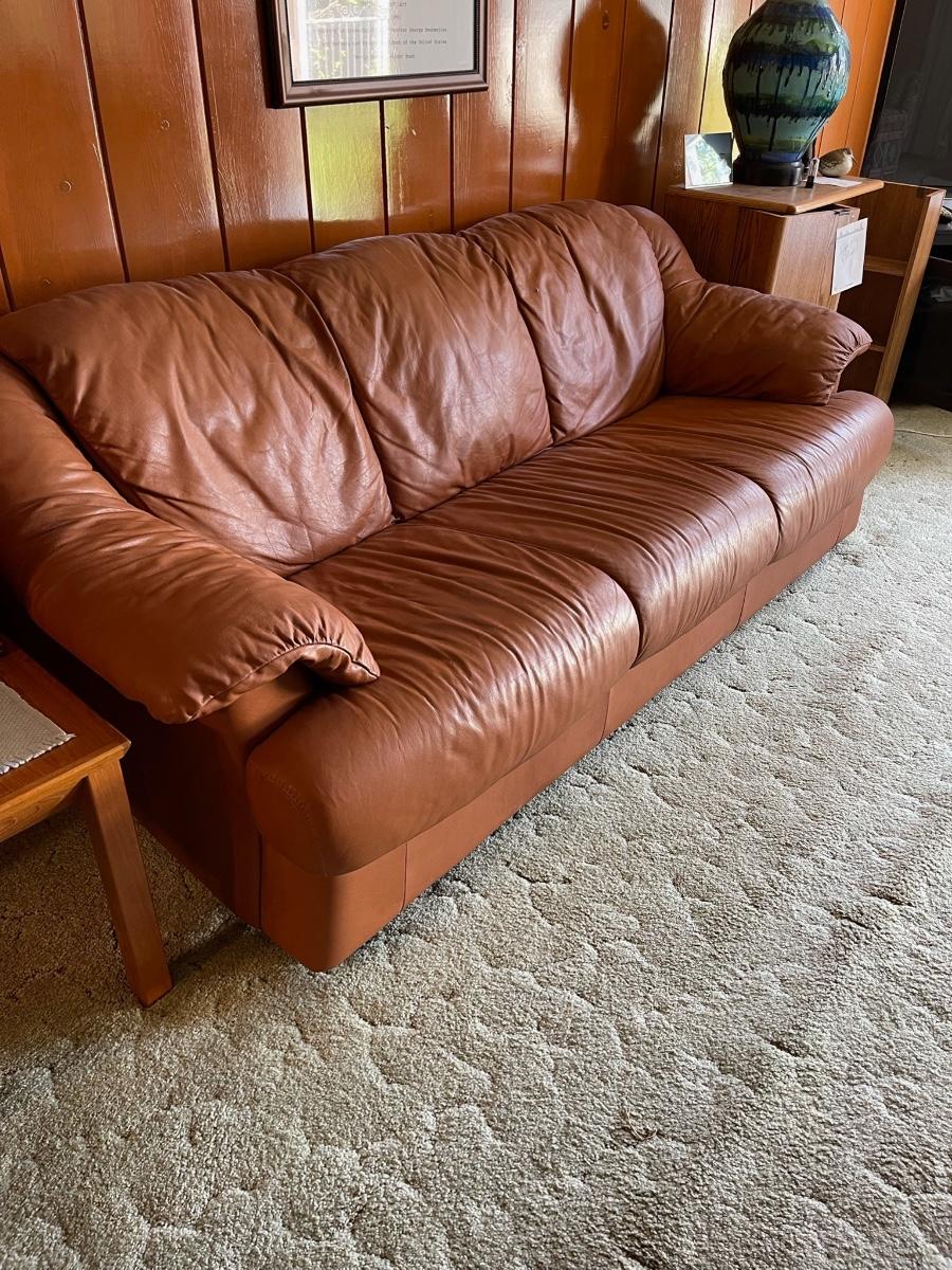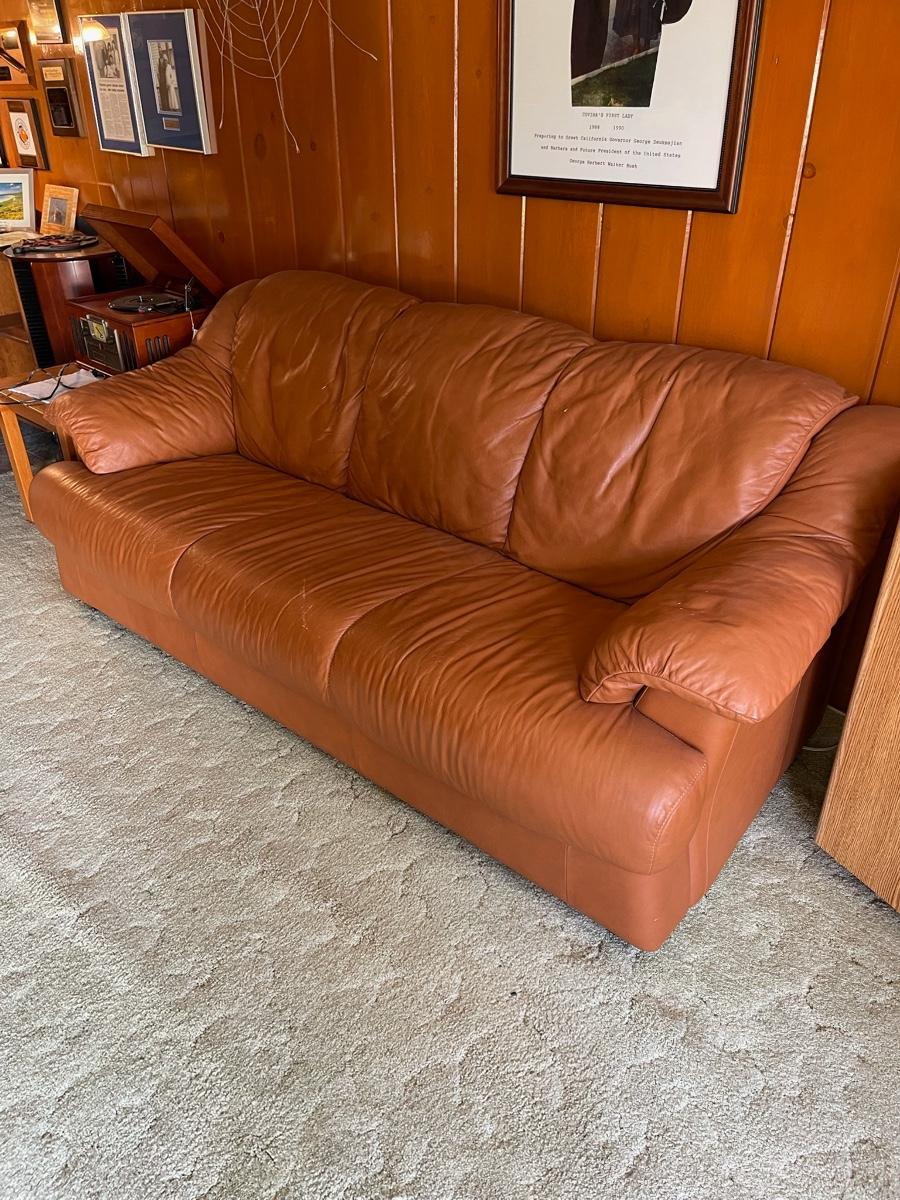 Vintage Faux Leather Couch. Tan color, In good used condition. No holes or tears noticed.