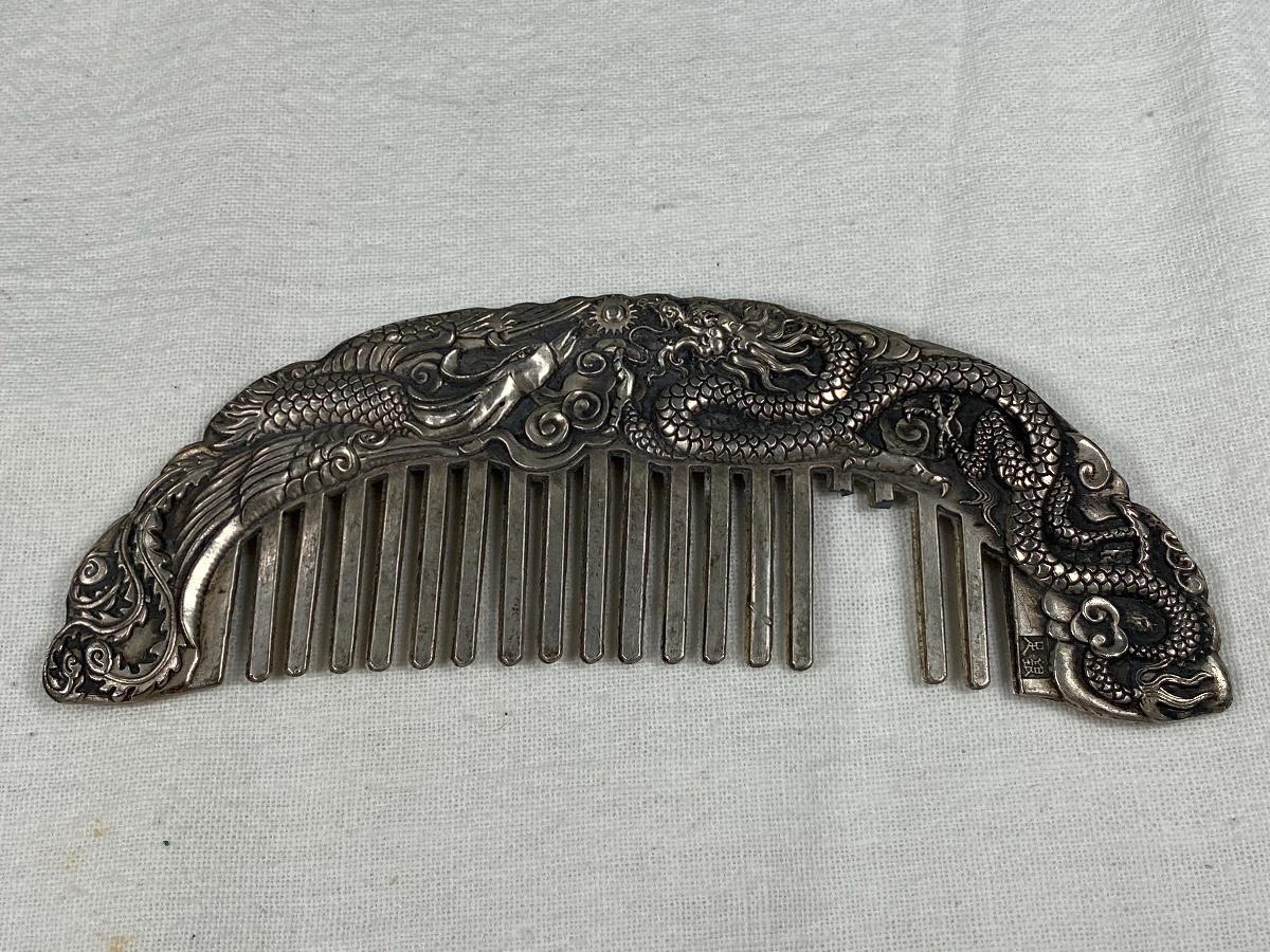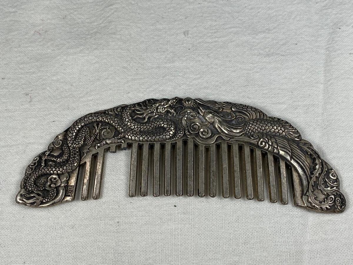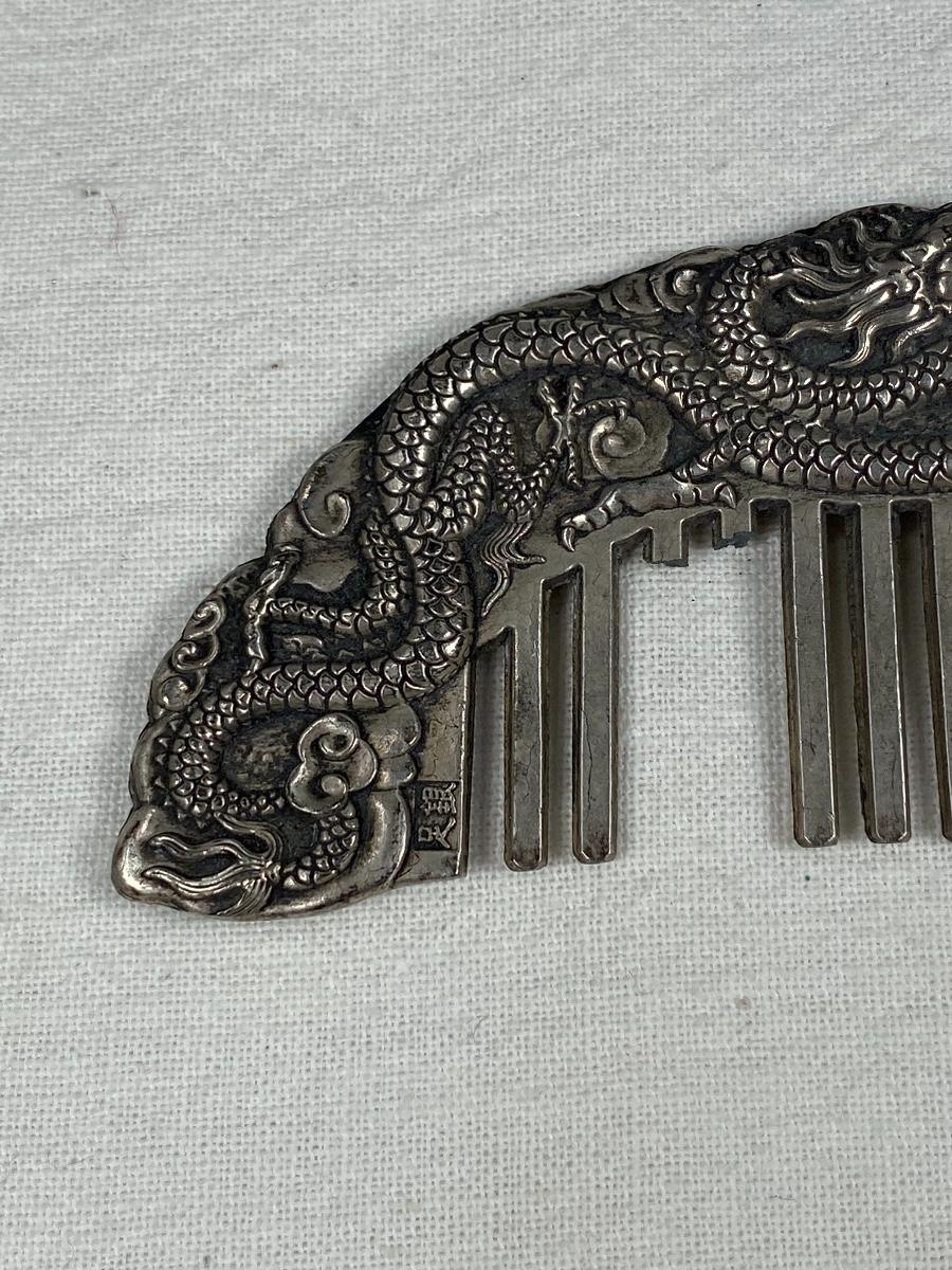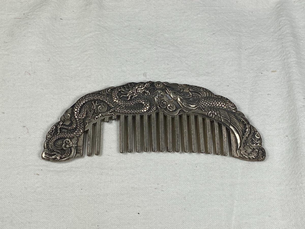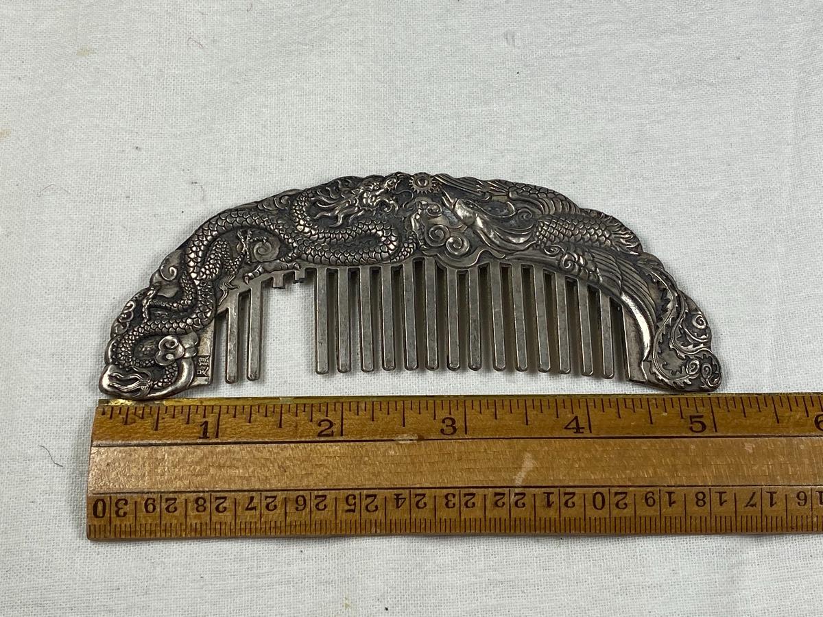 Vintage metal hair comb. Features a dragon and crane embossed pattern. It is missing a couple of teeth. About 5" size. No sterling marks but their is an Asian stamp of characters near bottom on side closes to broken teeth.