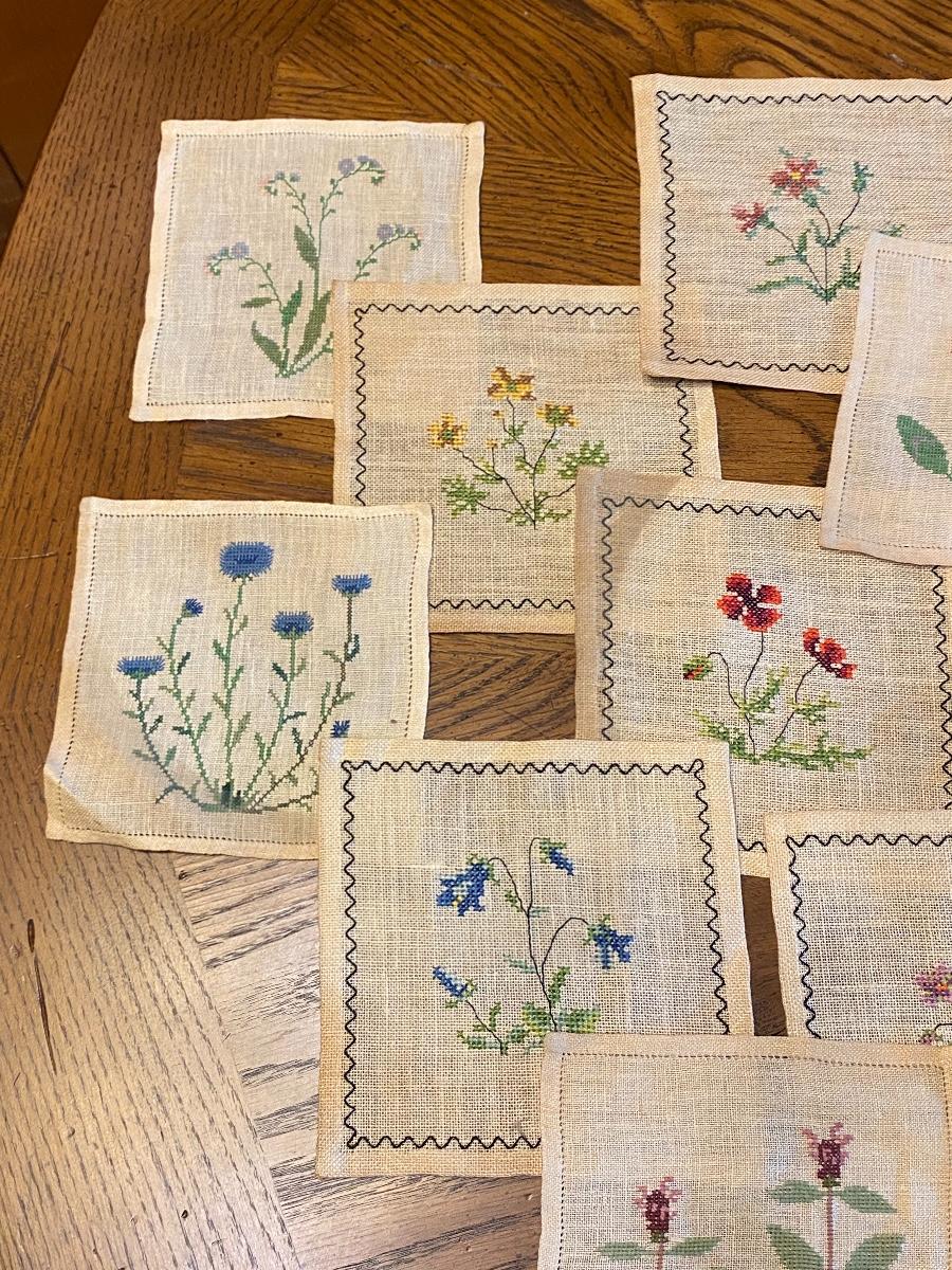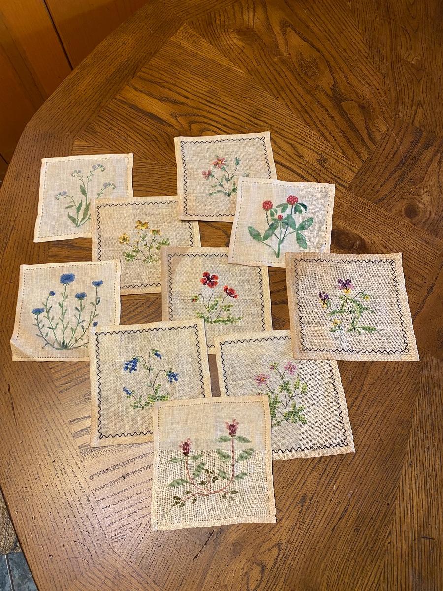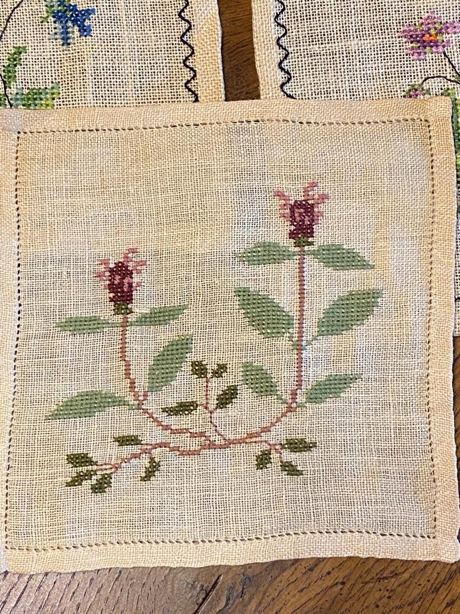 Vintage Needlepoint Flower Doily Set. Could be framed. About 4" square. Some discolor, not sure if its just dust,