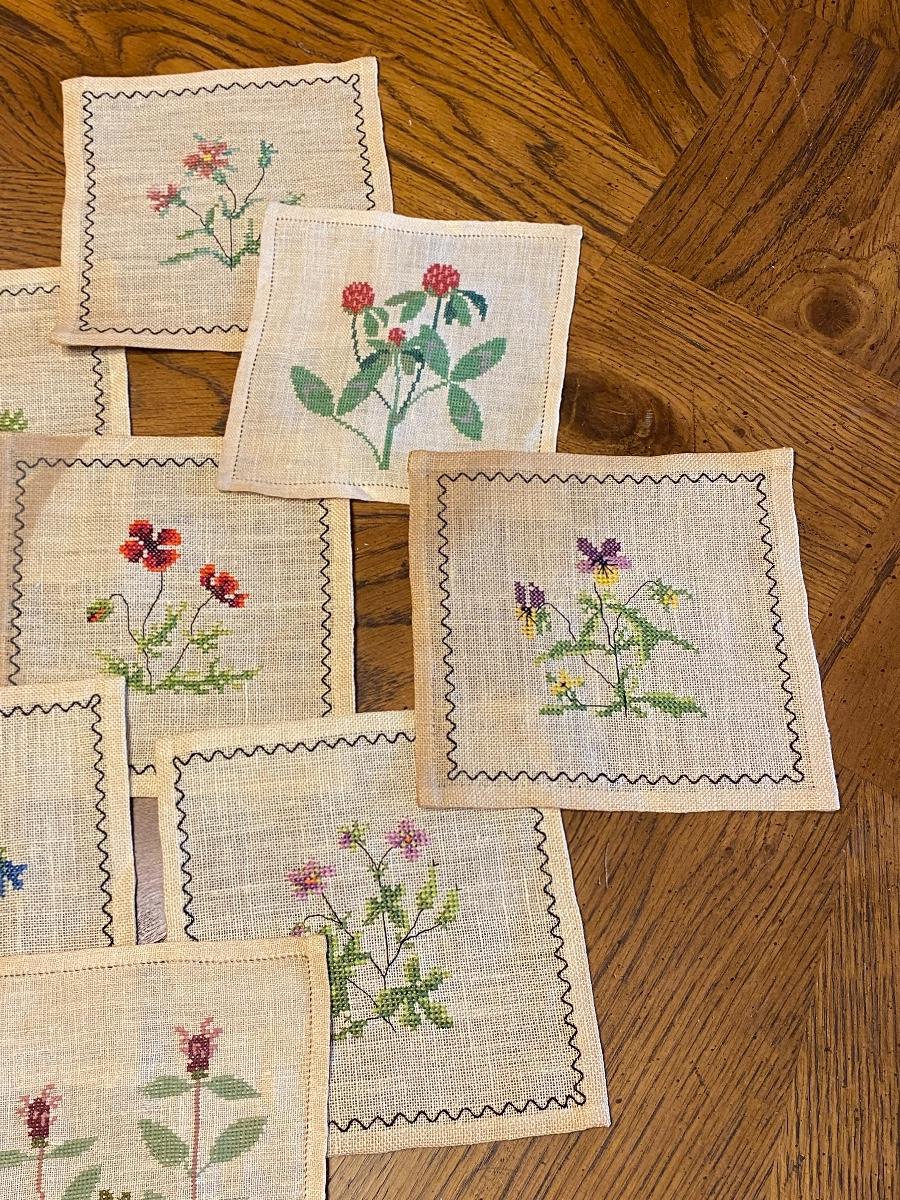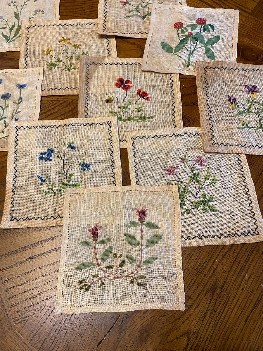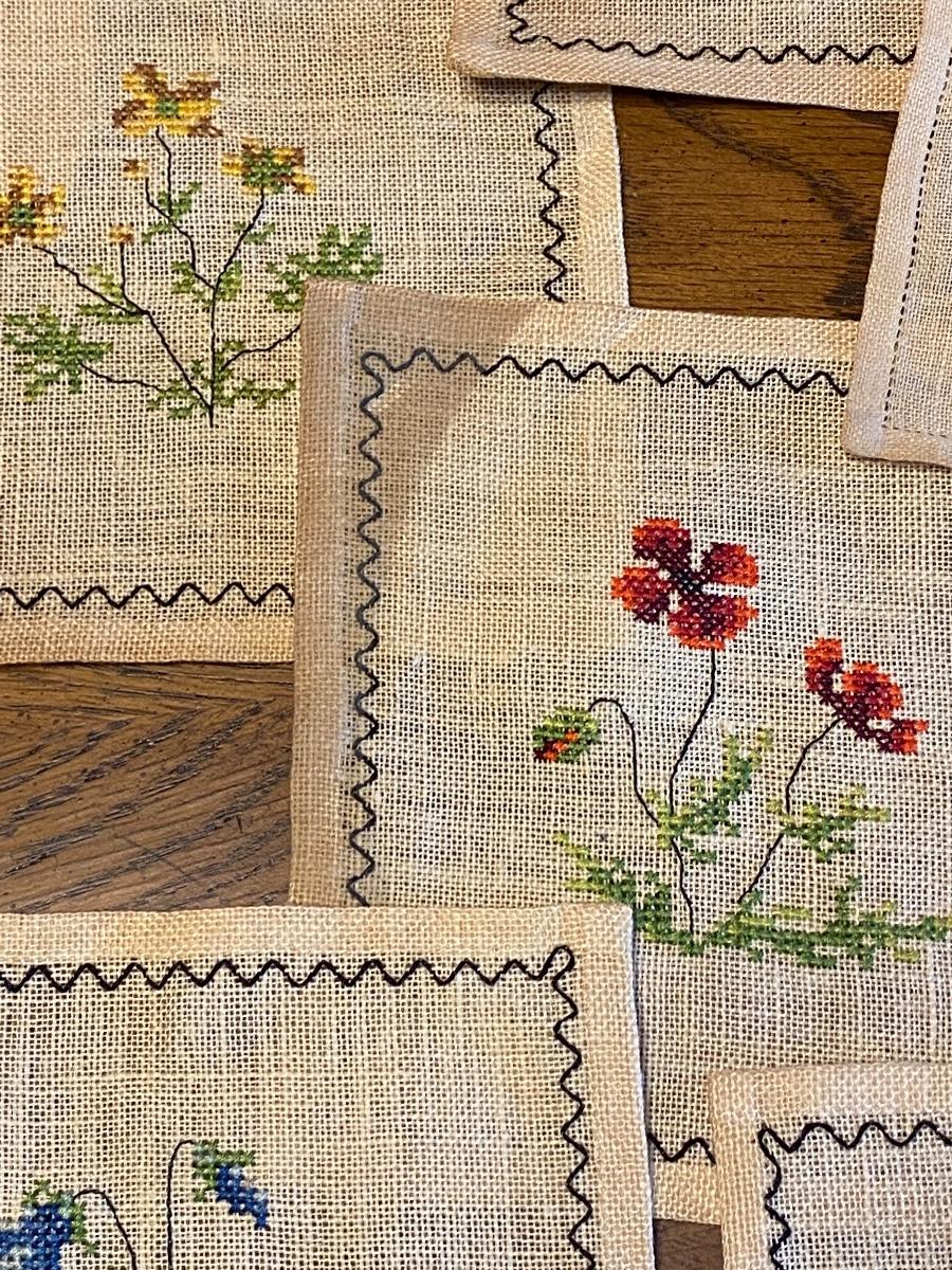Vintage Needlepoint Flower Doily Set. Could be framed. About 4" square. Some discolor, not sure if its just dust,