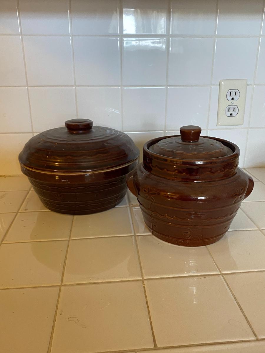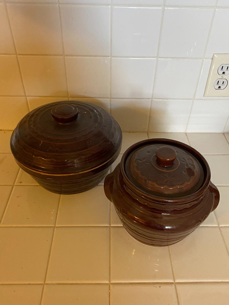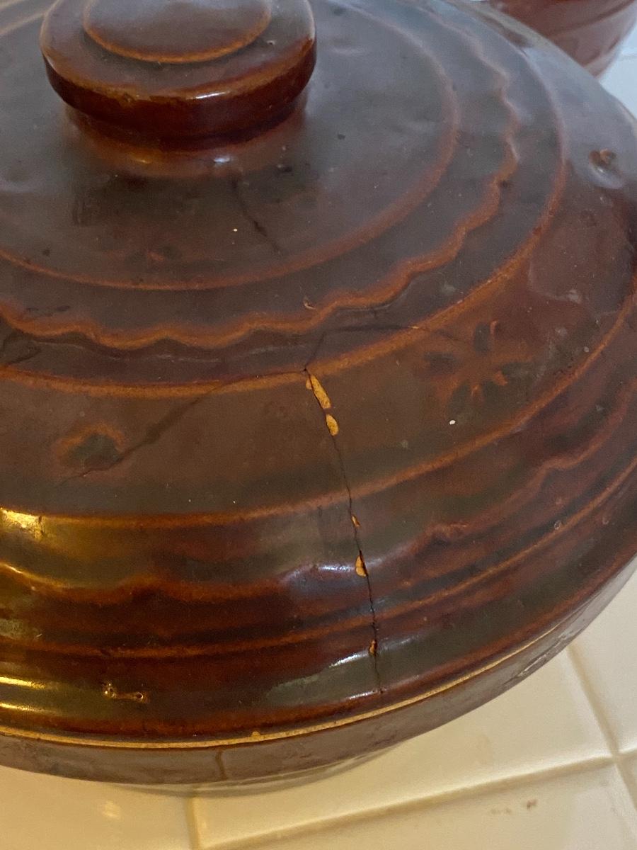 Vintage Marcrest Stoneware Dutch Oven & Cookie Biscuit Grease Jar. The dutch oven has a repaired lid. No other damage noticed.