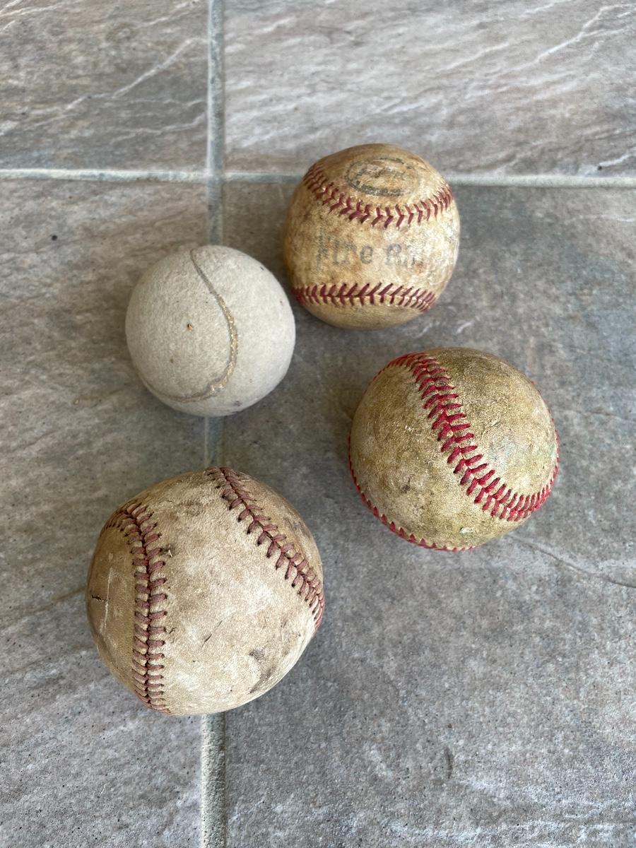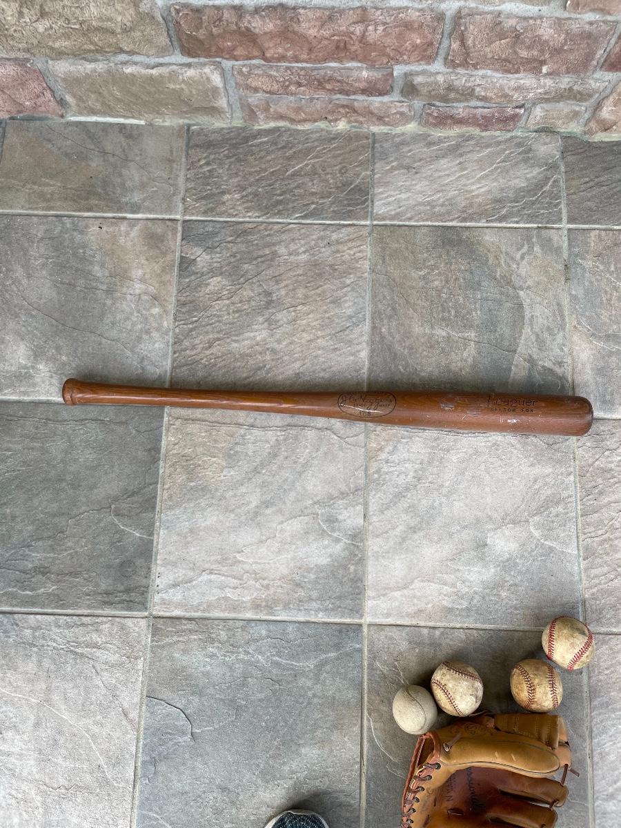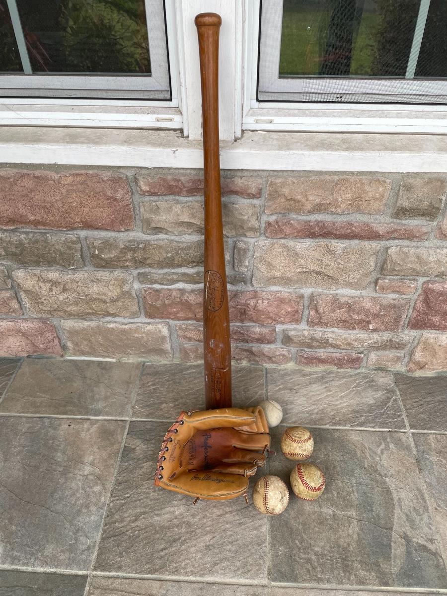 Vintage Wood Baseball Bat Glove and Balls. Used condition.