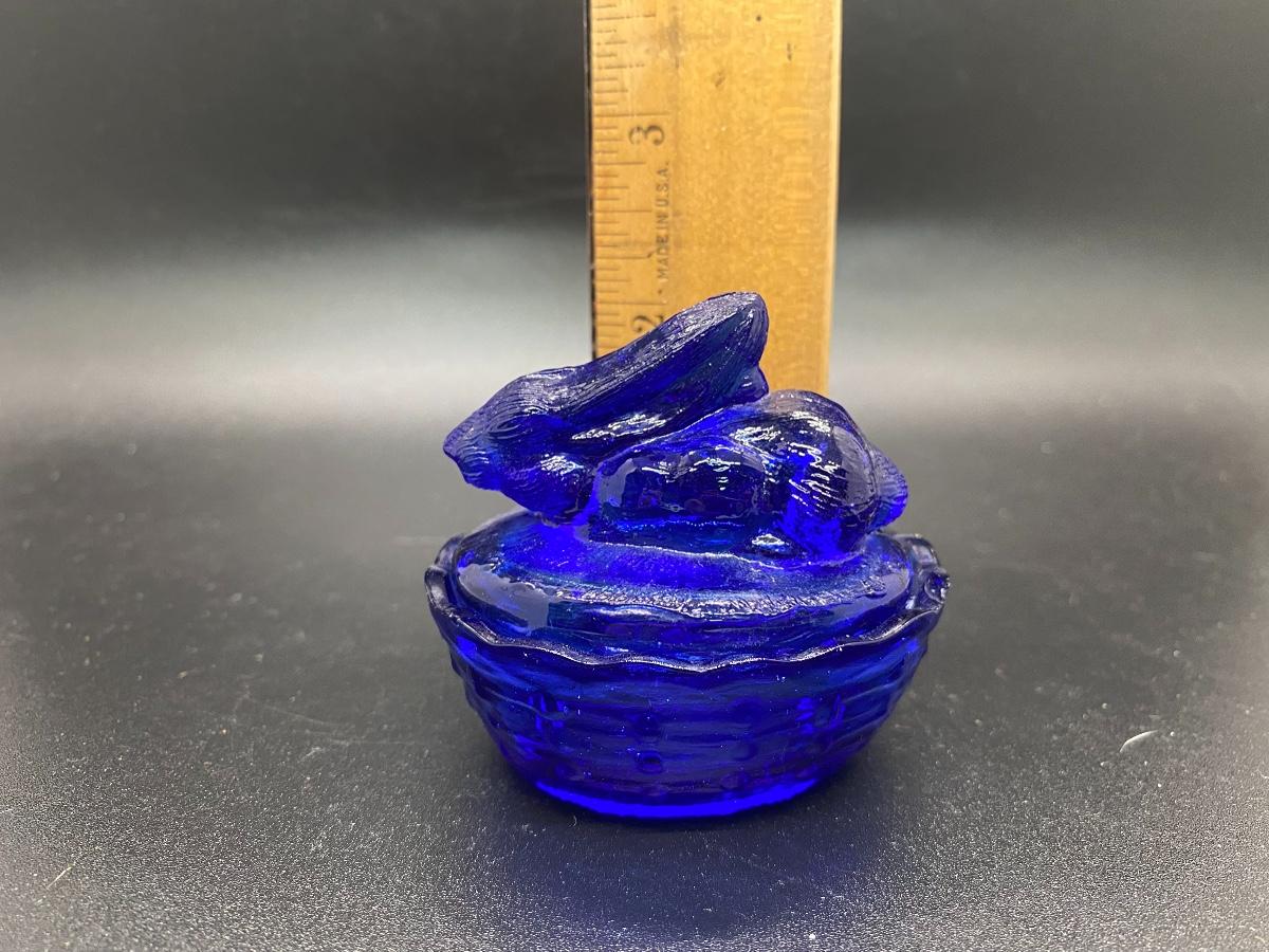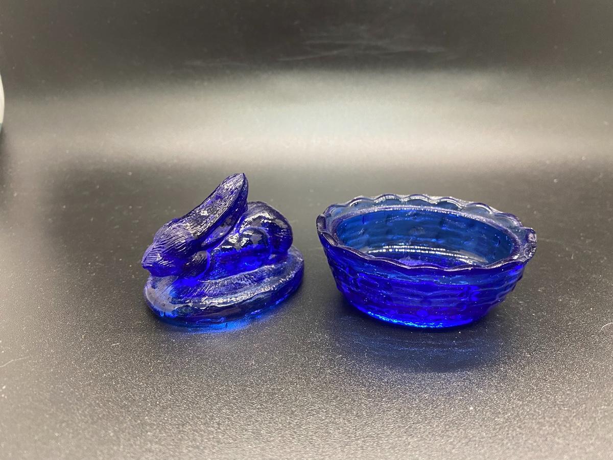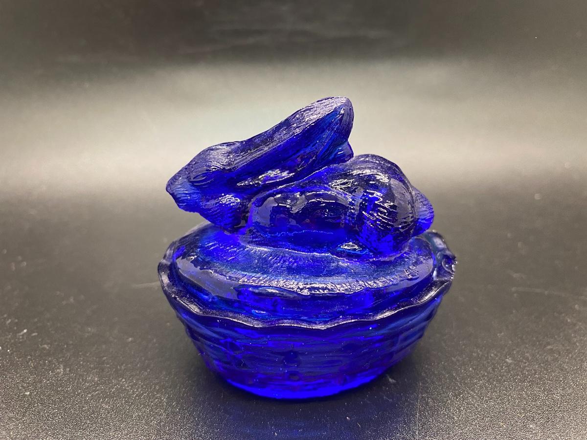 Miniature Rabbit on a Basket Glass Trinket Dish. True blue glass. There is a chip along basket edge.