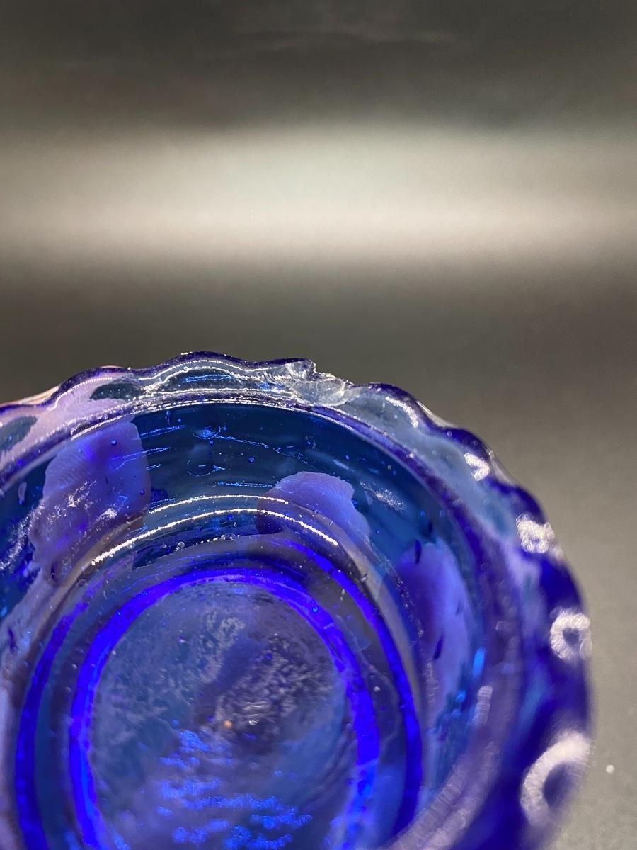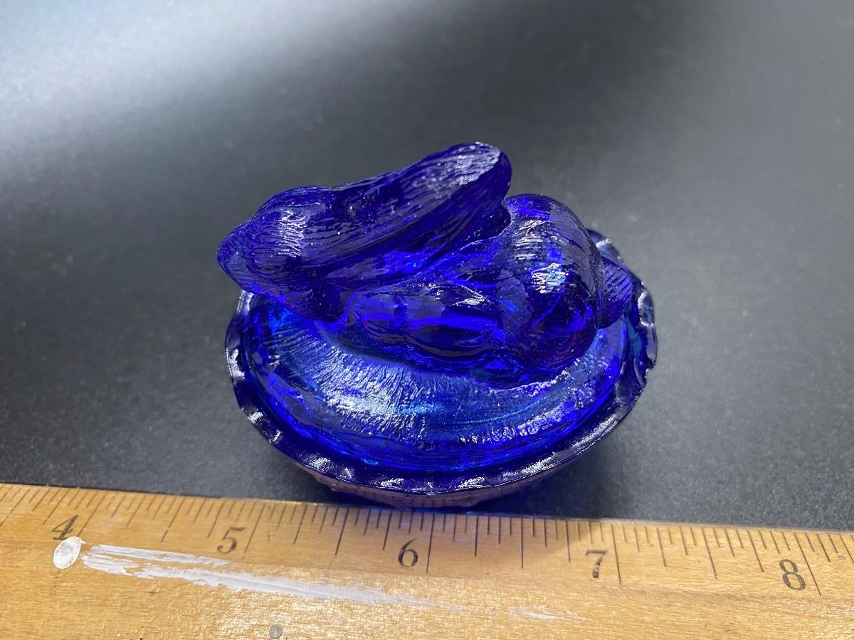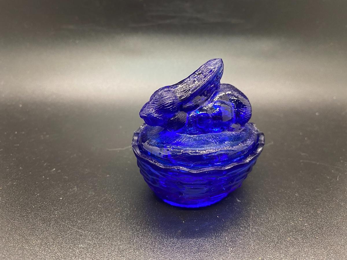 Miniature Rabbit on a Basket Glass Trinket Dish. True blue glass. There is a chip along basket edge.