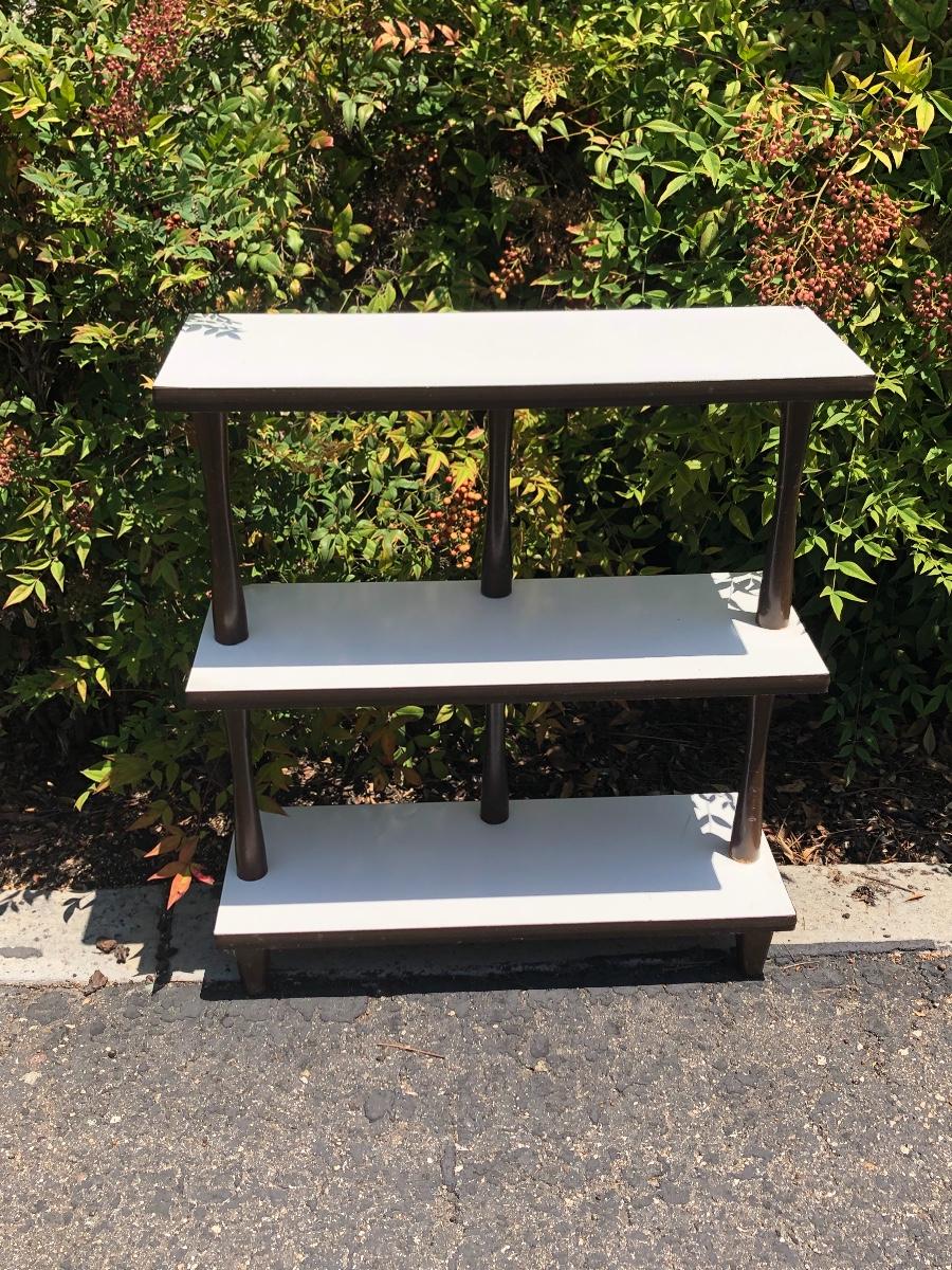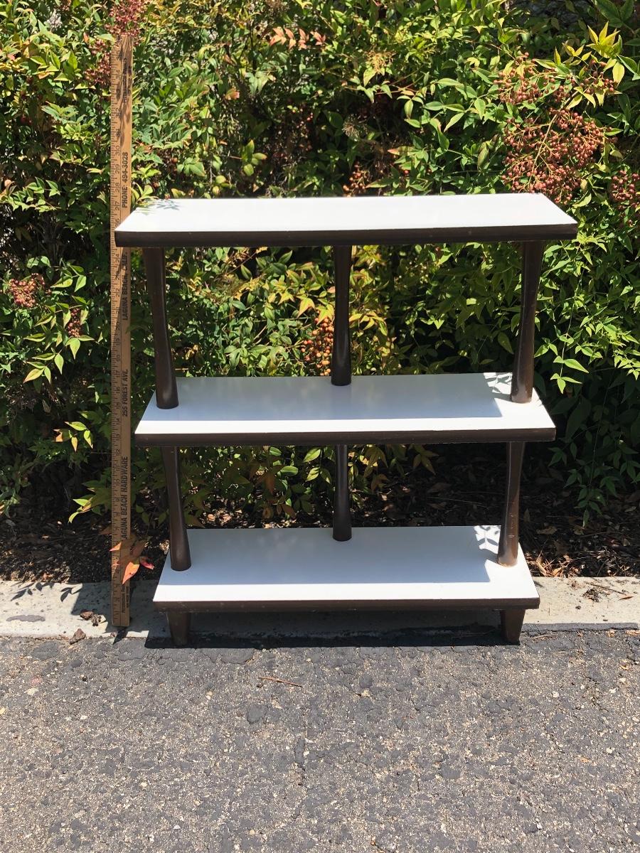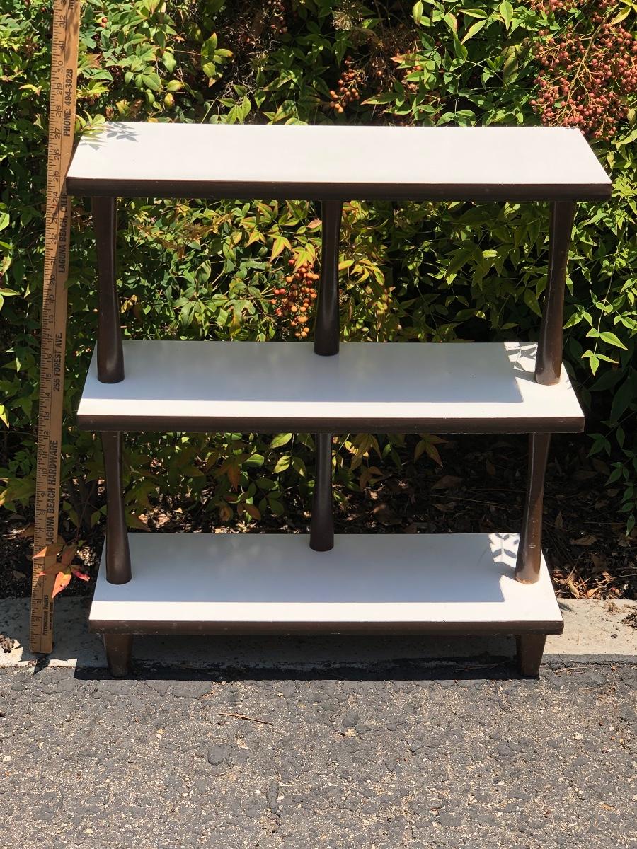 Cool white and brown three shelf book shelf. Mid Century style. In good used vintage condition. About 28" size.