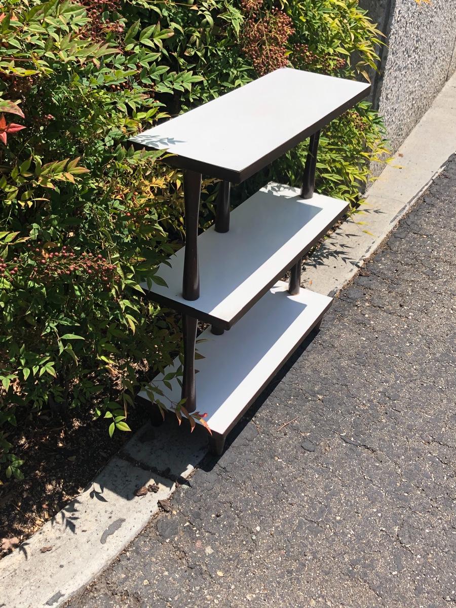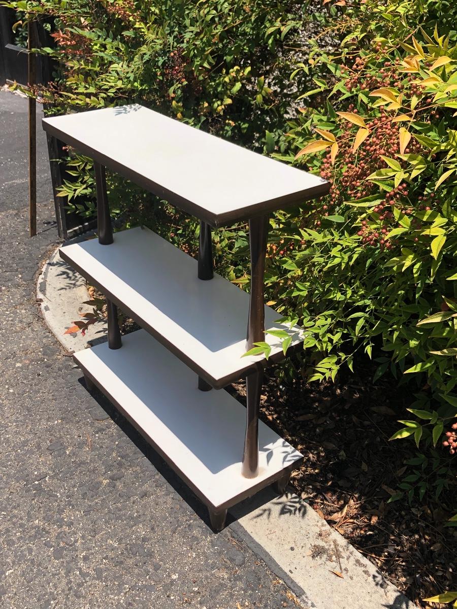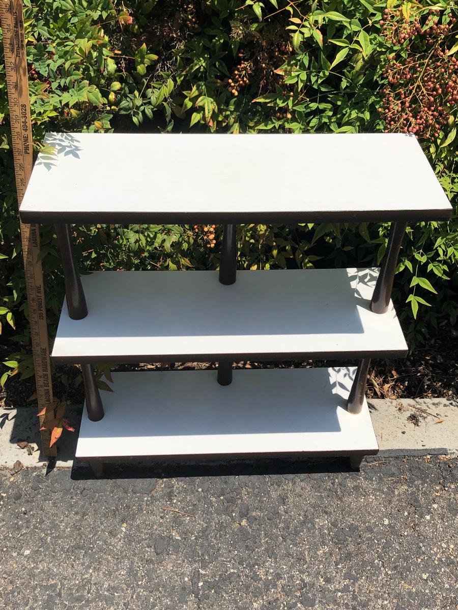 Cool white and brown three shelf book shelf. Mid Century style. In good used vintage condition. About 28" size.