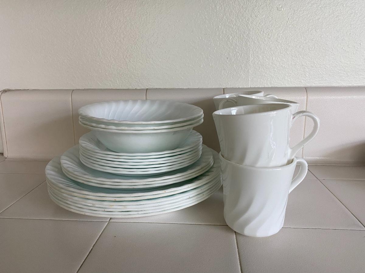 Incomplete set of white swirl Corelle dishes. In good condition. Great for adding to existing set.