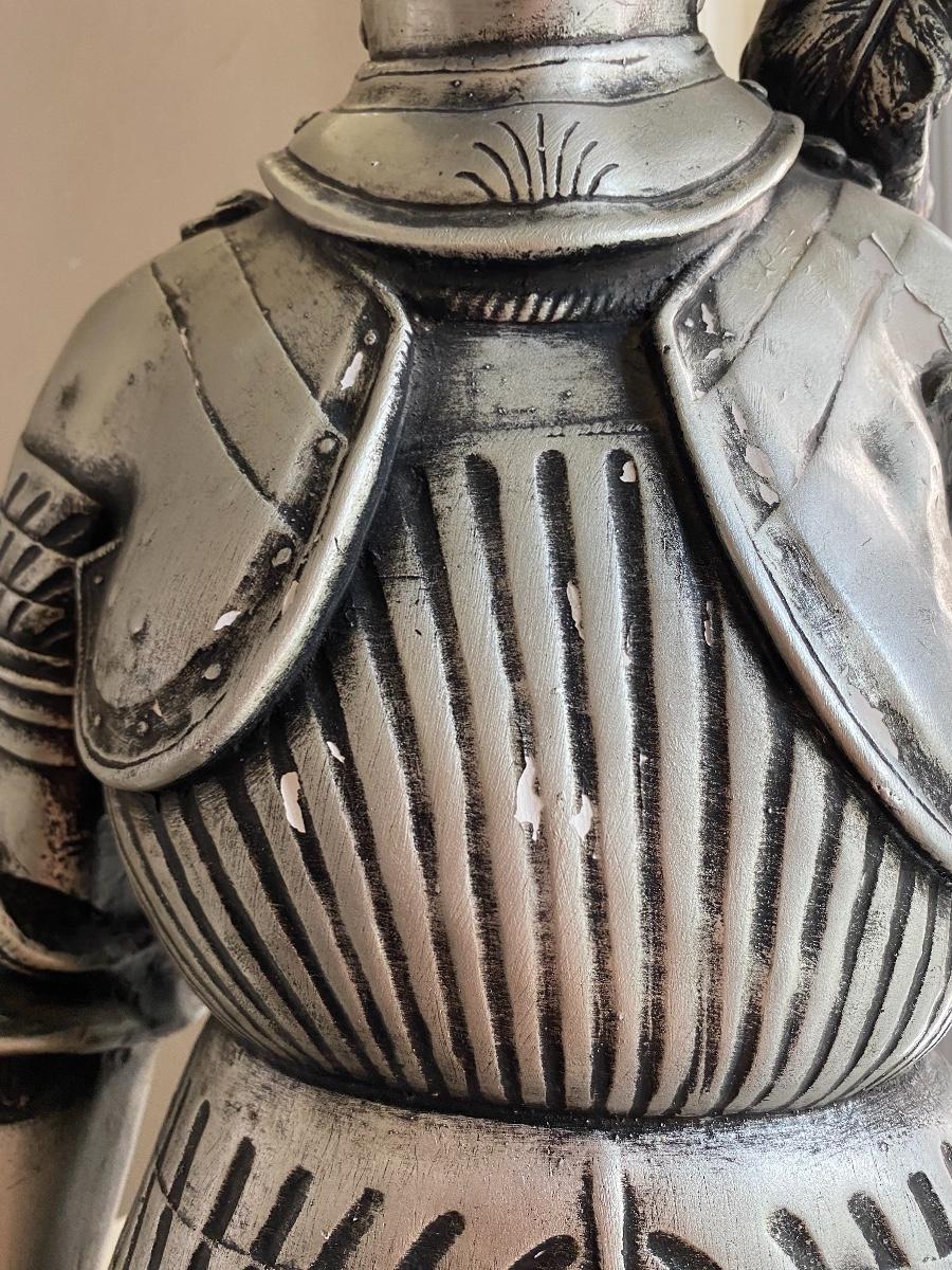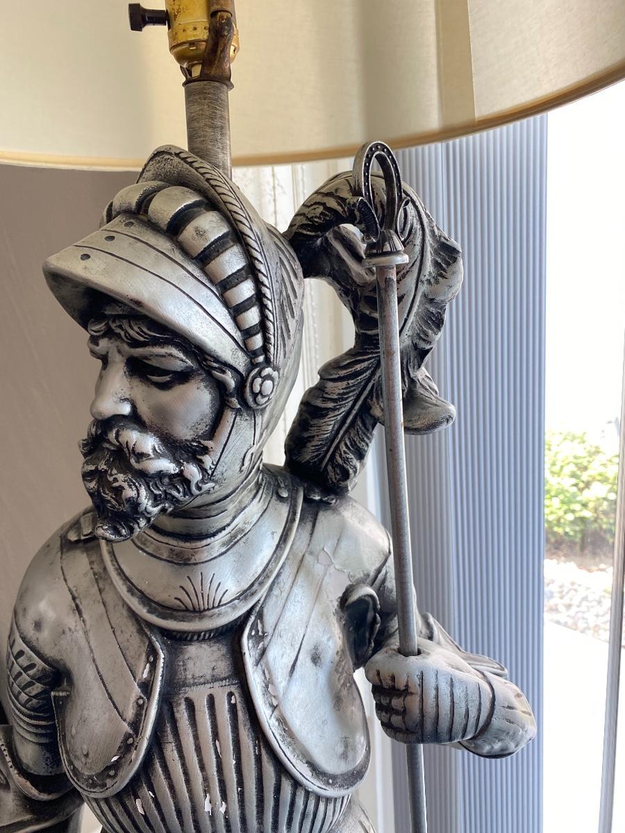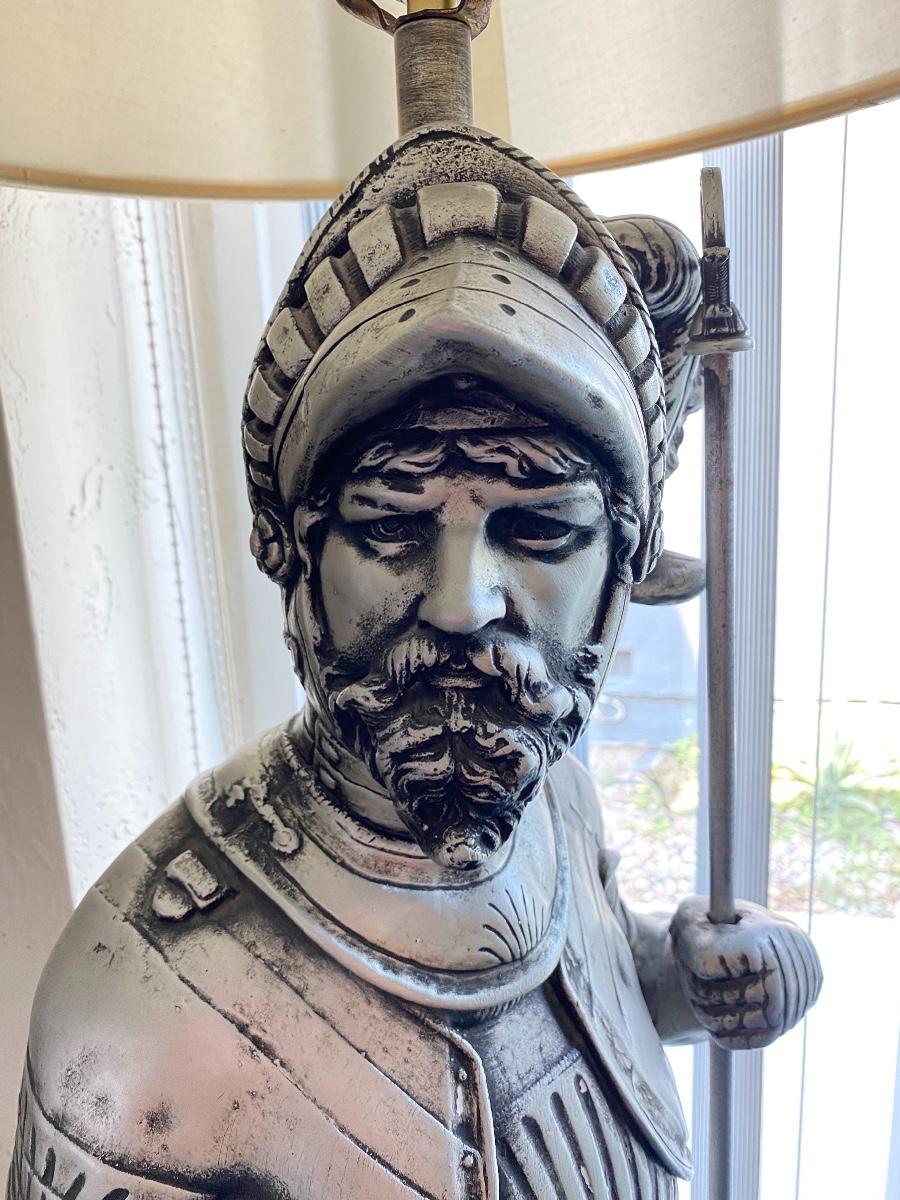 Large Vintage Bois Guilbert Spanish Soldier Knight Lamp on Pedestal Base. Plaster statue with a silver paint finish. Paint is flaking off in places. Over 6' tall with pedestal base.