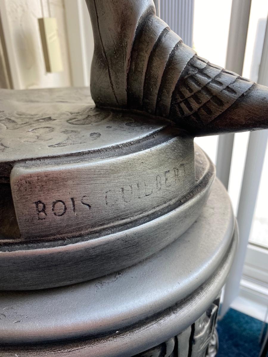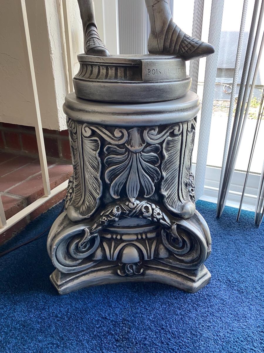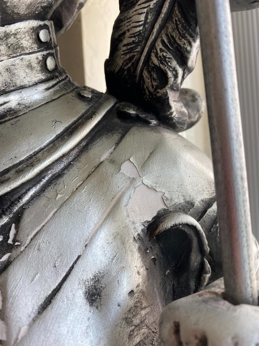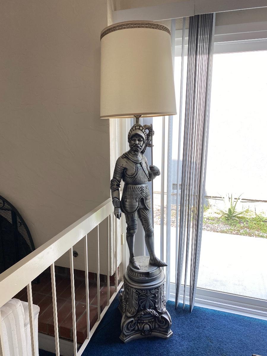 Large Vintage Bois Guilbert Spanish Soldier Knight Lamp on Pedestal Base. Plaster statue with a silver paint finish. Paint is flaking off in places. Over 6' tall with pedestal base.