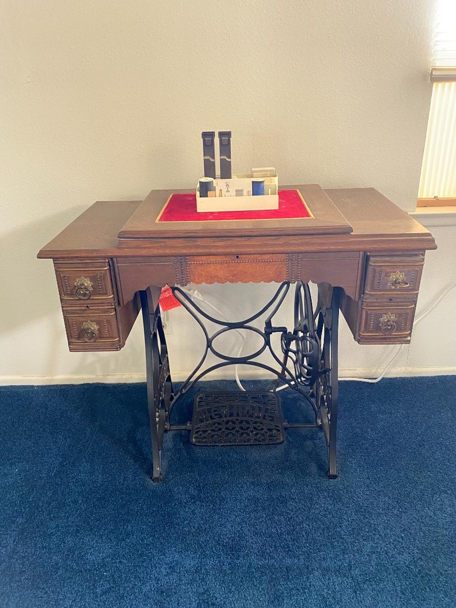 Vintage New Home treadle sewing machine table and sewing accessories. No machine included. Table is in good vintage condition. Great for decor or add a machine to use for sewing.