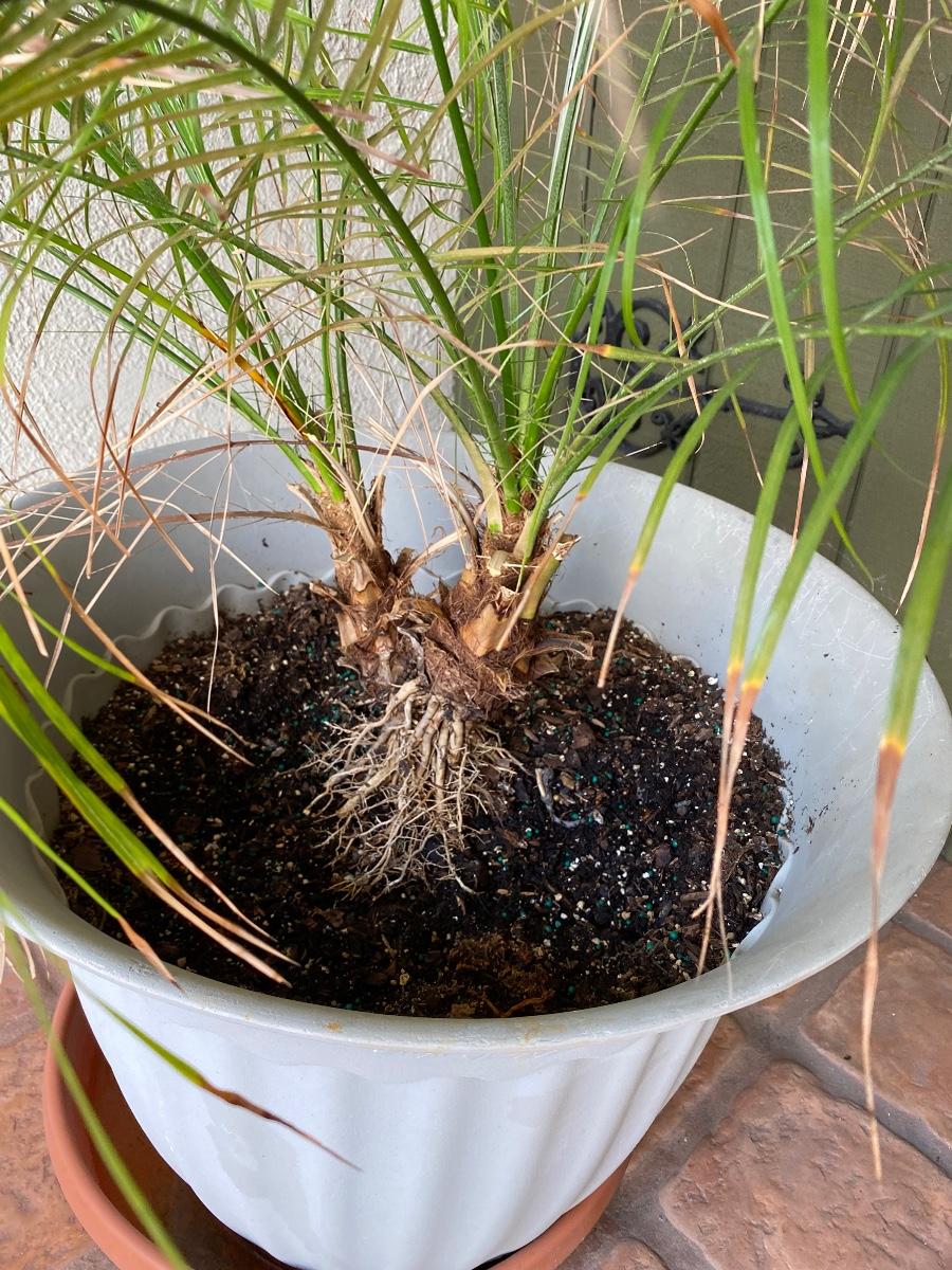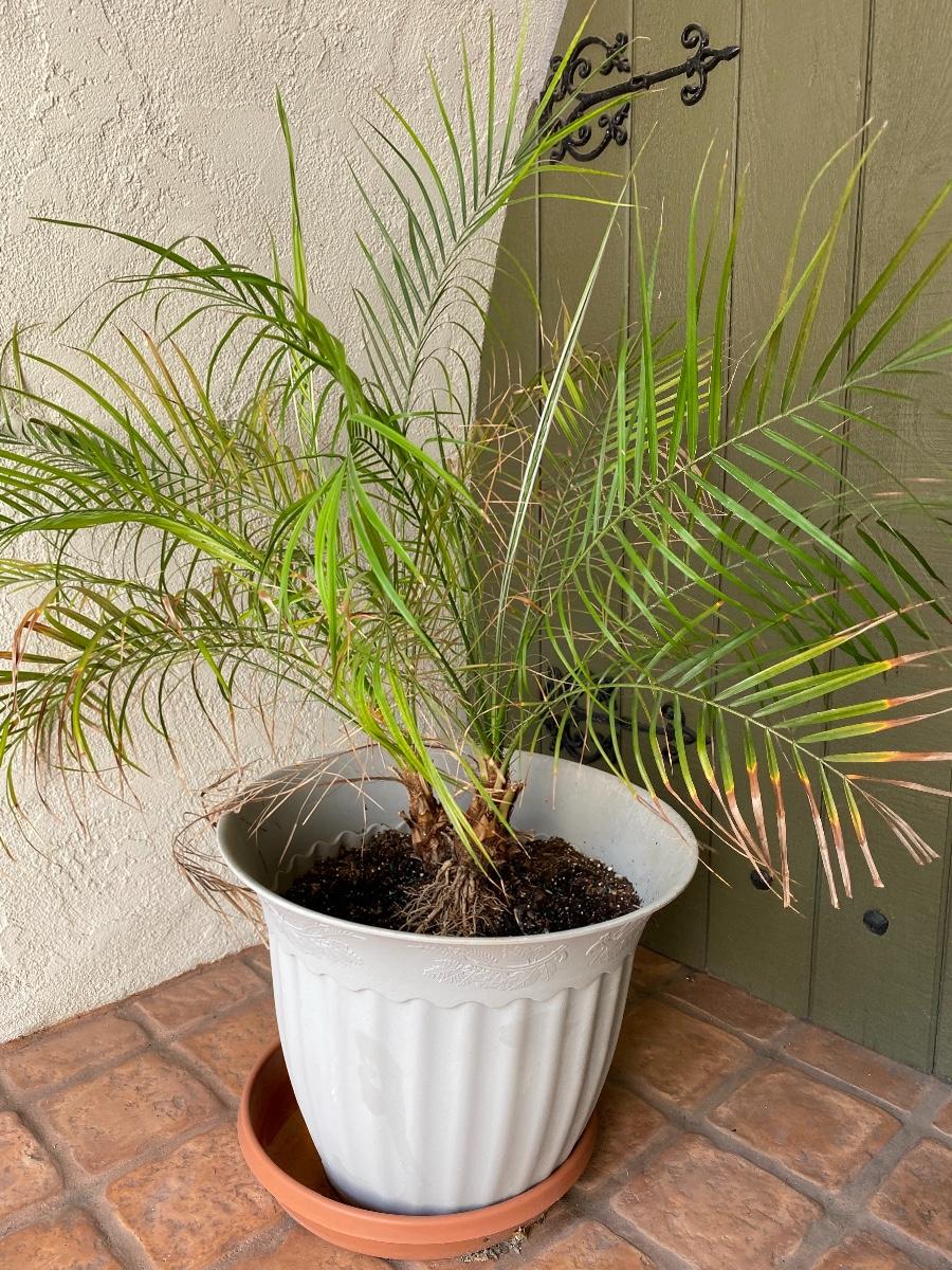 Small Potted Palm Tree. Tree needs to be repotted, planted or more dirt added to existing pot. but looks to be in good condition.