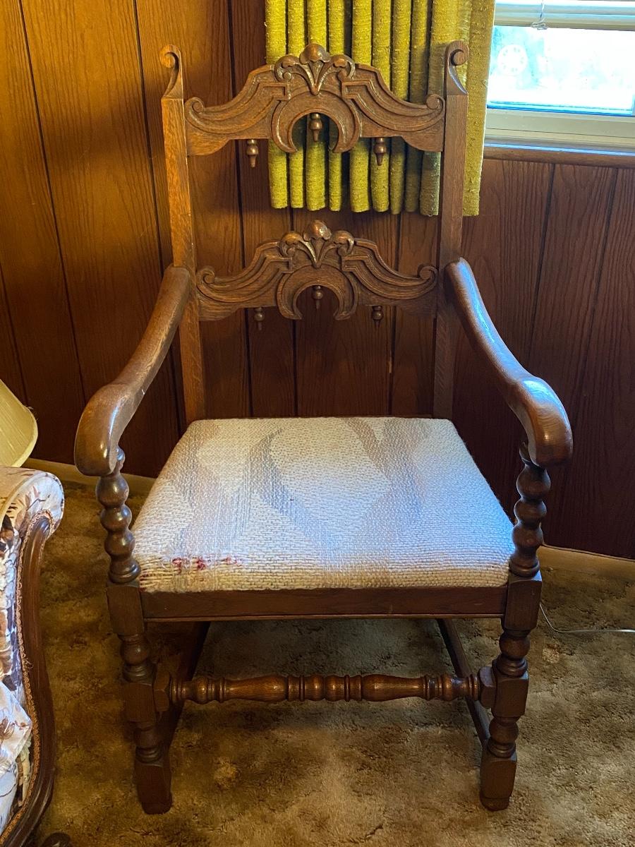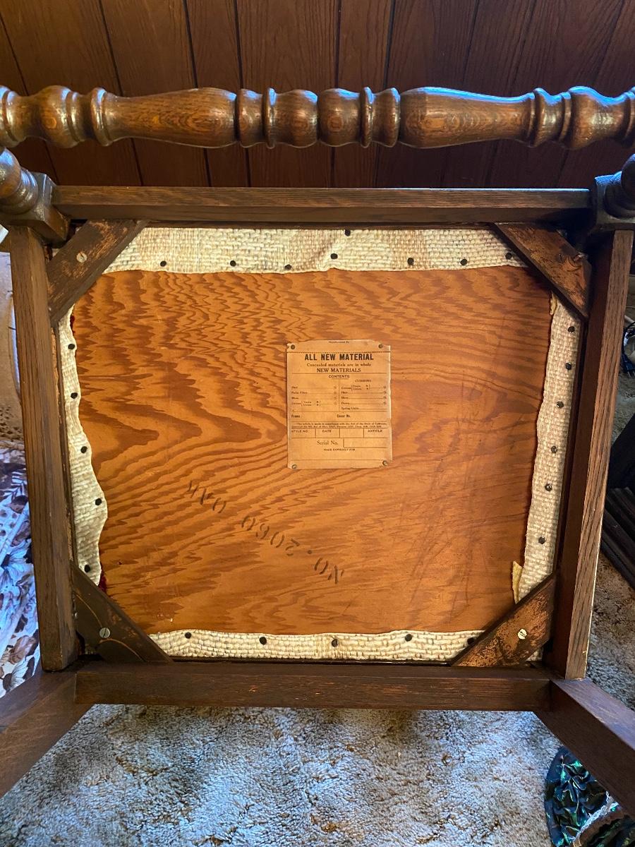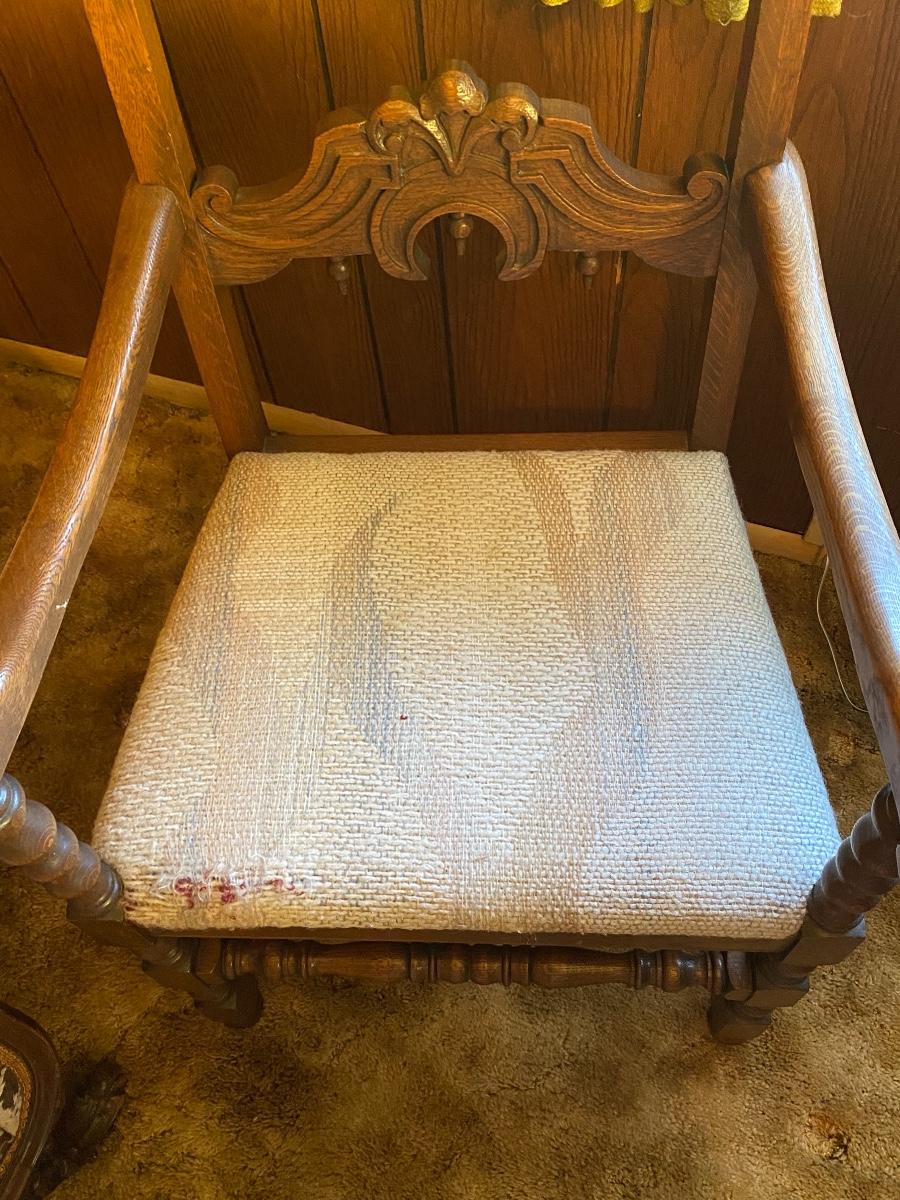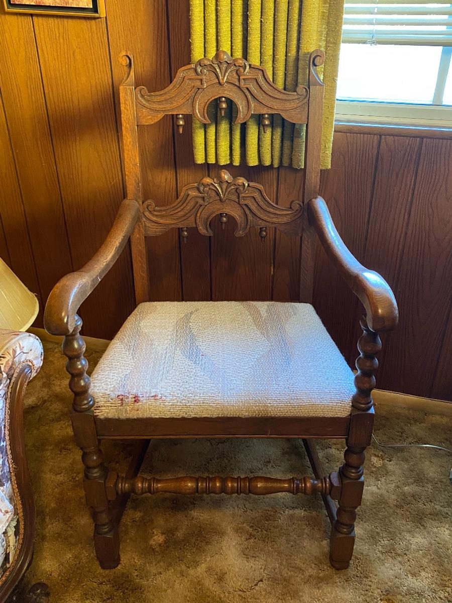 Antique Cushioned Armed Side Chair. It has been reupholstered. The tag on bottom has the date of 1929 on it. In good condition except needs to be reupholstered again.