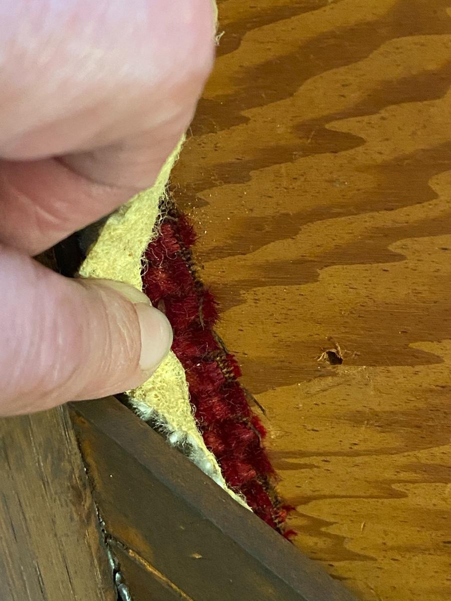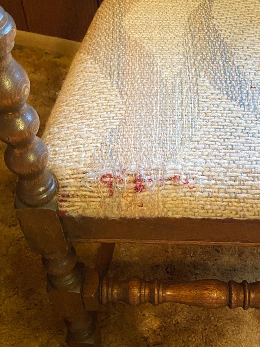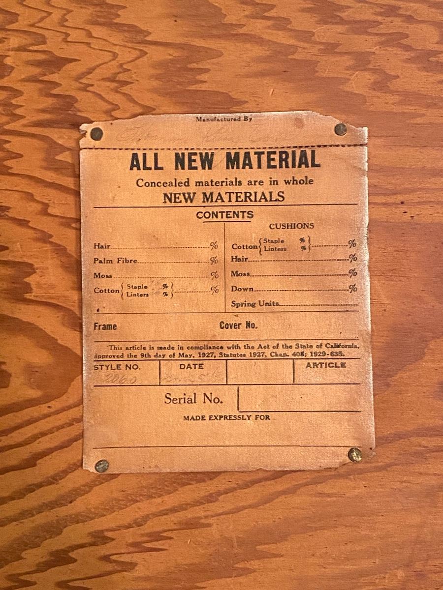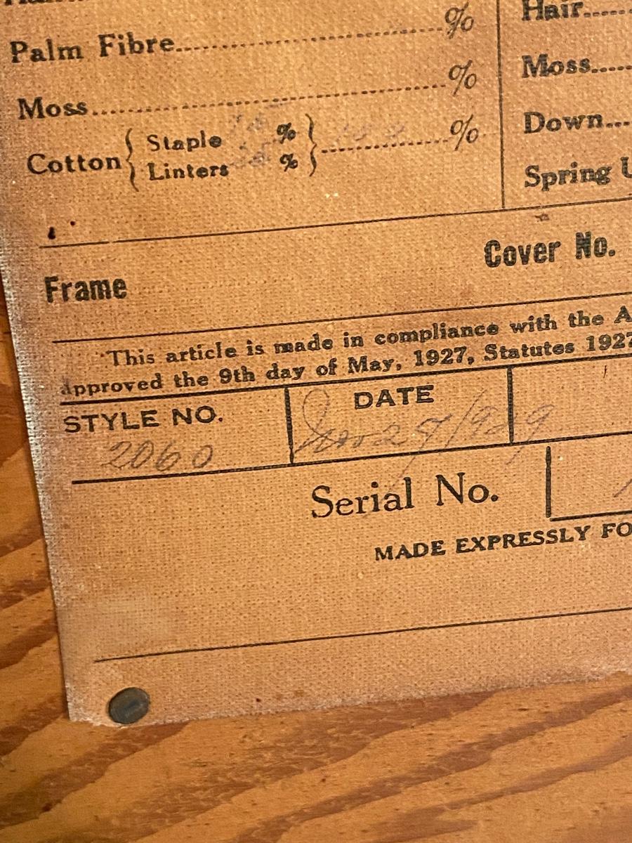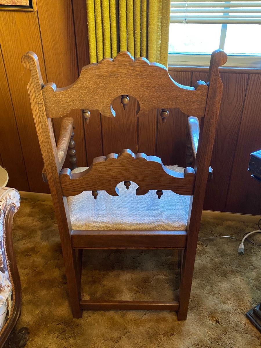 Antique Cushioned Armed Side Chair. It has been reupholstered. The tag on bottom has the date of 1929 on it. In good condition except needs to be reupholstered again.