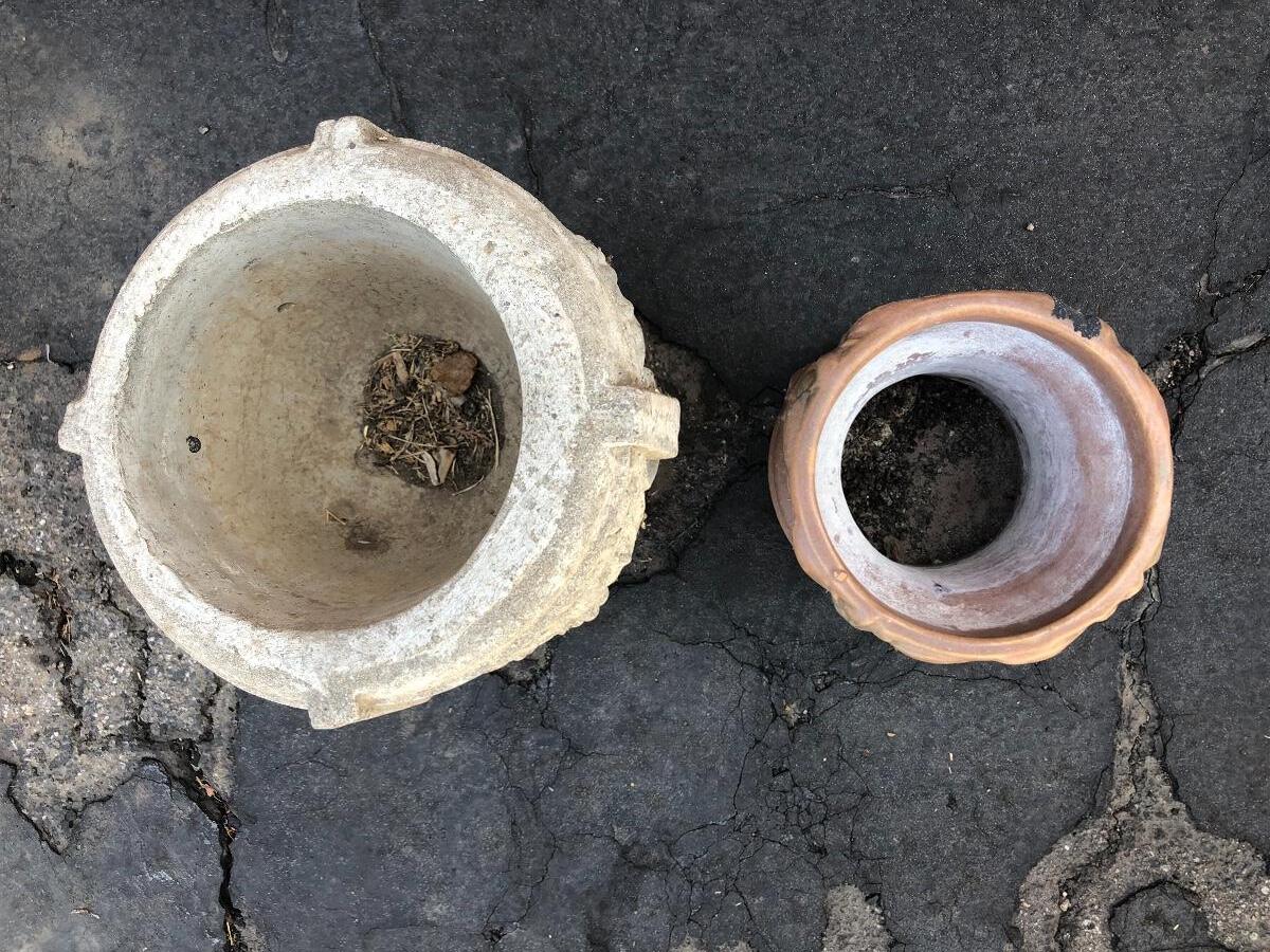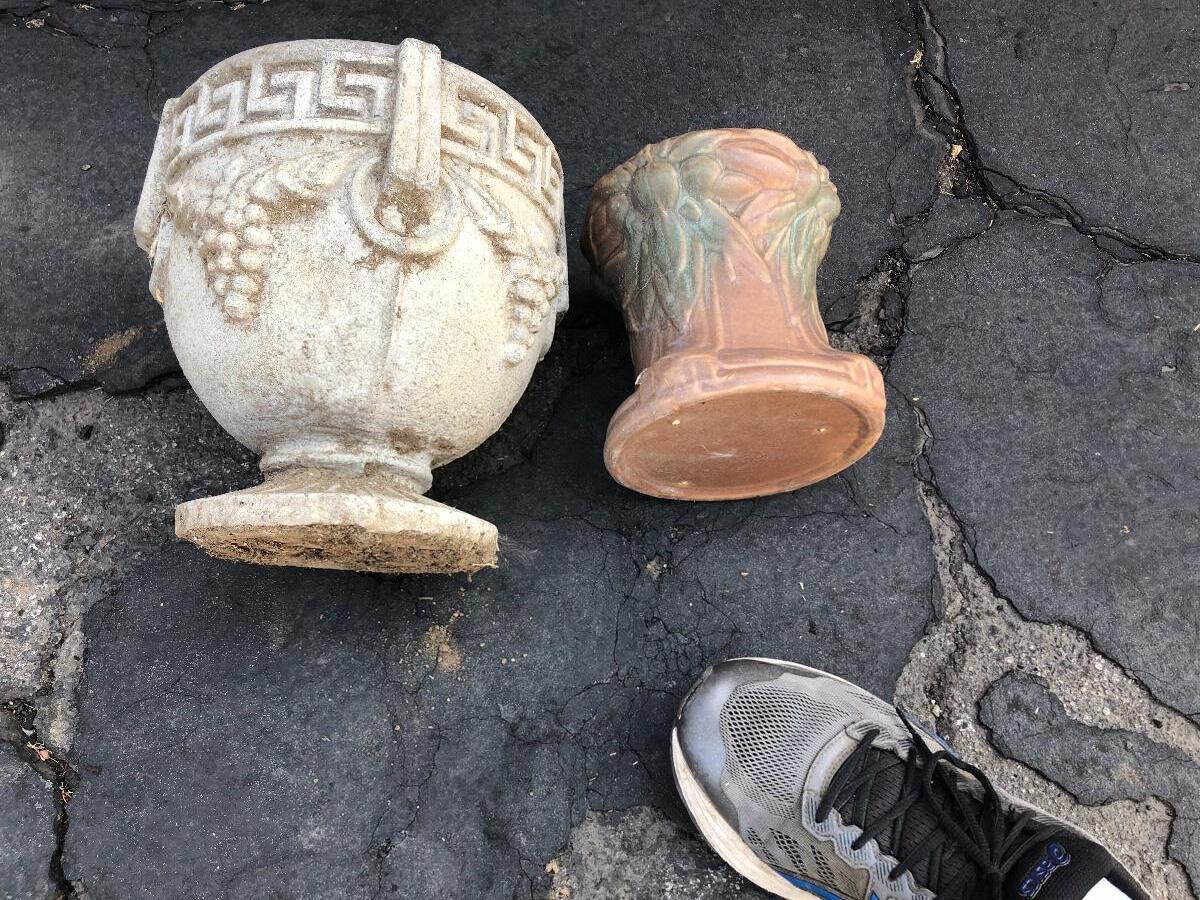 Pair of Weathered Planter Pots. In good outdoor condition.