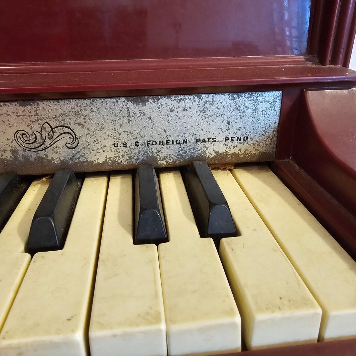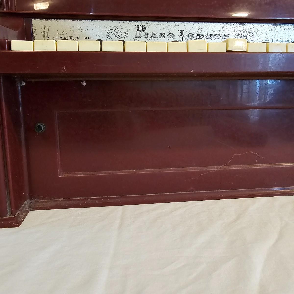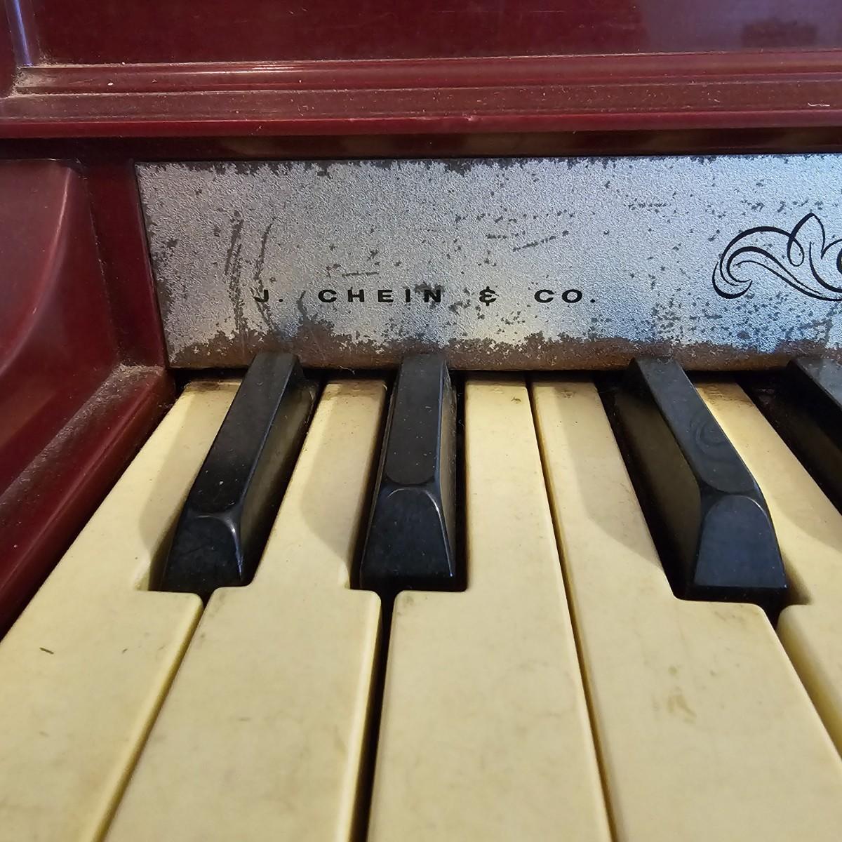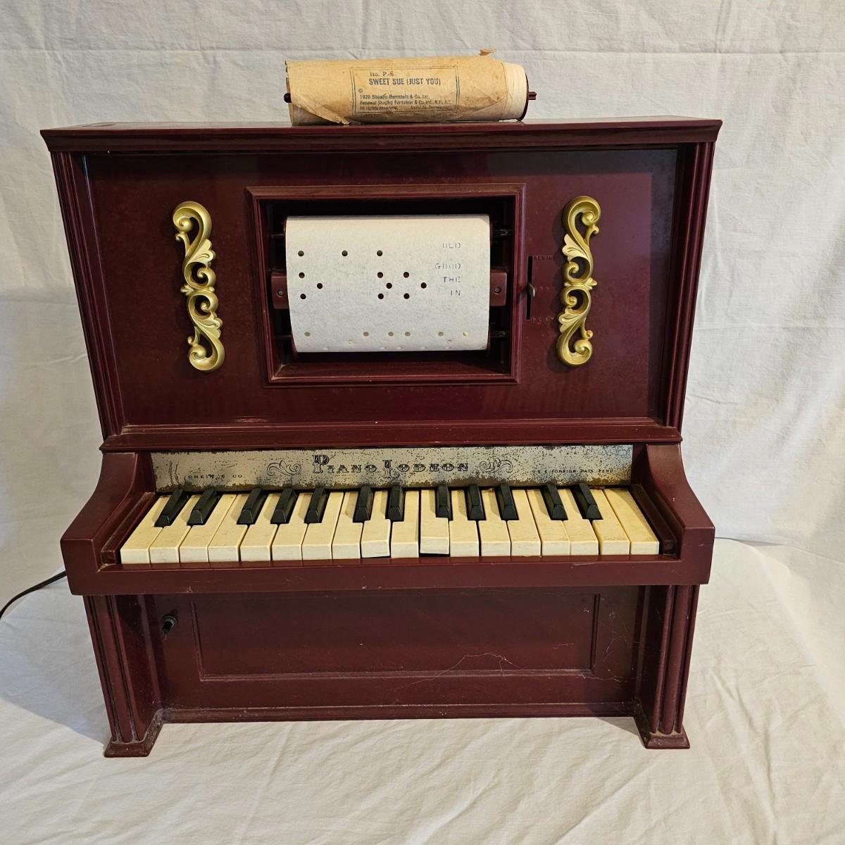 A vintage child's player piano and two song rolls. Made by the J. Chien Co. Piano case is dark maroon plastic with wooden back. Keyboard has some lifted keys, and one black key on left is frozen. Name plate on front is scratched and worn. Piano measures 20.5" x 10" x 20"H, powered on when plugged in. Control lever lets scroll move forward to play and backwards to rewind. Songs are 'The Good Old Summertime' and 'Sweet Sue (Just You)'. See photos for details. Shipping available.