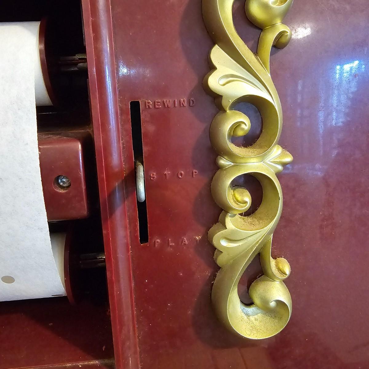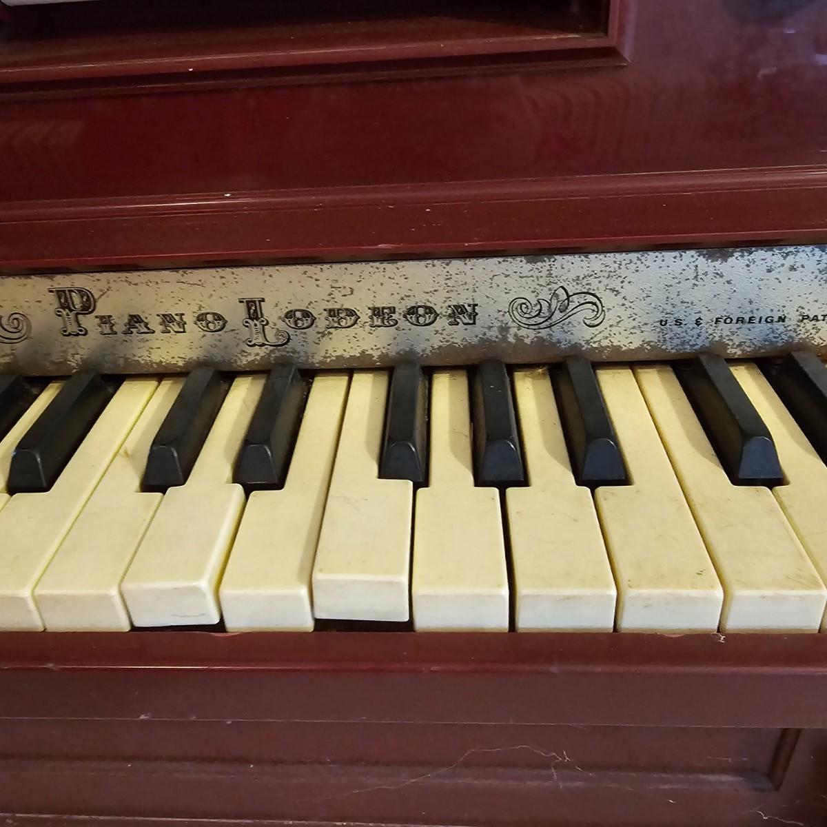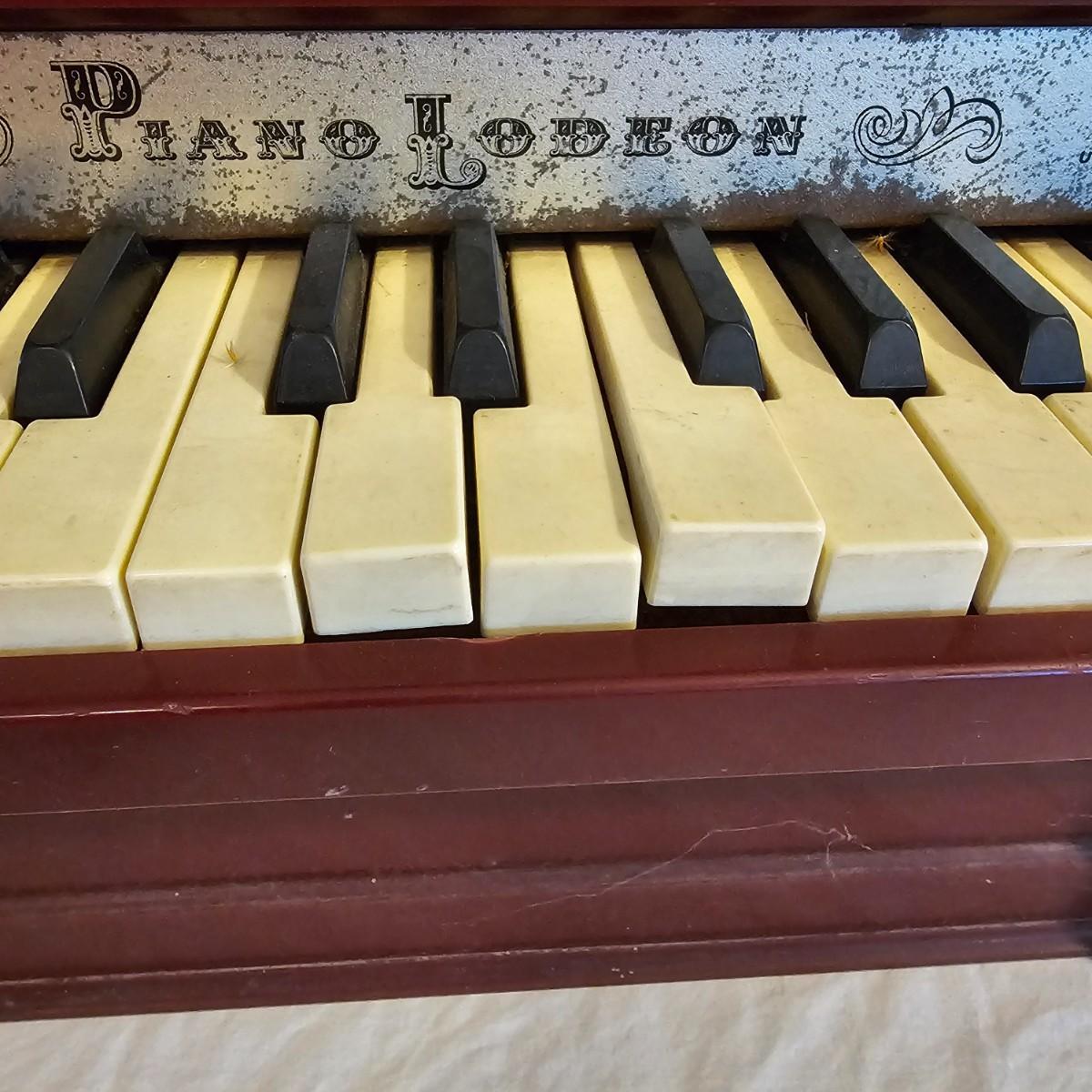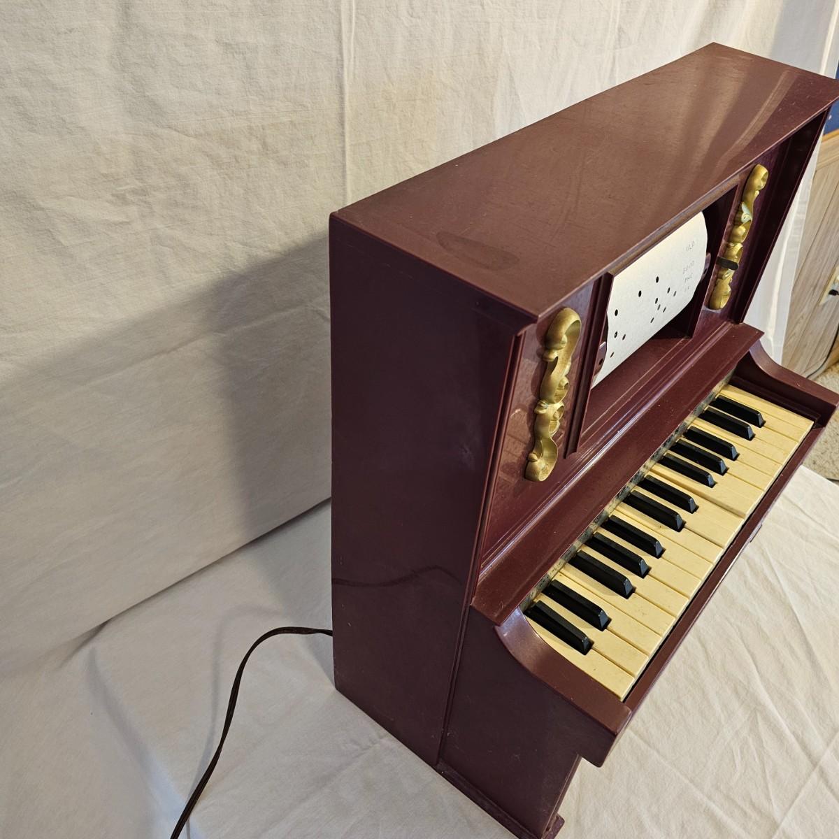 A vintage child's player piano and two song rolls. Made by the J. Chien Co. Piano case is dark maroon plastic with wooden back. Keyboard has some lifted keys, and one black key on left is frozen. Name plate on front is scratched and worn. Piano measures 20.5" x 10" x 20"H, powered on when plugged in. Control lever lets scroll move forward to play and backwards to rewind. Songs are 'The Good Old Summertime' and 'Sweet Sue (Just You)'. See photos for details. Shipping available.