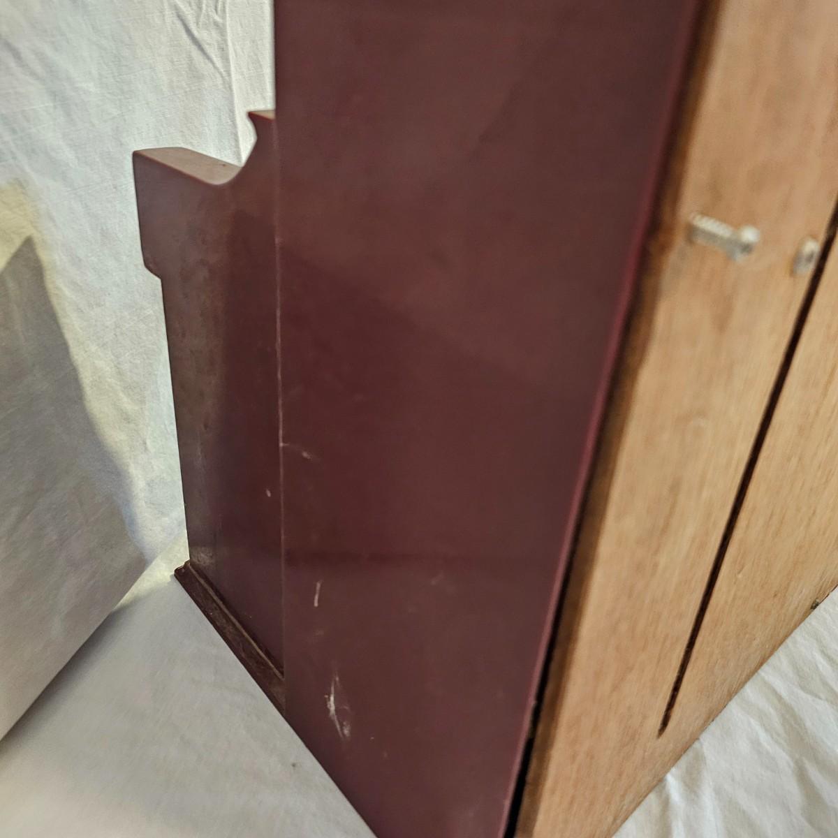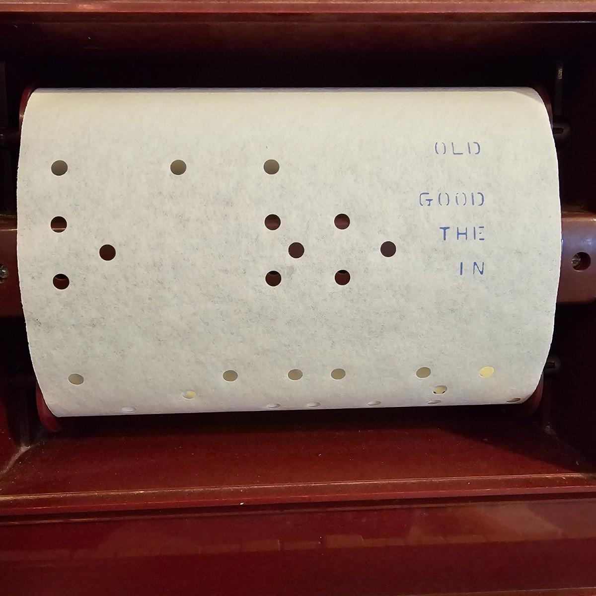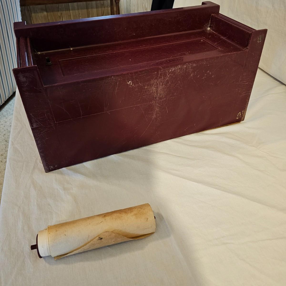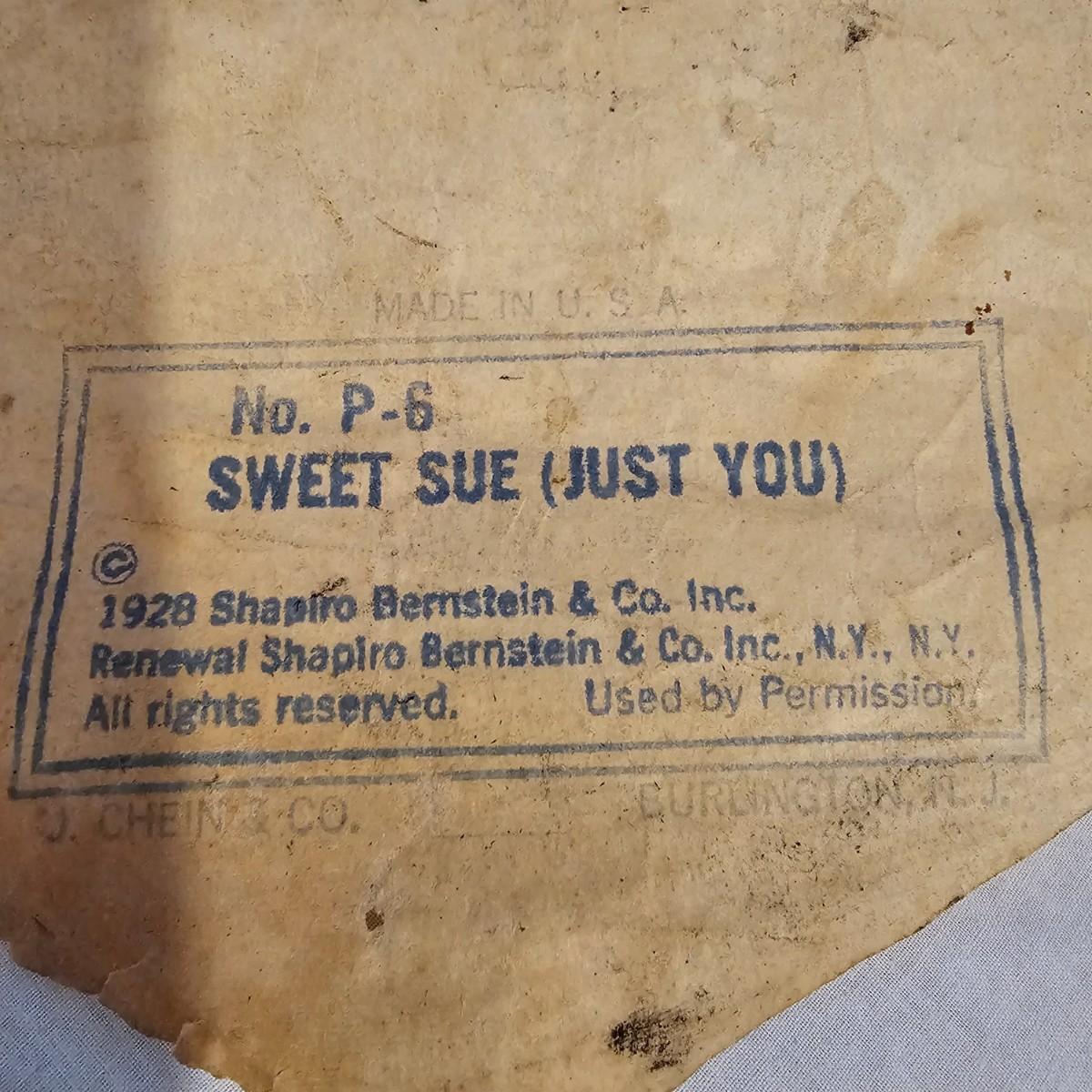 A vintage child's player piano and two song rolls. Made by the J. Chien Co. Piano case is dark maroon plastic with wooden back. Keyboard has some lifted keys, and one black key on left is frozen. Name plate on front is scratched and worn. Piano measures 20.5" x 10" x 20"H, powered on when plugged in. Control lever lets scroll move forward to play and backwards to rewind. Songs are 'The Good Old Summertime' and 'Sweet Sue (Just You)'. See photos for details. Shipping available.