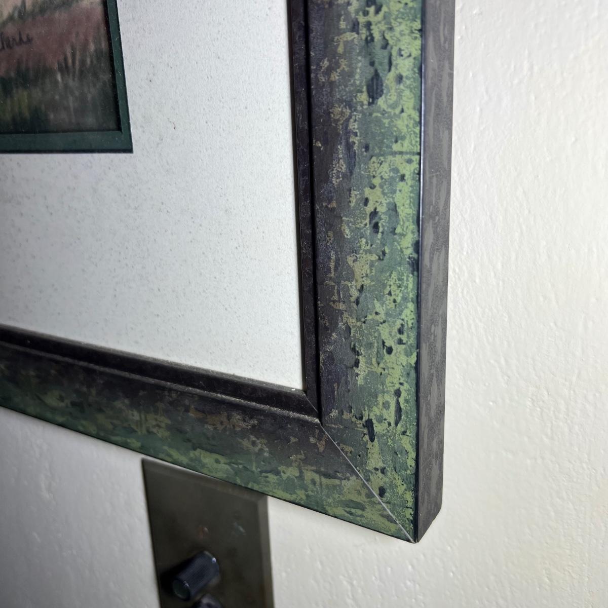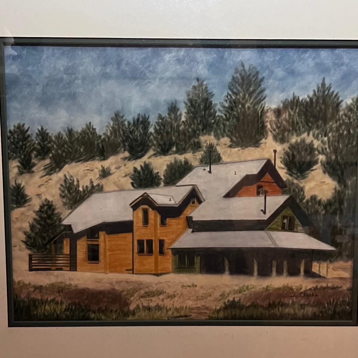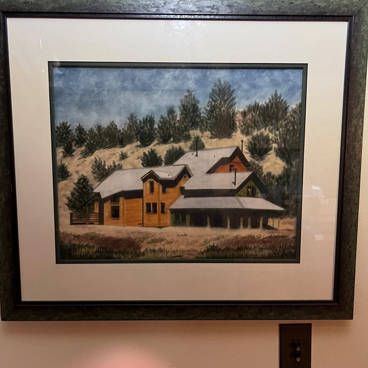This ranch home painting is signed. It's possibly a pastel. It is under glass, matted and in an attractive green wood frame. It has some light dirt on the back and some light marks that appear to be under the glass on the matt; this piece was stored in a basement. See images with light which shows the marks.