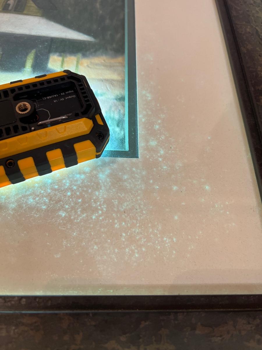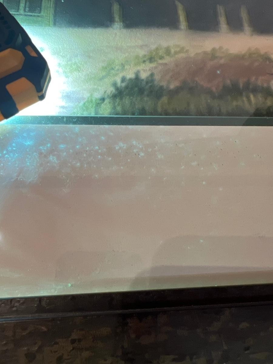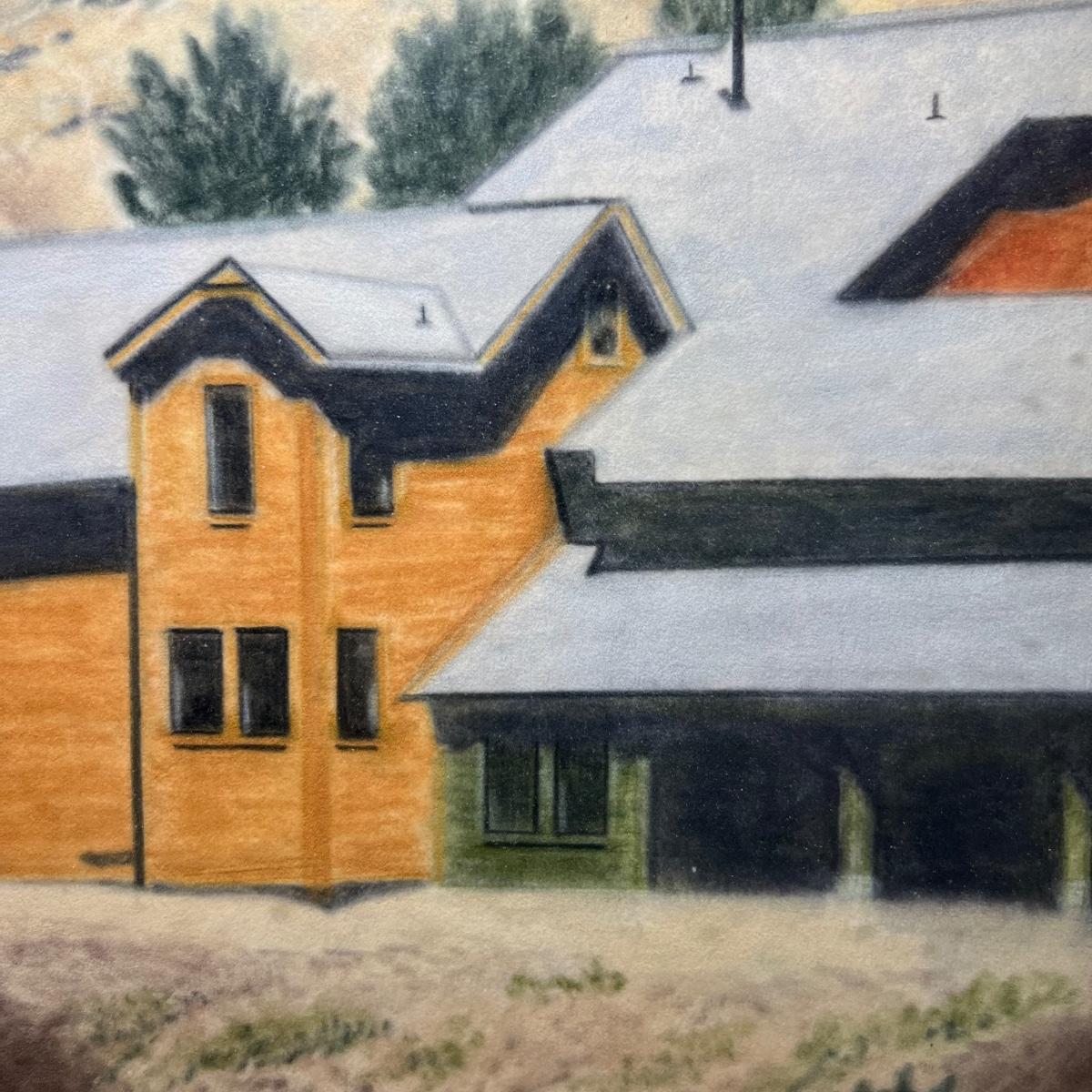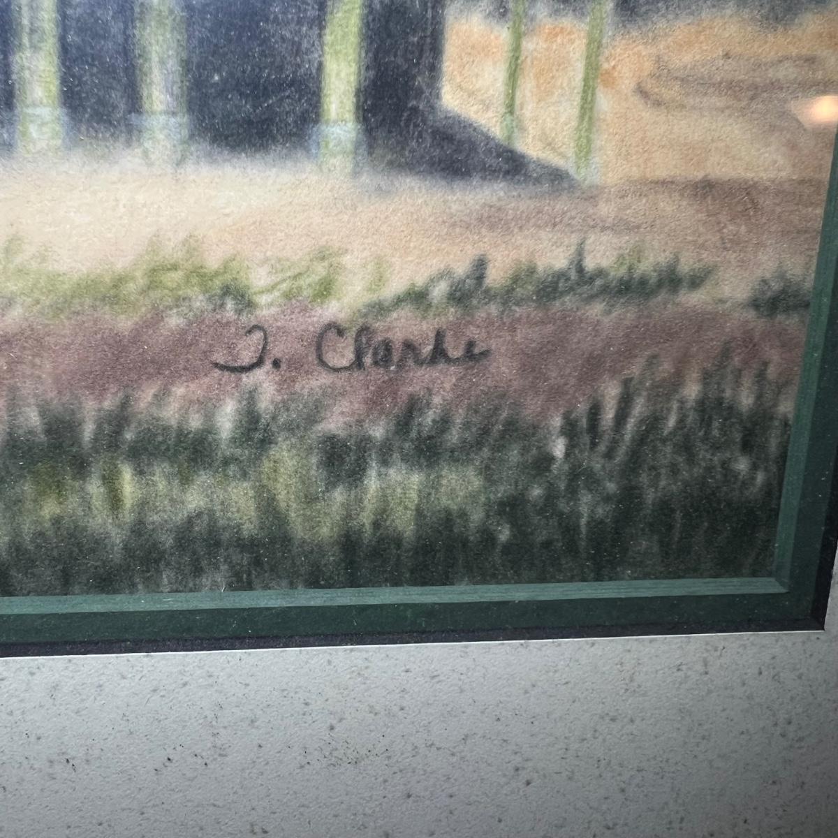 This ranch home painting is signed. It's possibly a pastel. It is under glass, matted and in an attractive green wood frame. It has some light dirt on the back and some light marks that appear to be under the glass on the matt; this piece was stored in a basement. See images with light which shows the marks.