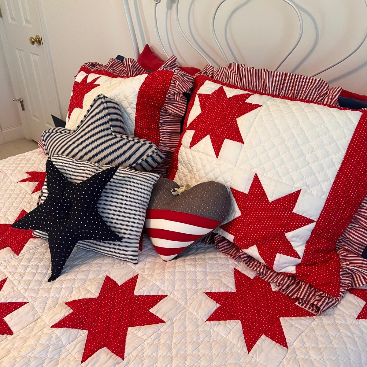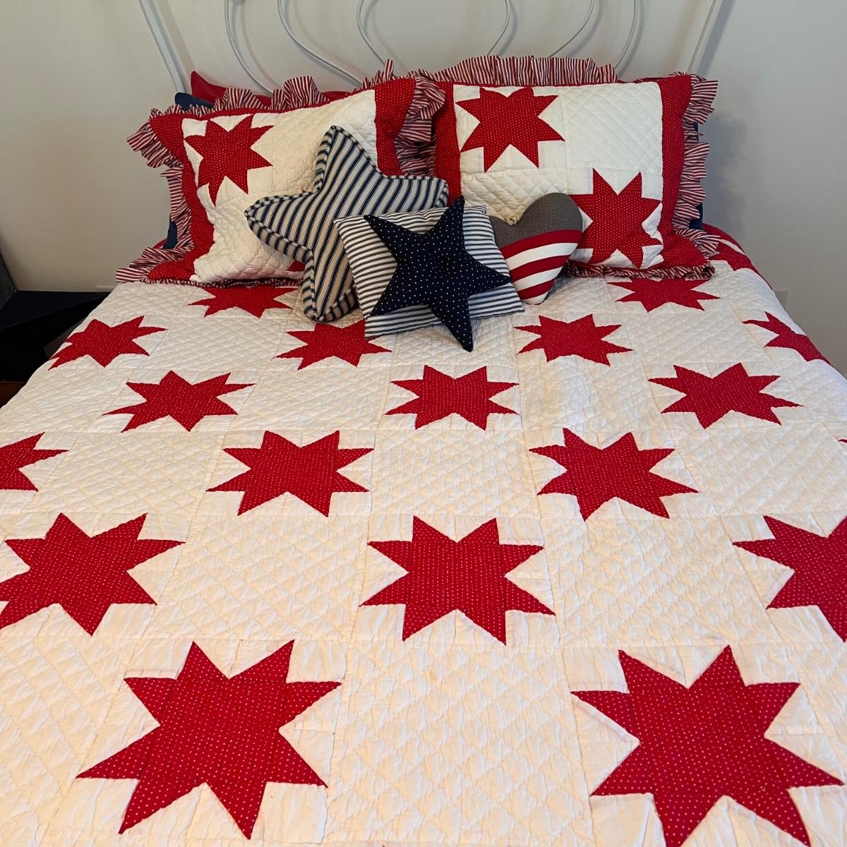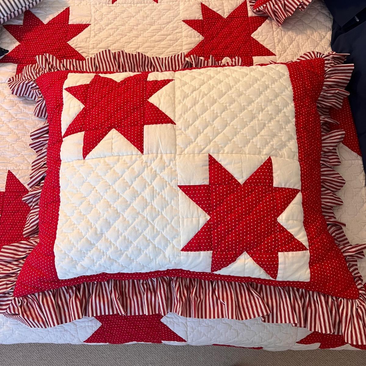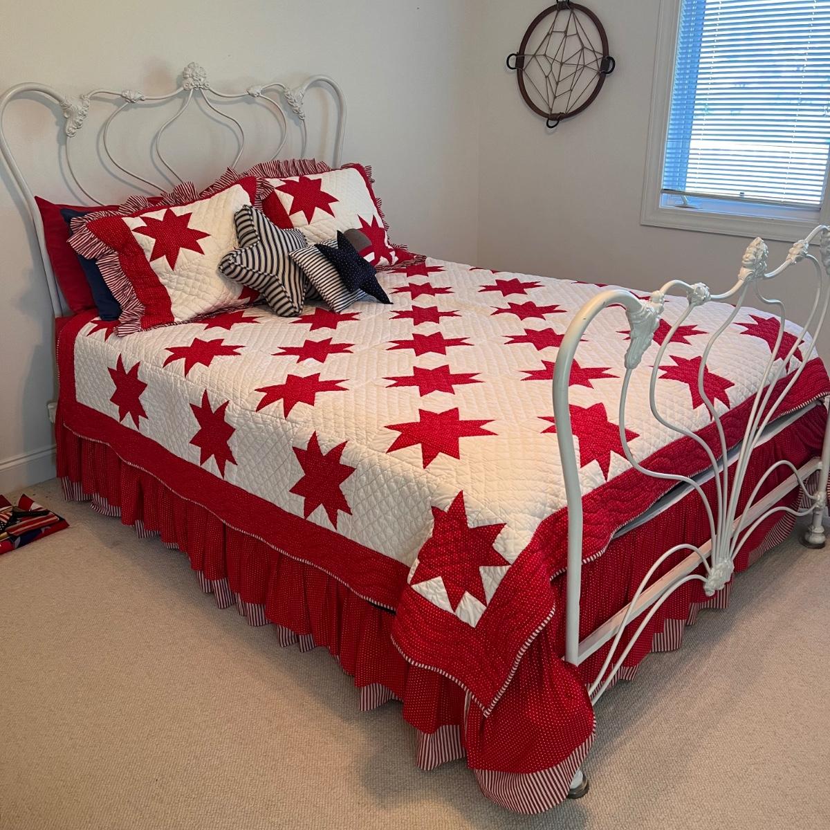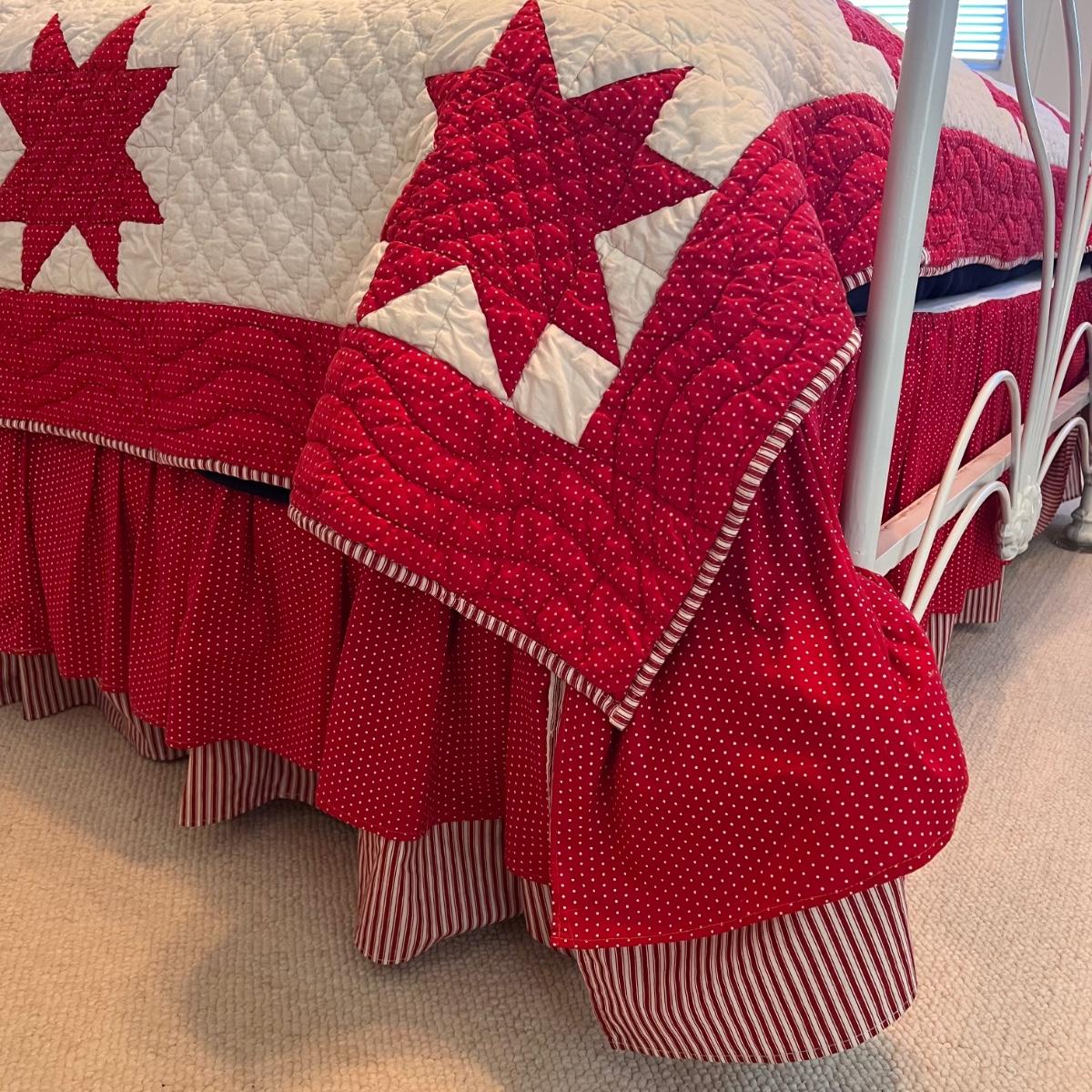 This lot includes one quilt, one bed skirt, and six decorative pillows. The quilt and bed skirt are from the "Red Star" collection by J. Clayton International. The quilt is a standard queen size and the bed skirt measures 60" x 80"H. The largest pillows measure 30" x 20"H. The bed frame and sheets shown in the photos are not included. You can find the bed frame listed in a different lot. Shipping available.