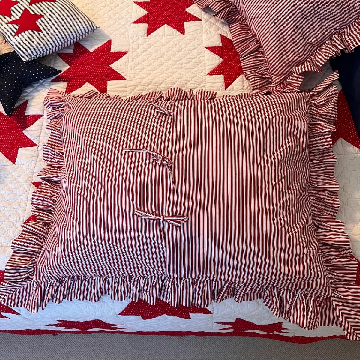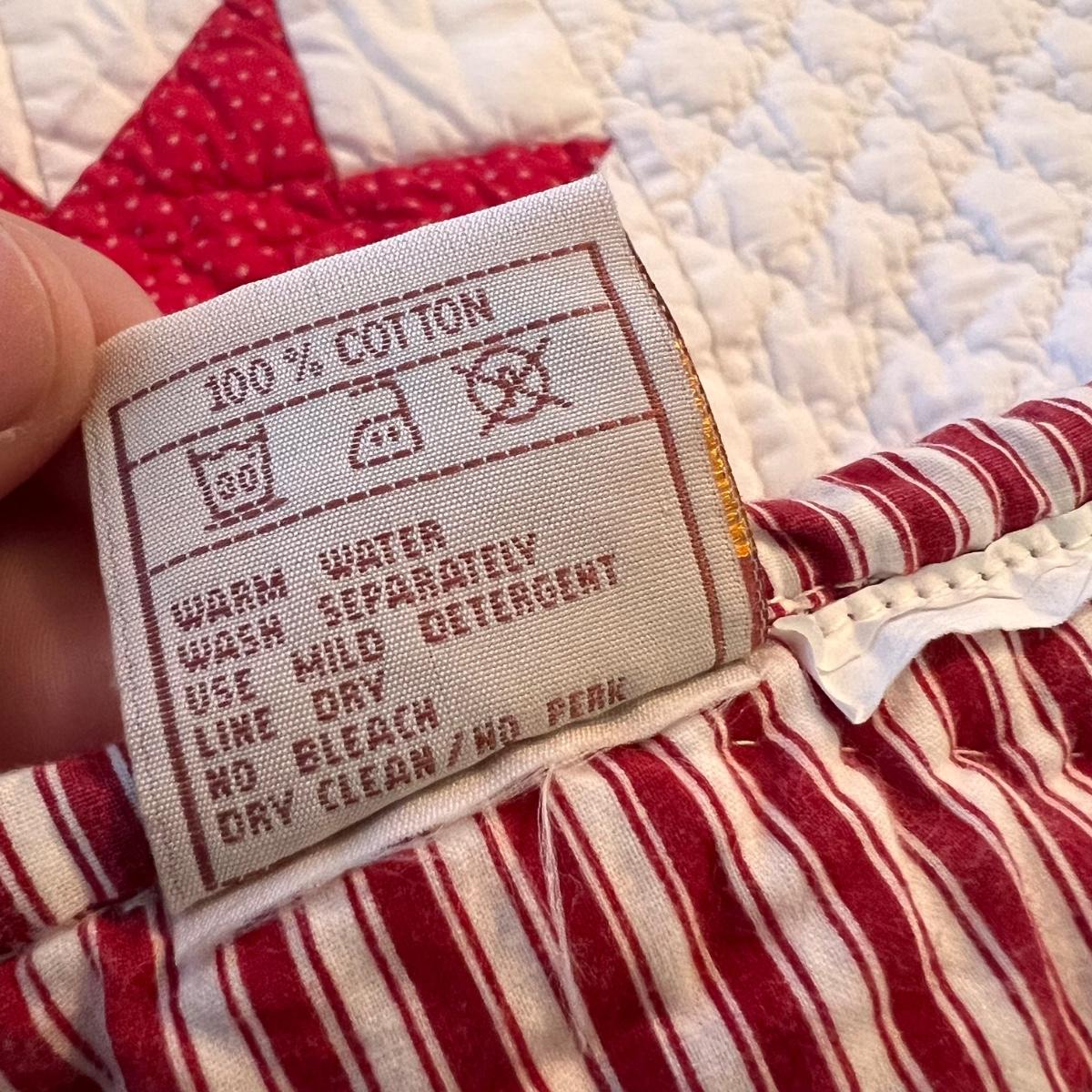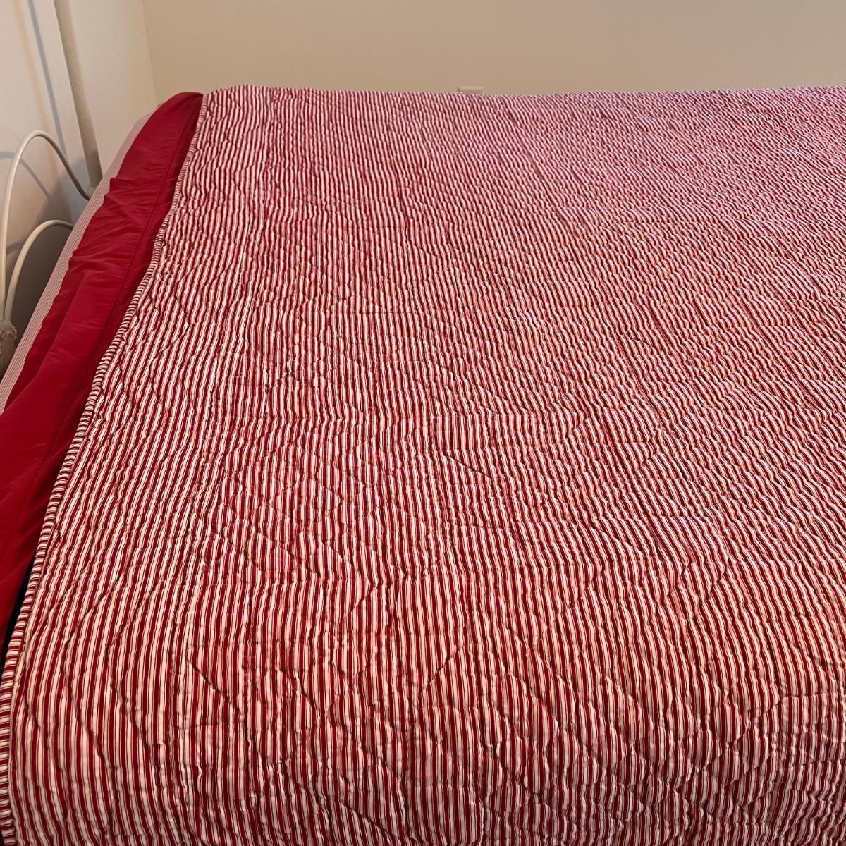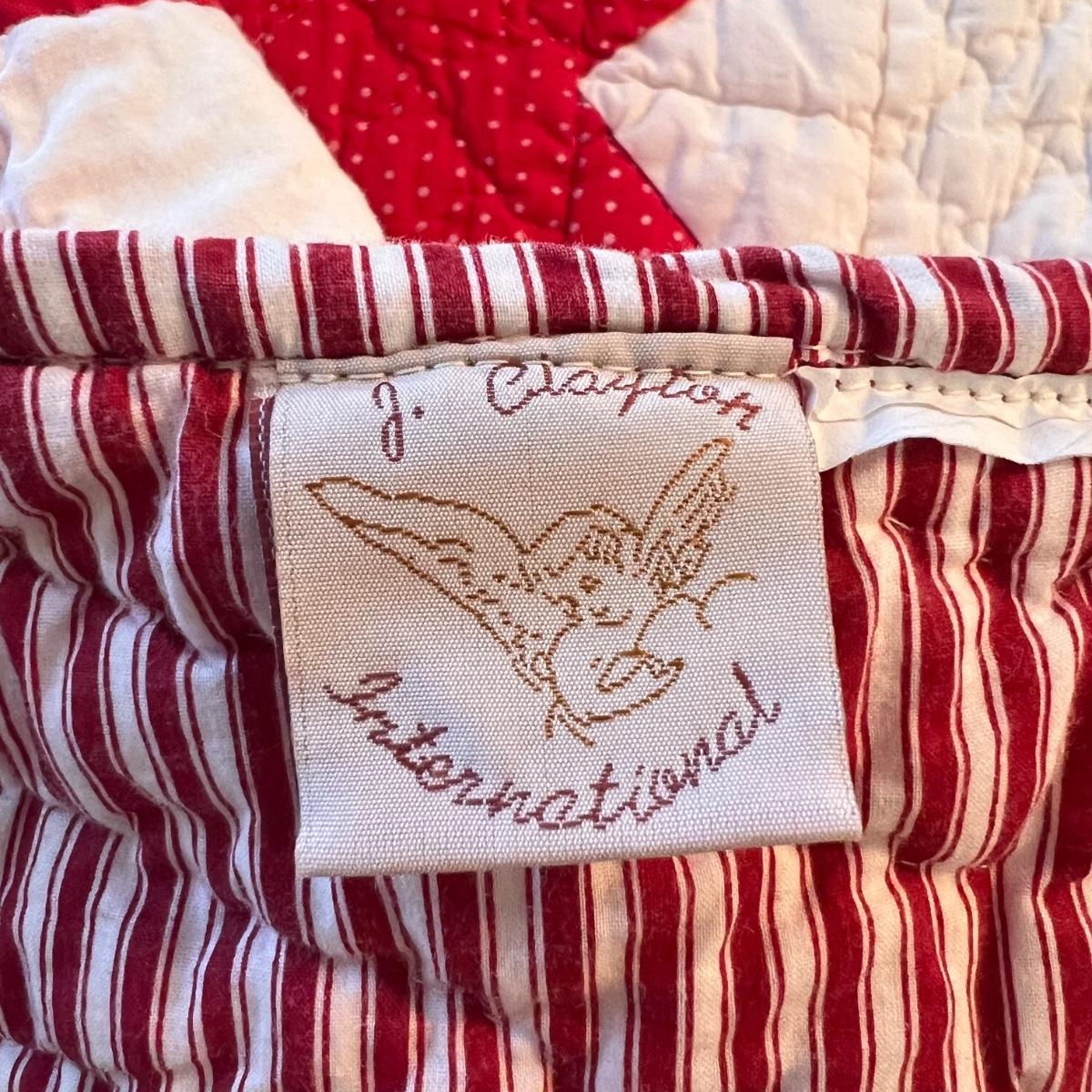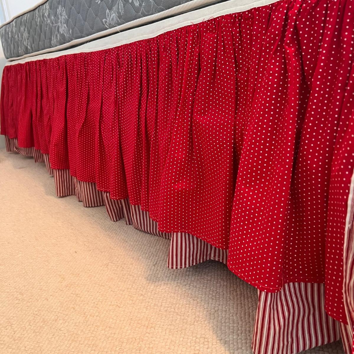 This lot includes one quilt, one bed skirt, and six decorative pillows. The quilt and bed skirt are from the "Red Star" collection by J. Clayton International. The quilt is a standard queen size and the bed skirt measures 60" x 80"H. The largest pillows measure 30" x 20"H. The bed frame and sheets shown in the photos are not included. You can find the bed frame listed in a different lot. Shipping available.