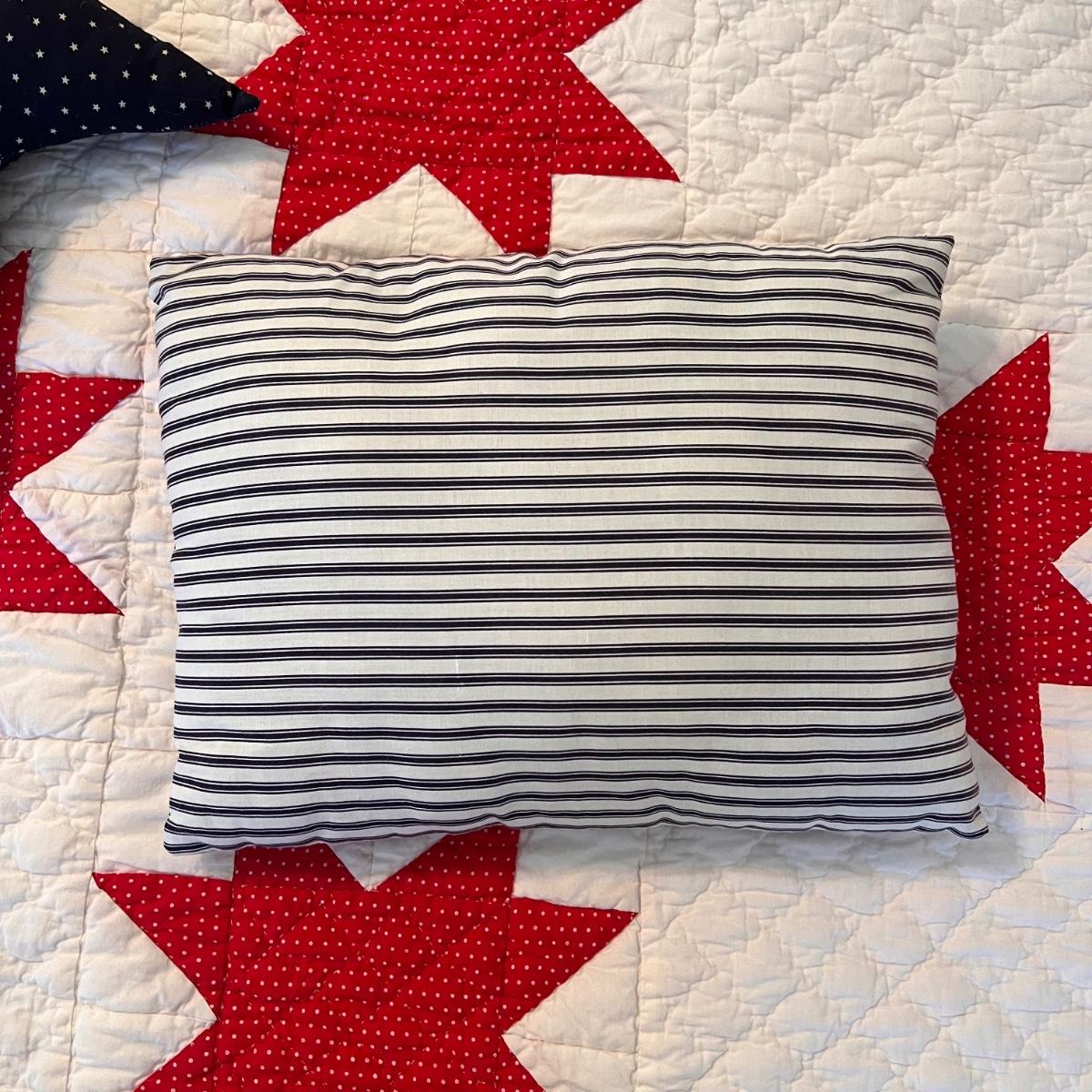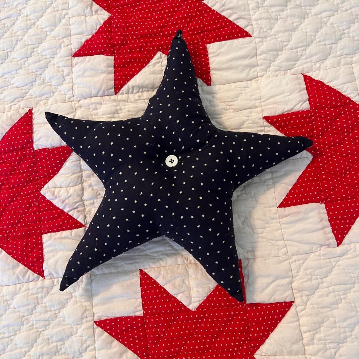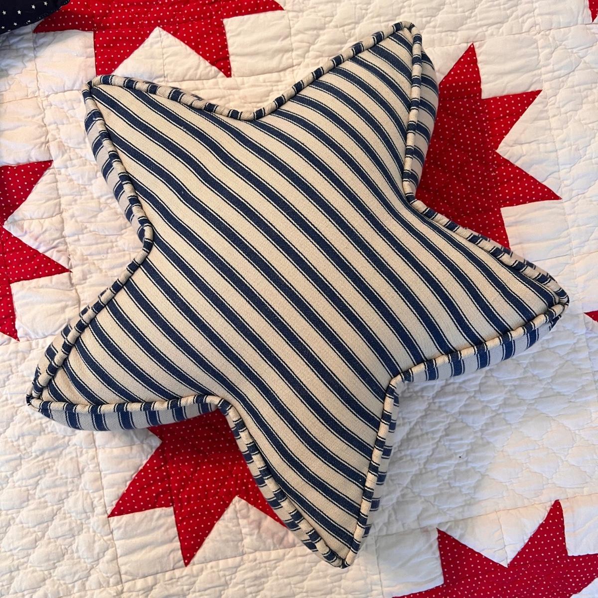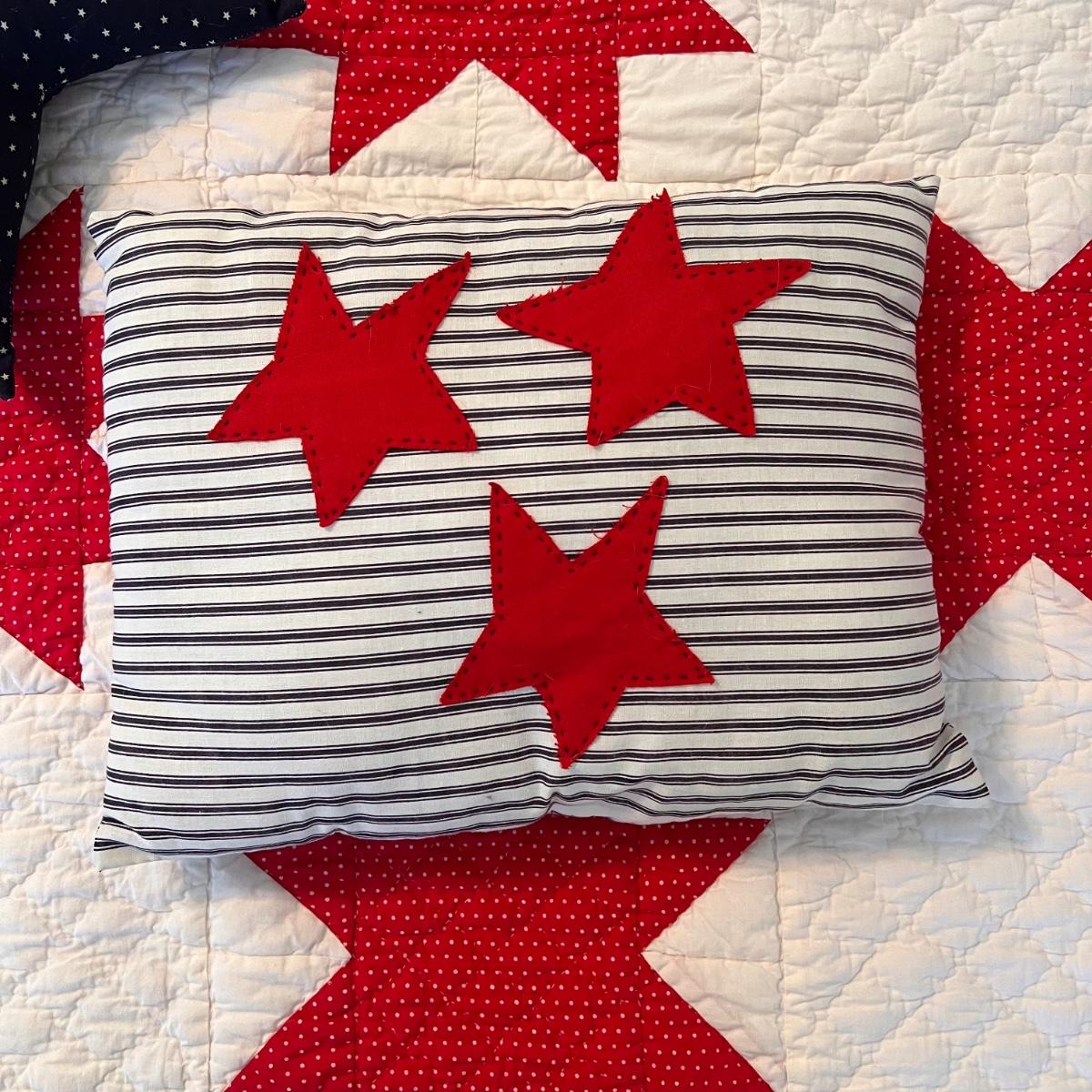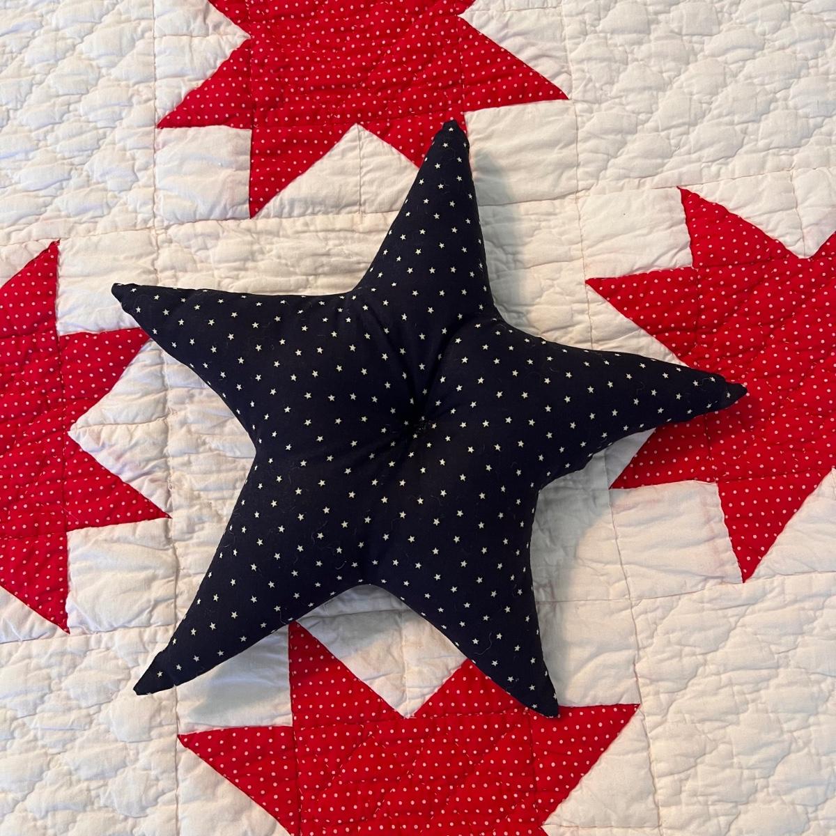 This lot includes one quilt, one bed skirt, and six decorative pillows. The quilt and bed skirt are from the "Red Star" collection by J. Clayton International. The quilt is a standard queen size and the bed skirt measures 60" x 80"H. The largest pillows measure 30" x 20"H. The bed frame and sheets shown in the photos are not included. You can find the bed frame listed in a different lot. Shipping available.