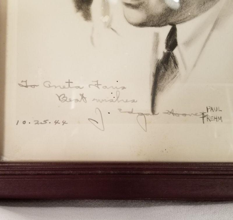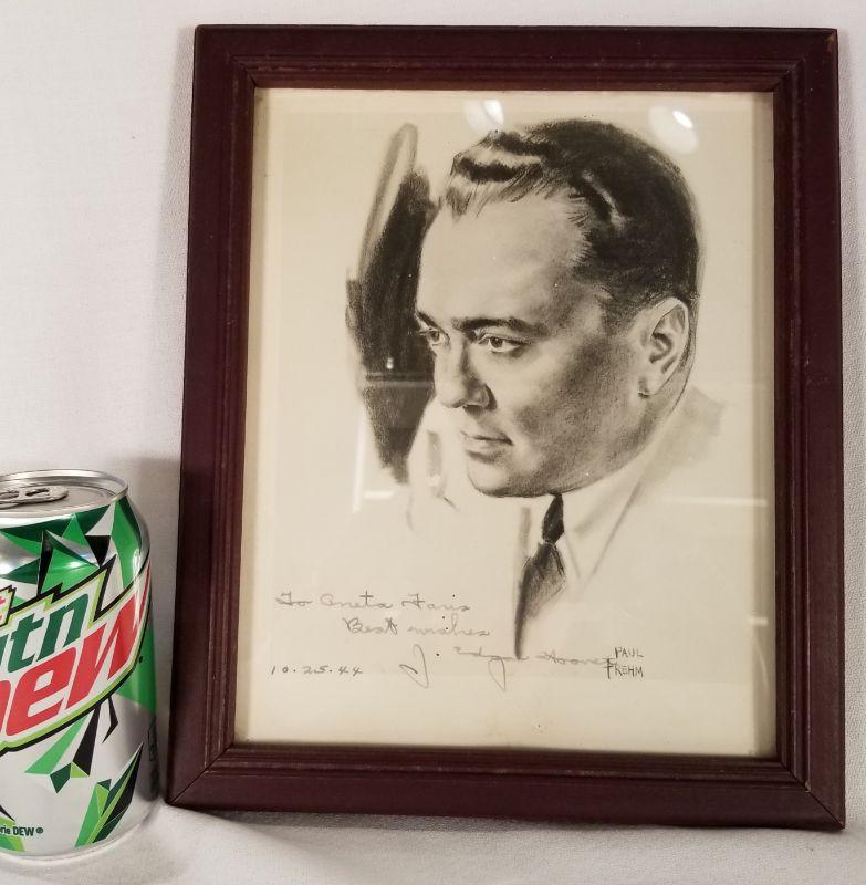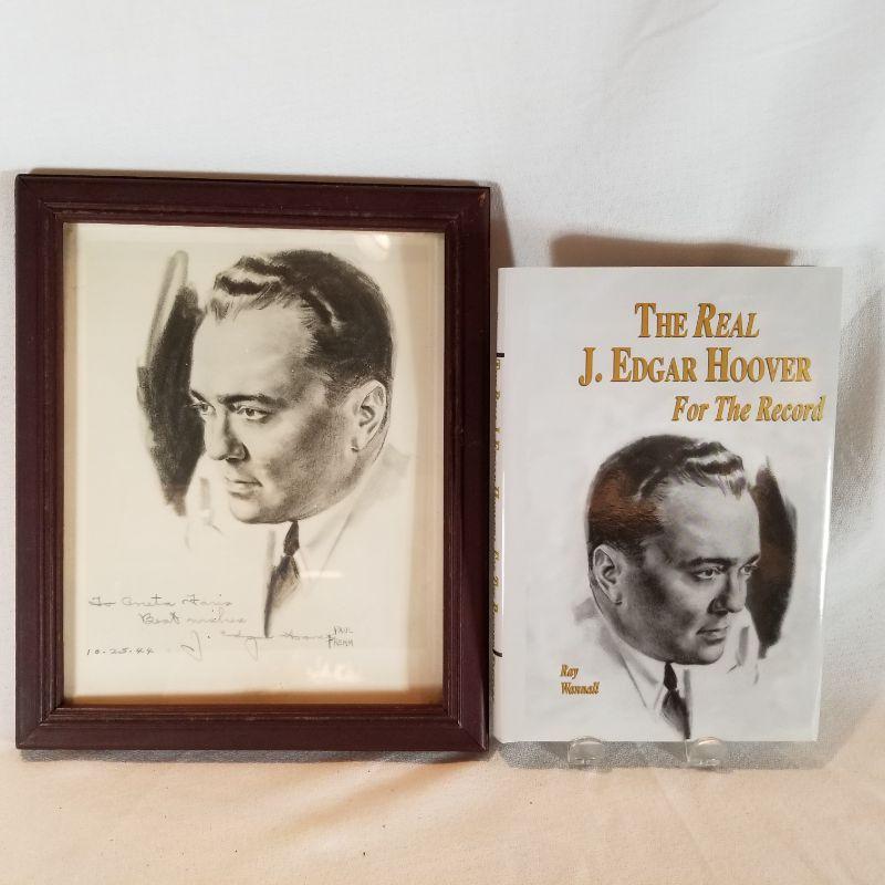 J. Edgar Hoover Autographed Print. Wood-framed 8 X 10 print of a J. Edgar Hoover portrait drawn by Paul Frehm. Given to Aneta Faris of Clarksville, IN and dated in his own hand on 10-25-1944. Print has slight damage but overall is very good. BONUS: A First-Edition Book: "The Real J. Edgar Hoover - For the Record" by Ray Wannall, Printed in 2000 by Turner Publishing Company - Paducah, KY. Appears to never have been read. Like New. Great collectible for the law & order fan in your circle of friends.