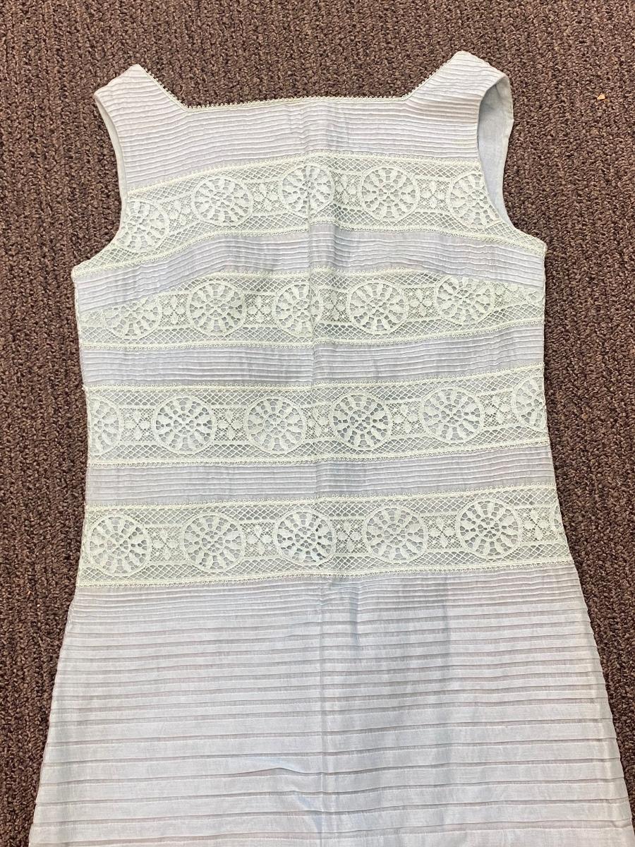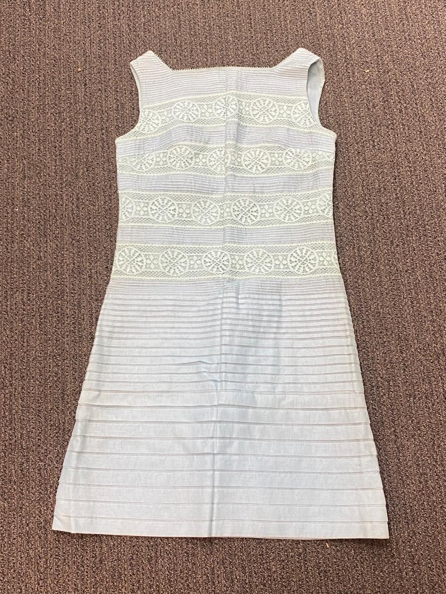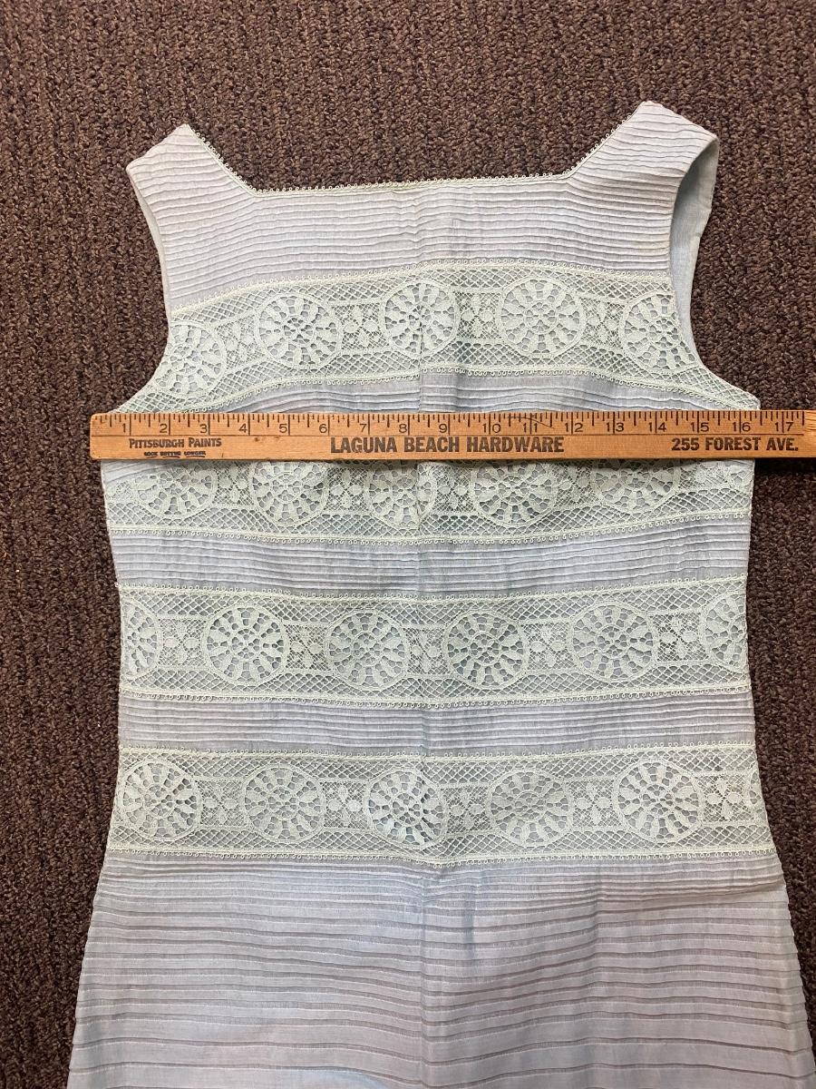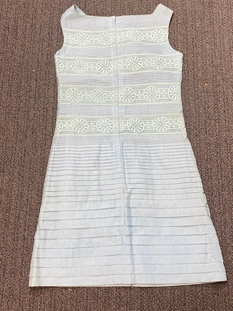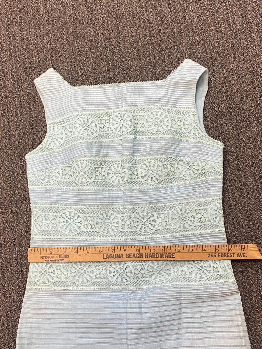 Vintage Pale Turquoise Robin Egg Blue Zipper Back Summer Spring Sheath Dress. In good condition. No holes but there is a small faint spot on back below the butt. May have light discolor from age and storage. No size tag measures 16" about waist, and 17 at armpit. Knee length.
