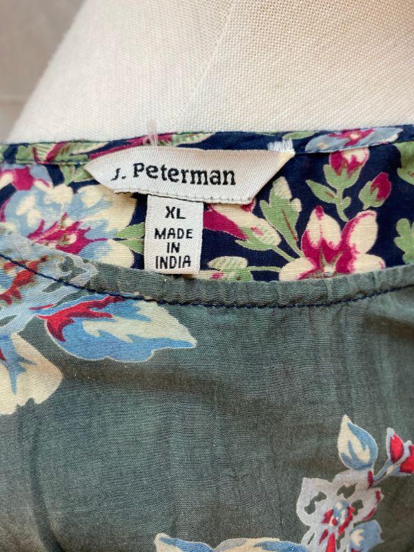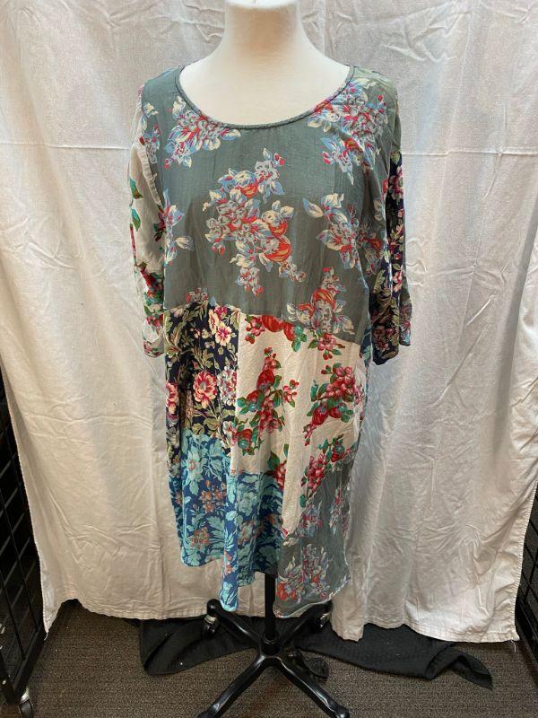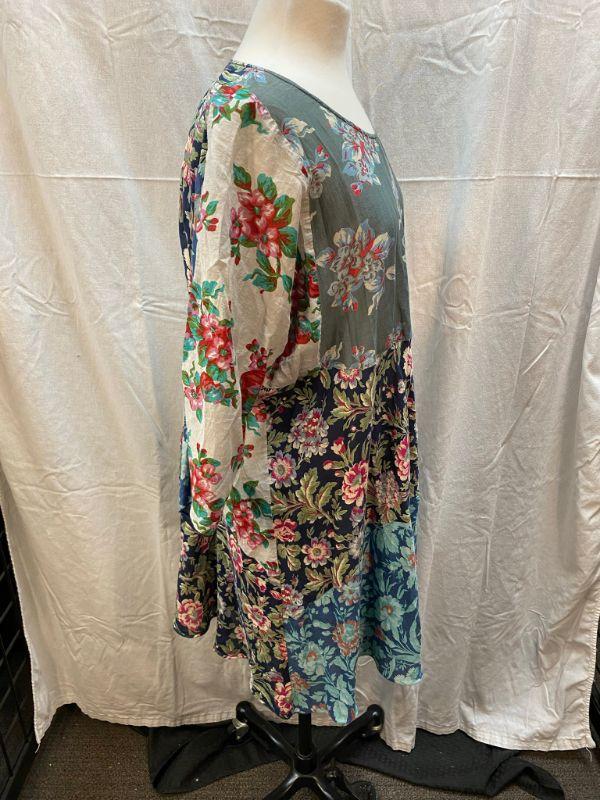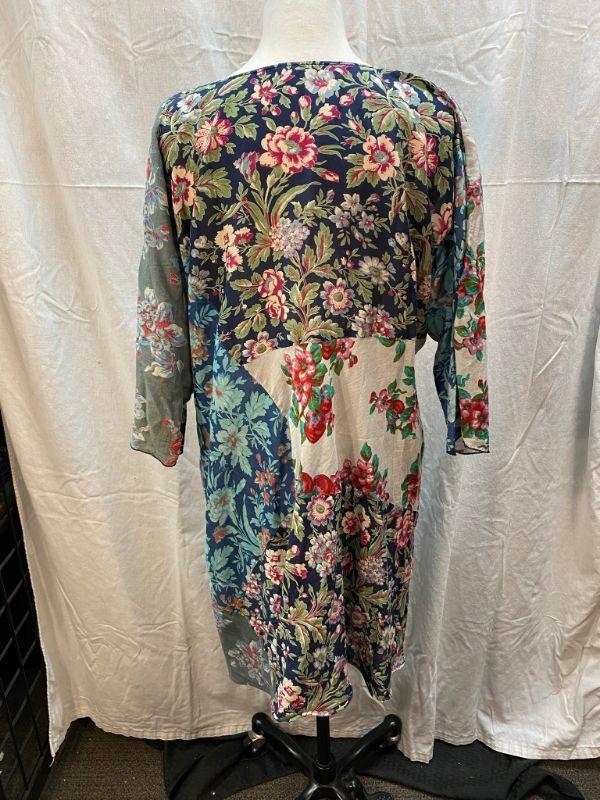 J. Peterman floral patchwork print dress. Short sleeve, knee length. Good alone or with leggings. Many style possibilities. Size XL. Good condition.